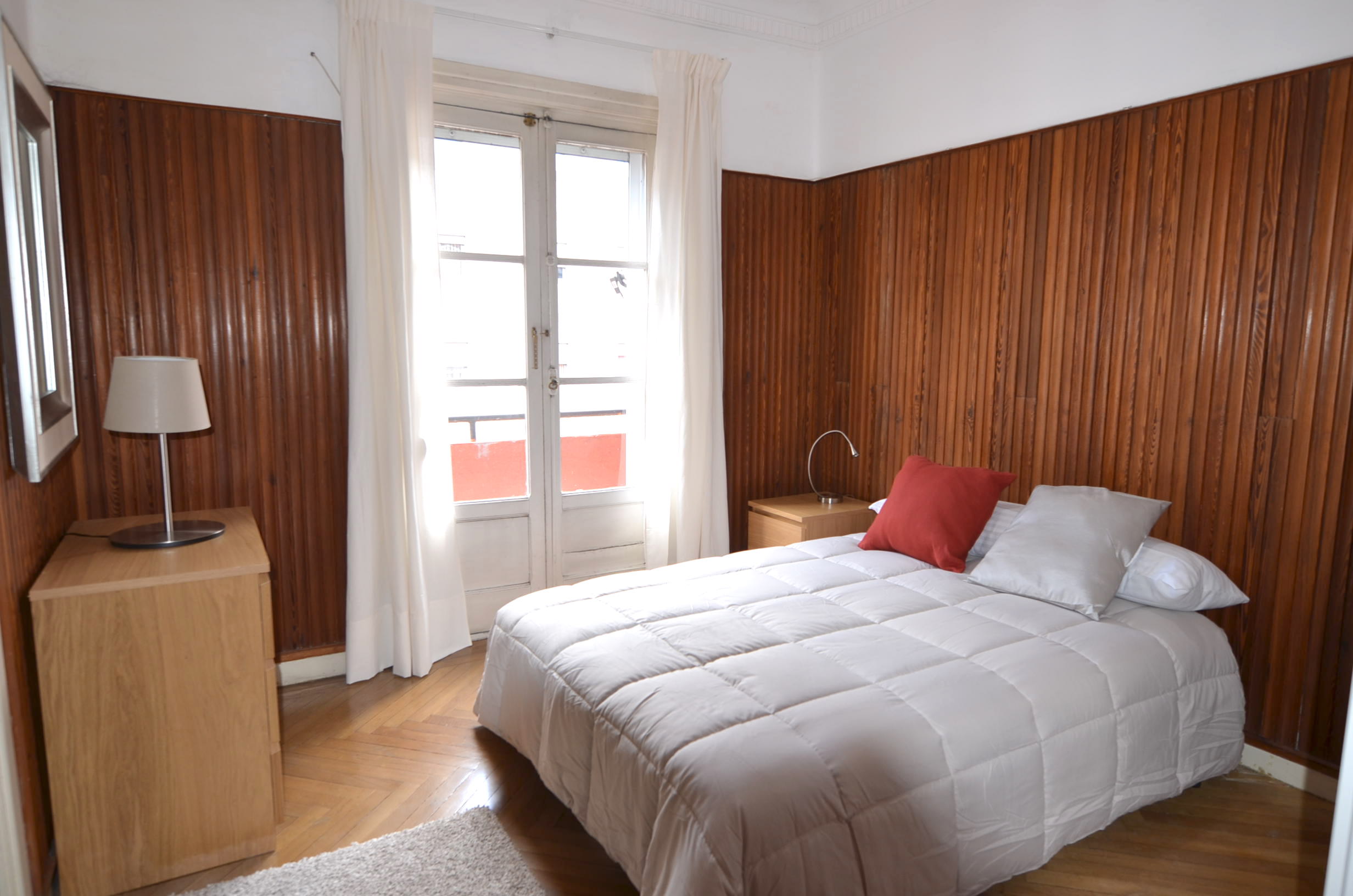 Dispone de un salón con cocina americana de 25m2, donde se situa la zona de estudio, con escritorio de 120 x 75 y silla ergonómica. La habitación tiene un amplio armario con cama doble. Tiene un baño completo con bañera.