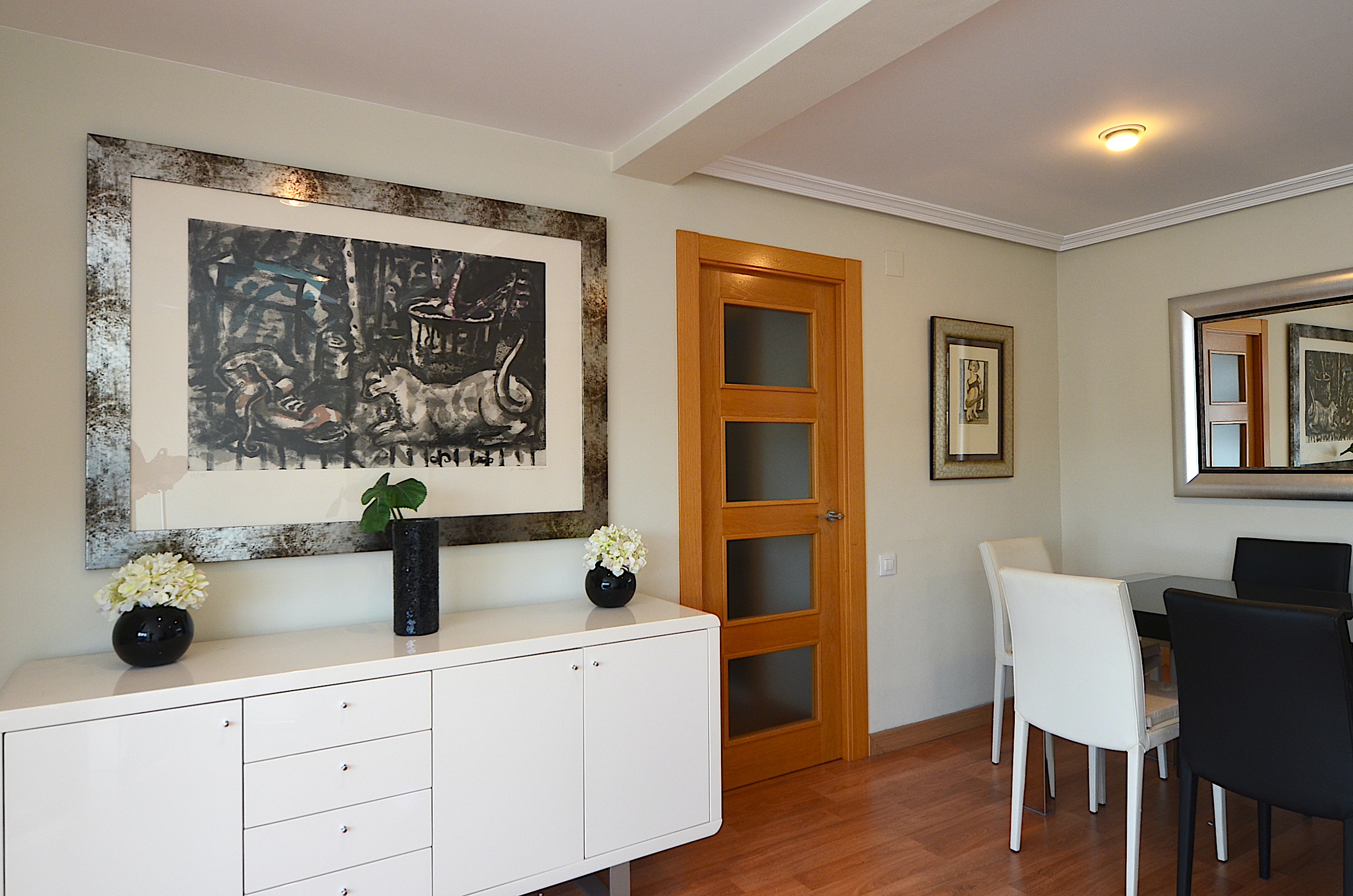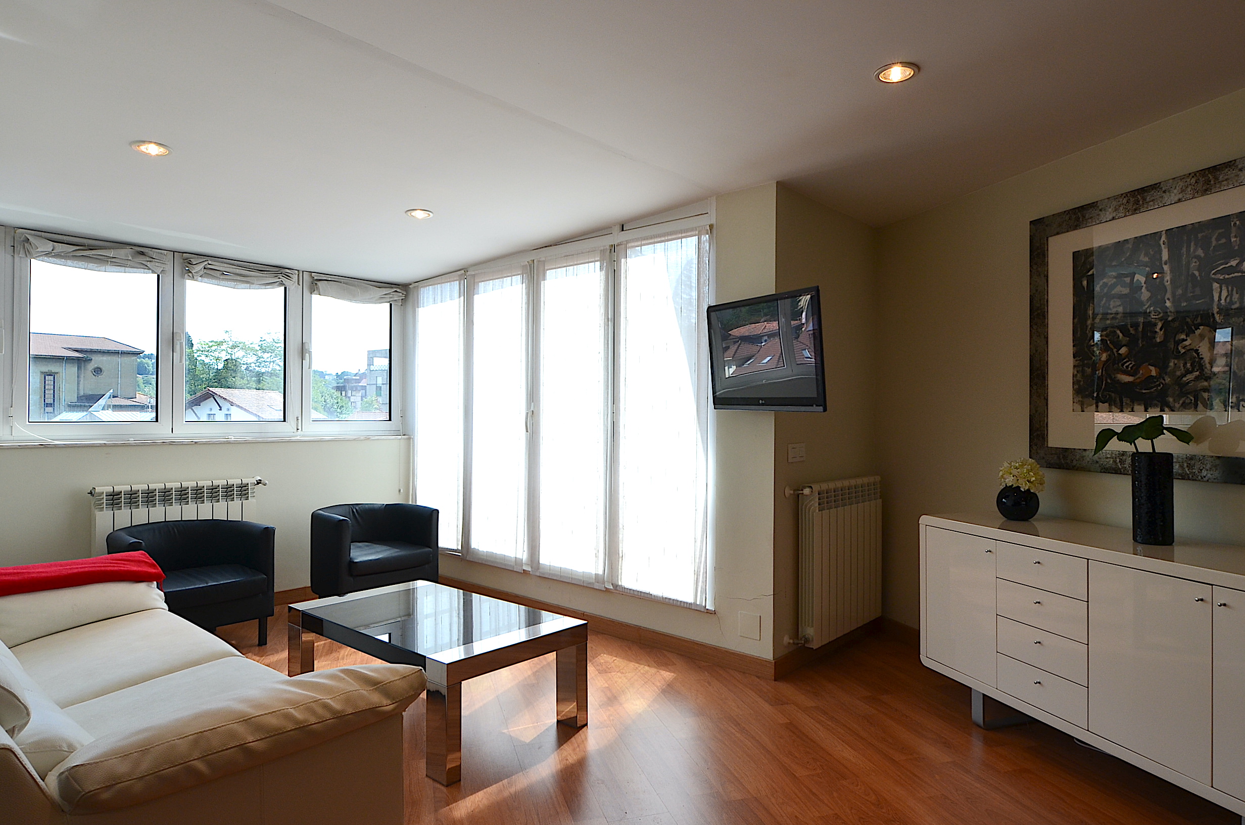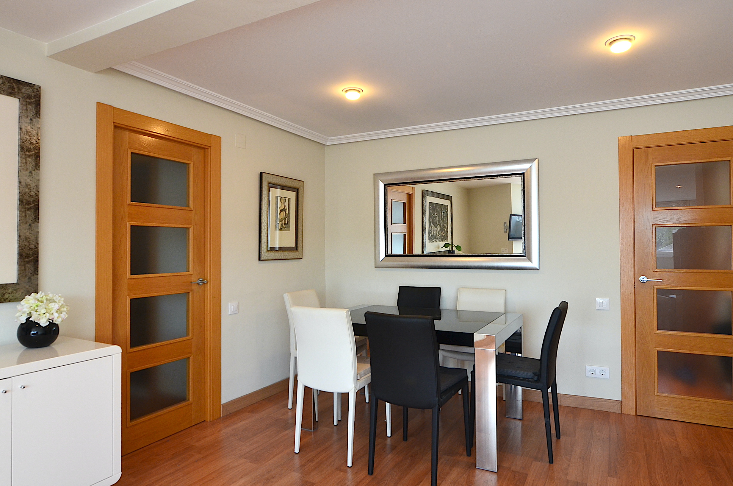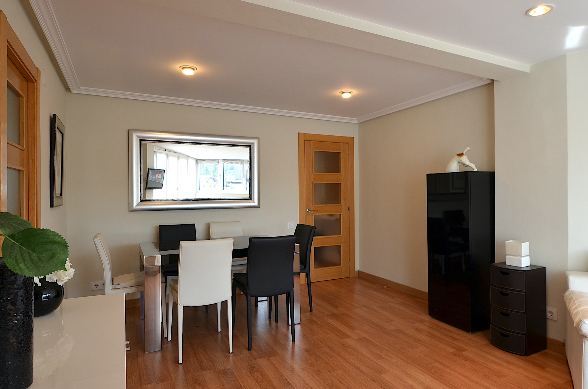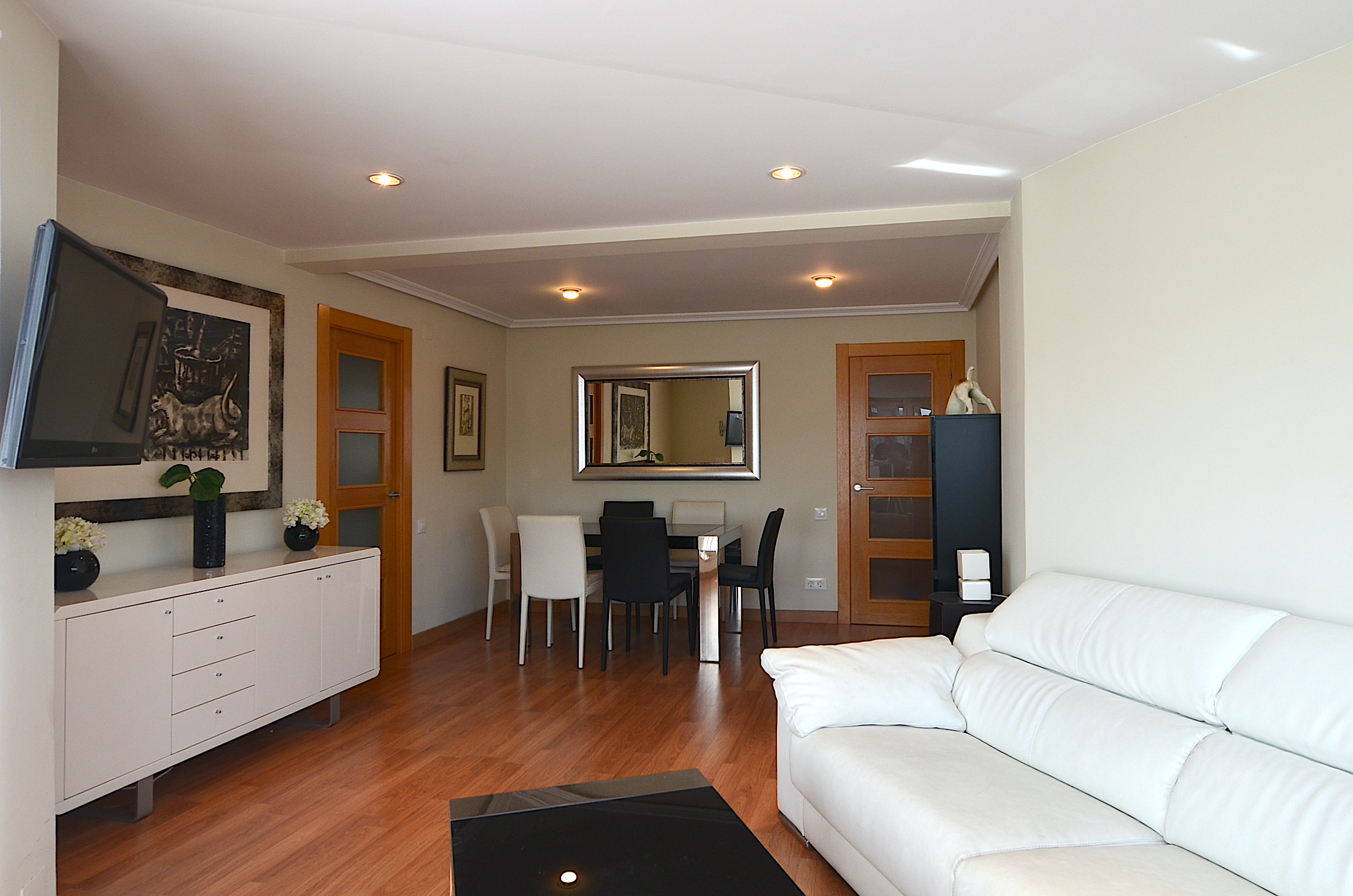 Gran salón comedor con tv plana y acceso a la terraza.