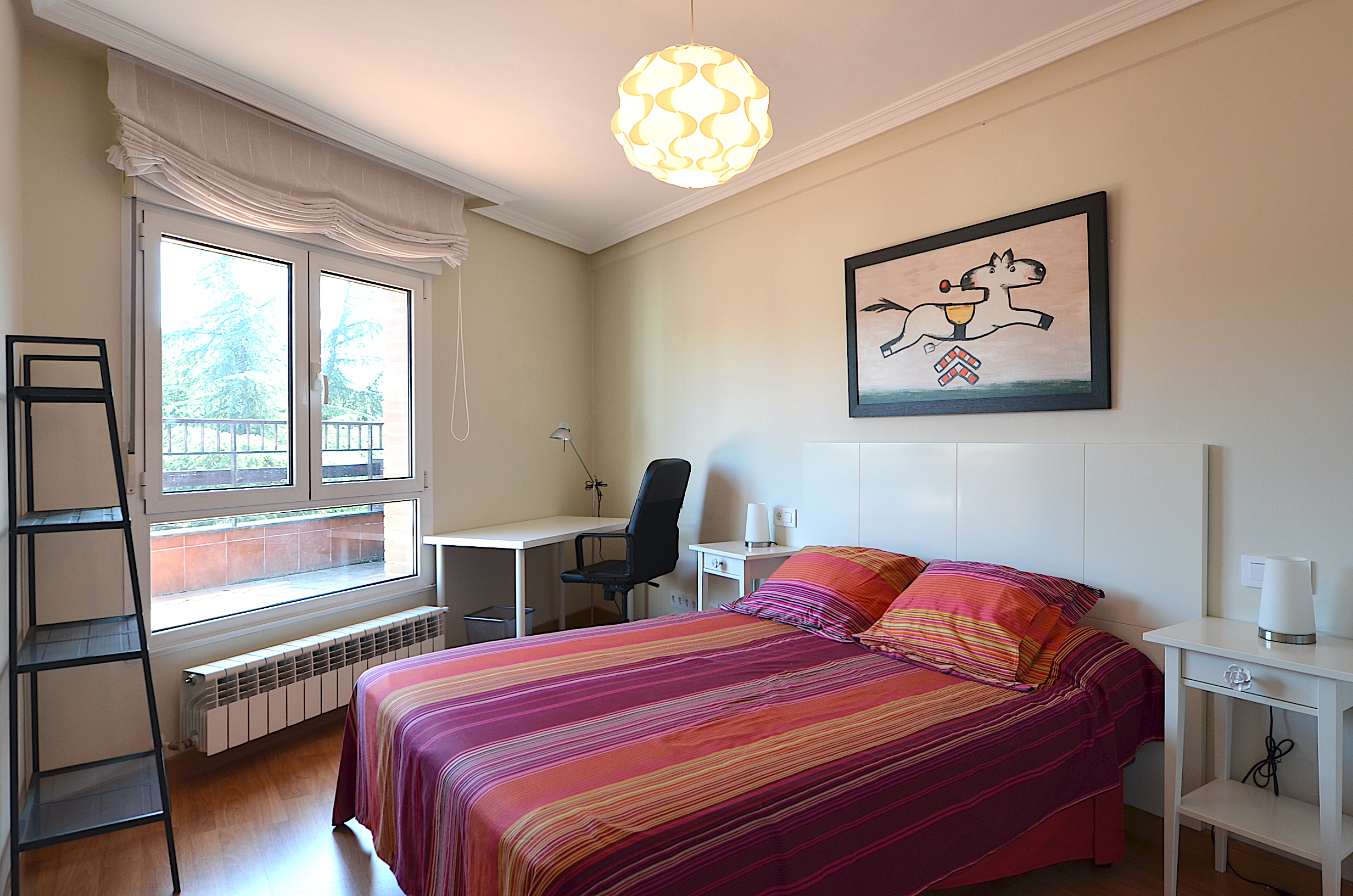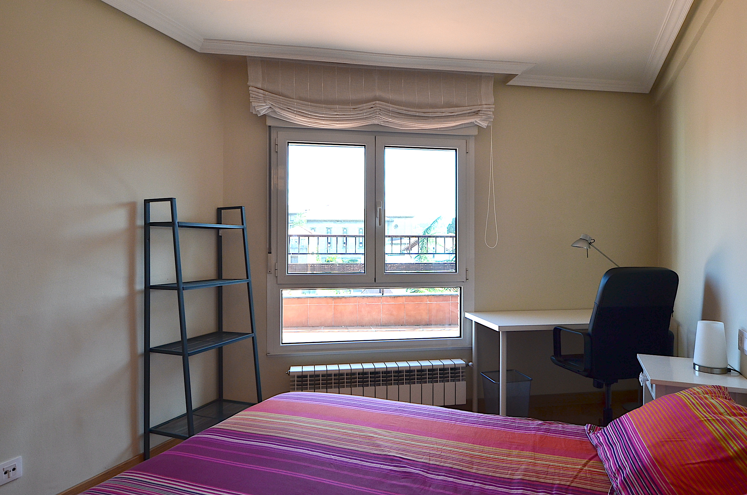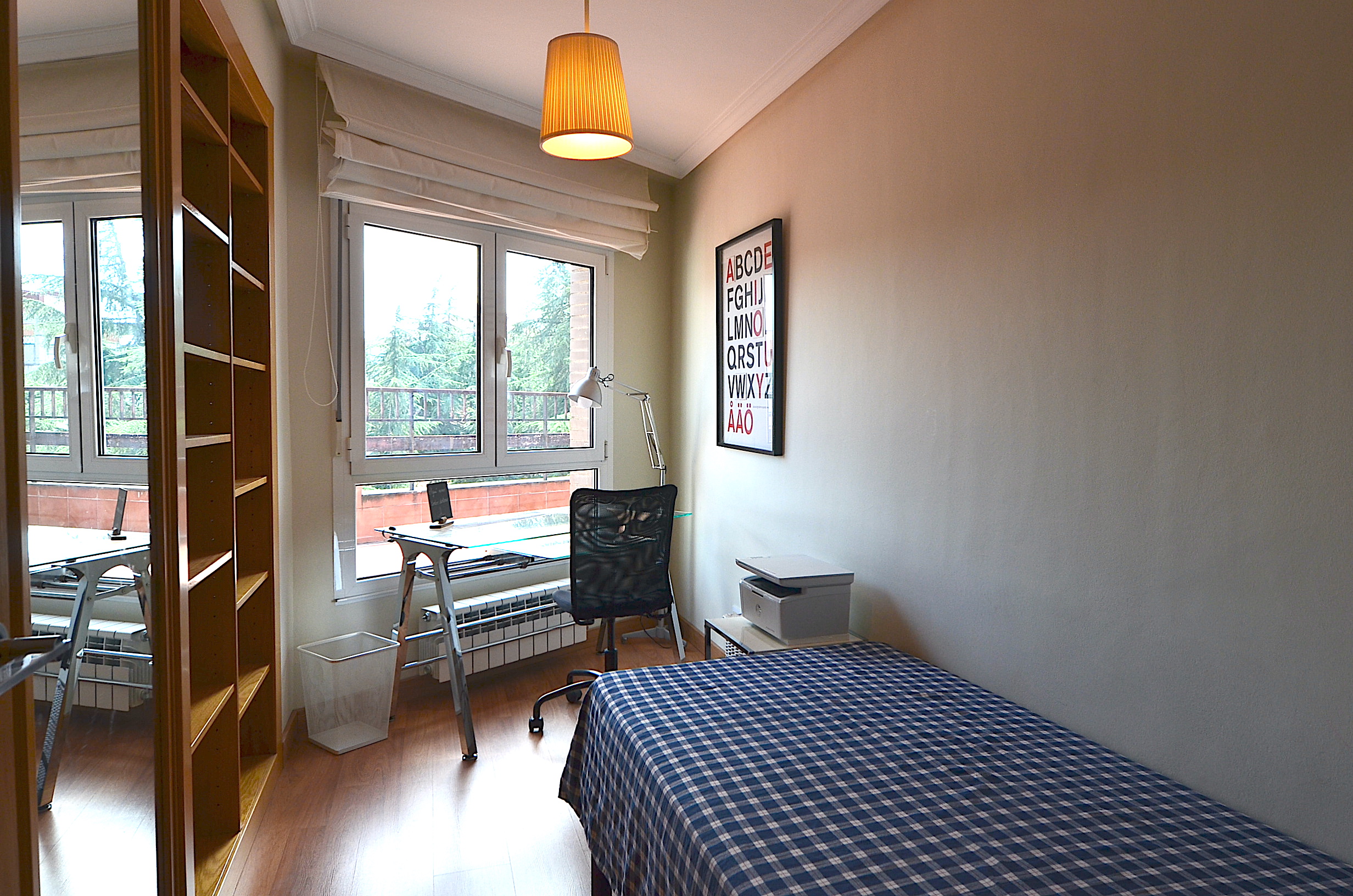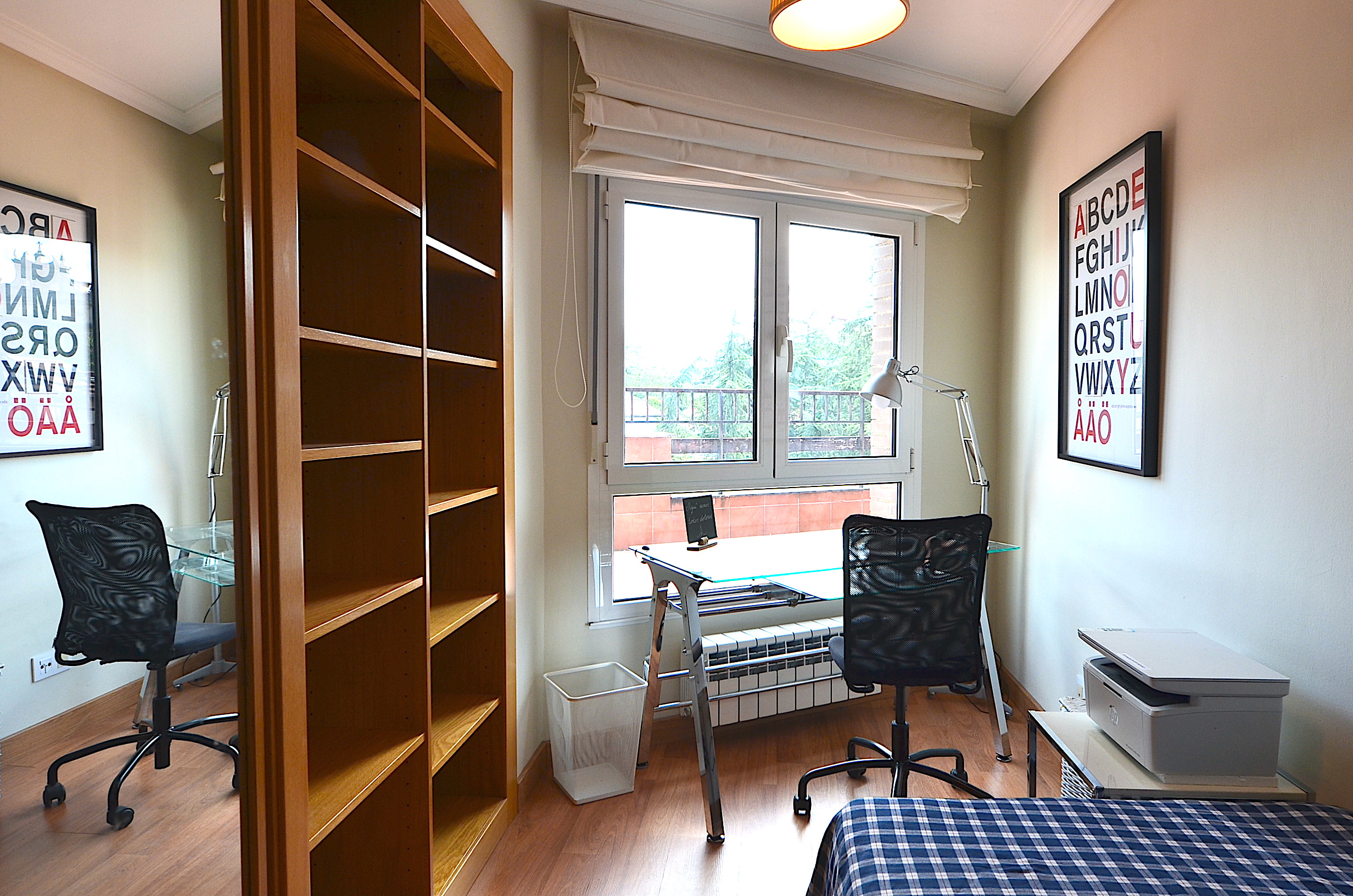 Todas las habitaciones cuentan con mesa de estudio, silla ergonomica, estanteria, flexo, corcho y papelera.