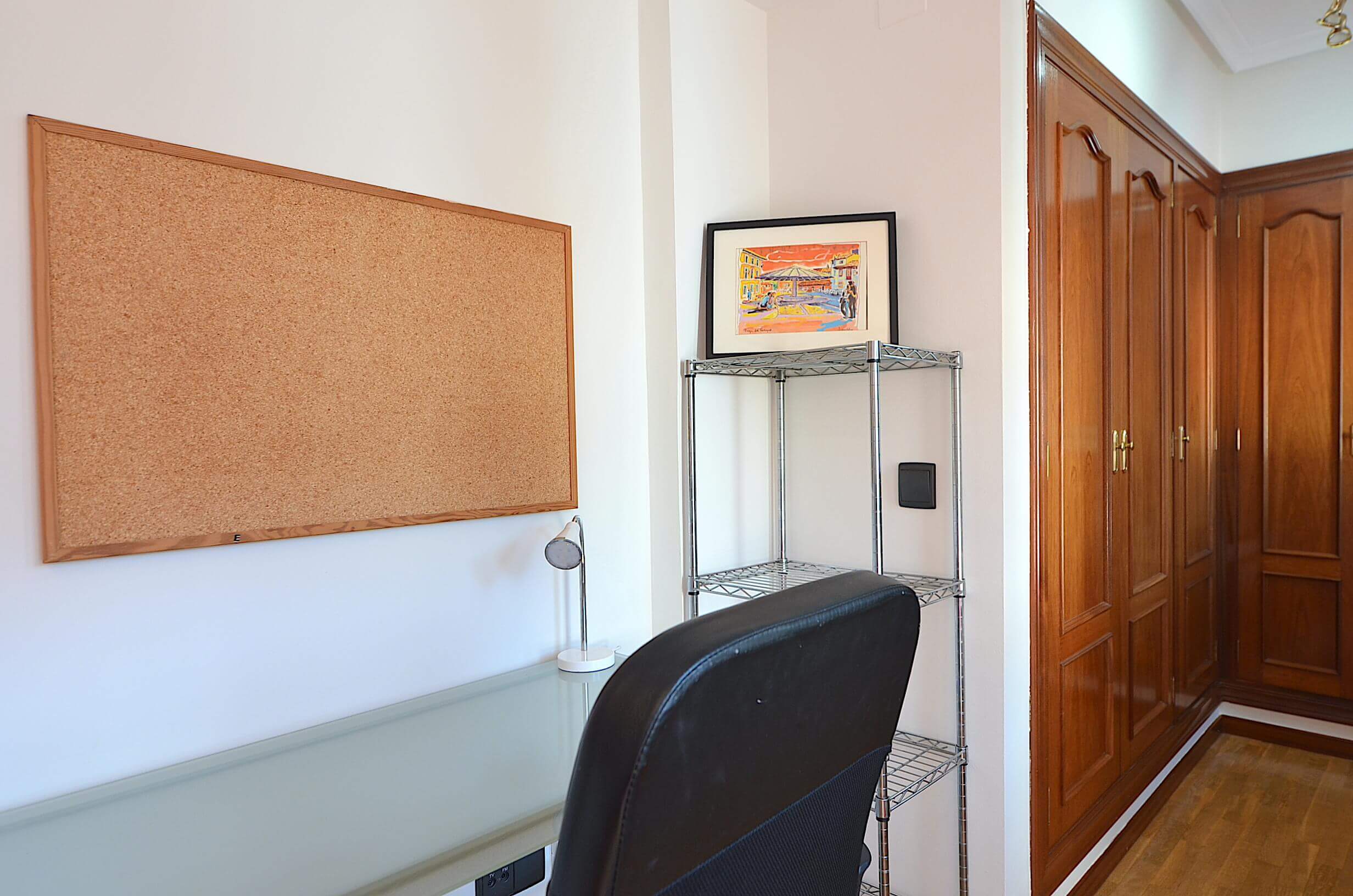 Habitaciones perfectamente preparadas para el estudio, mesa grande, silla ergonomica, estanteria, flexo, corcho, papelera…