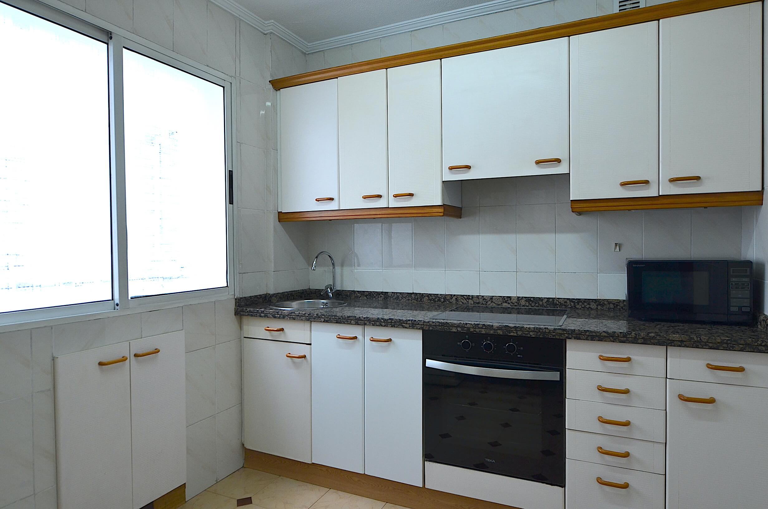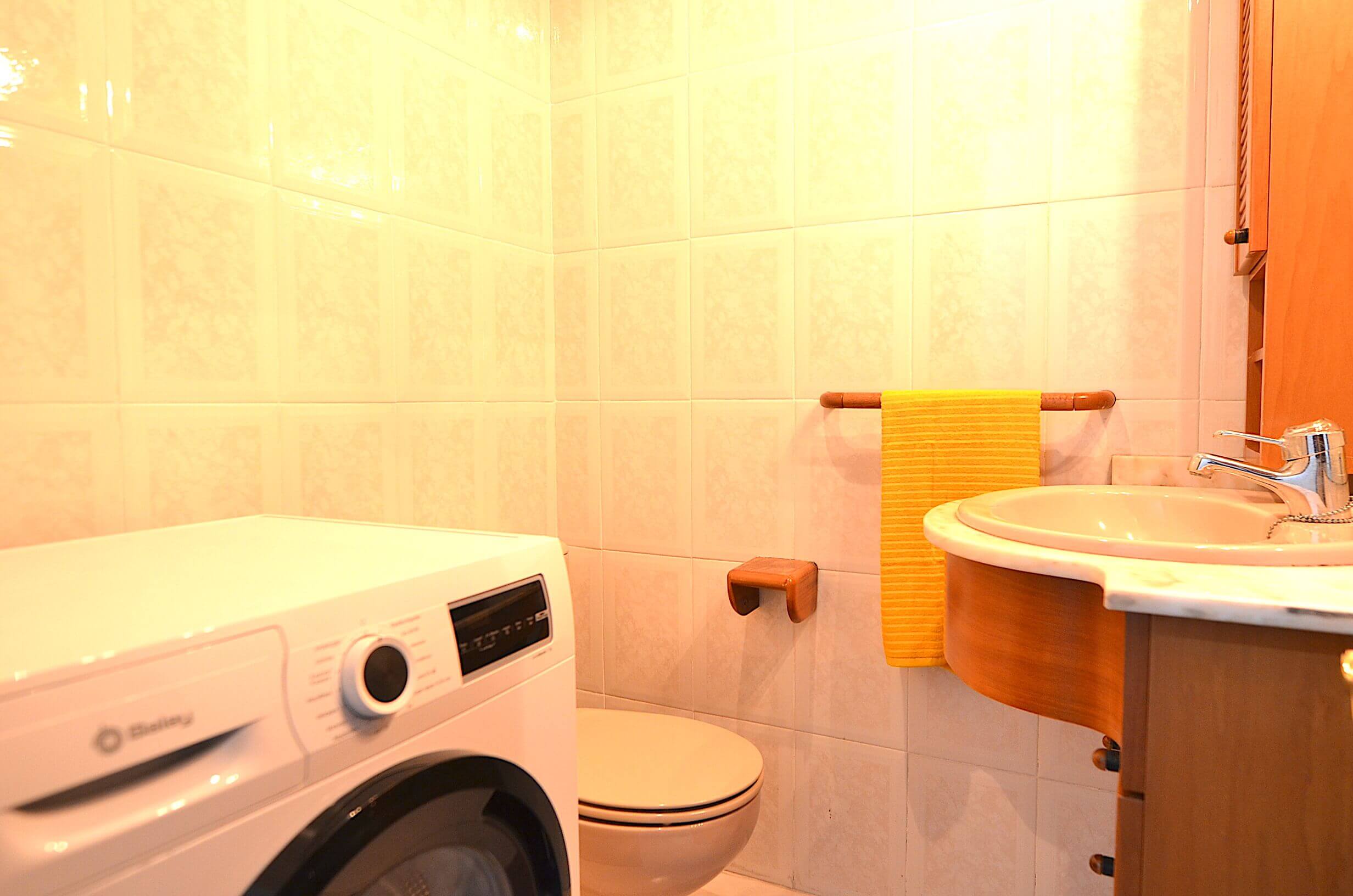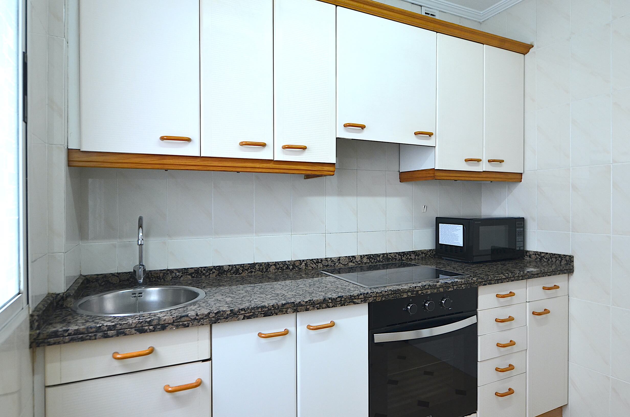 Cocina equipada con horno, vitro-ceramica, microondas, nevera, cafetera y tostador. Un cuarto de baño completo con bañera y un aseo con lavadora.