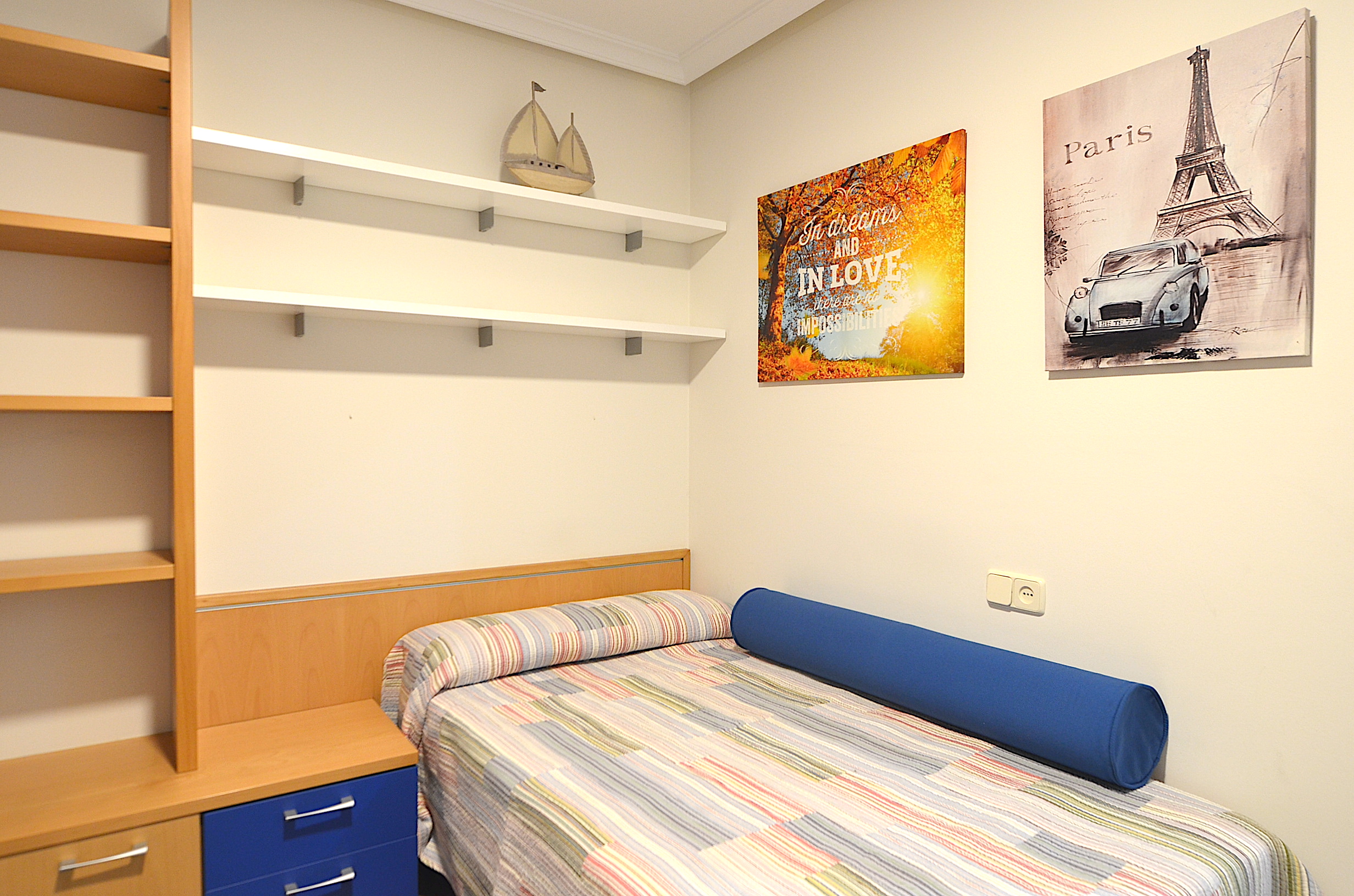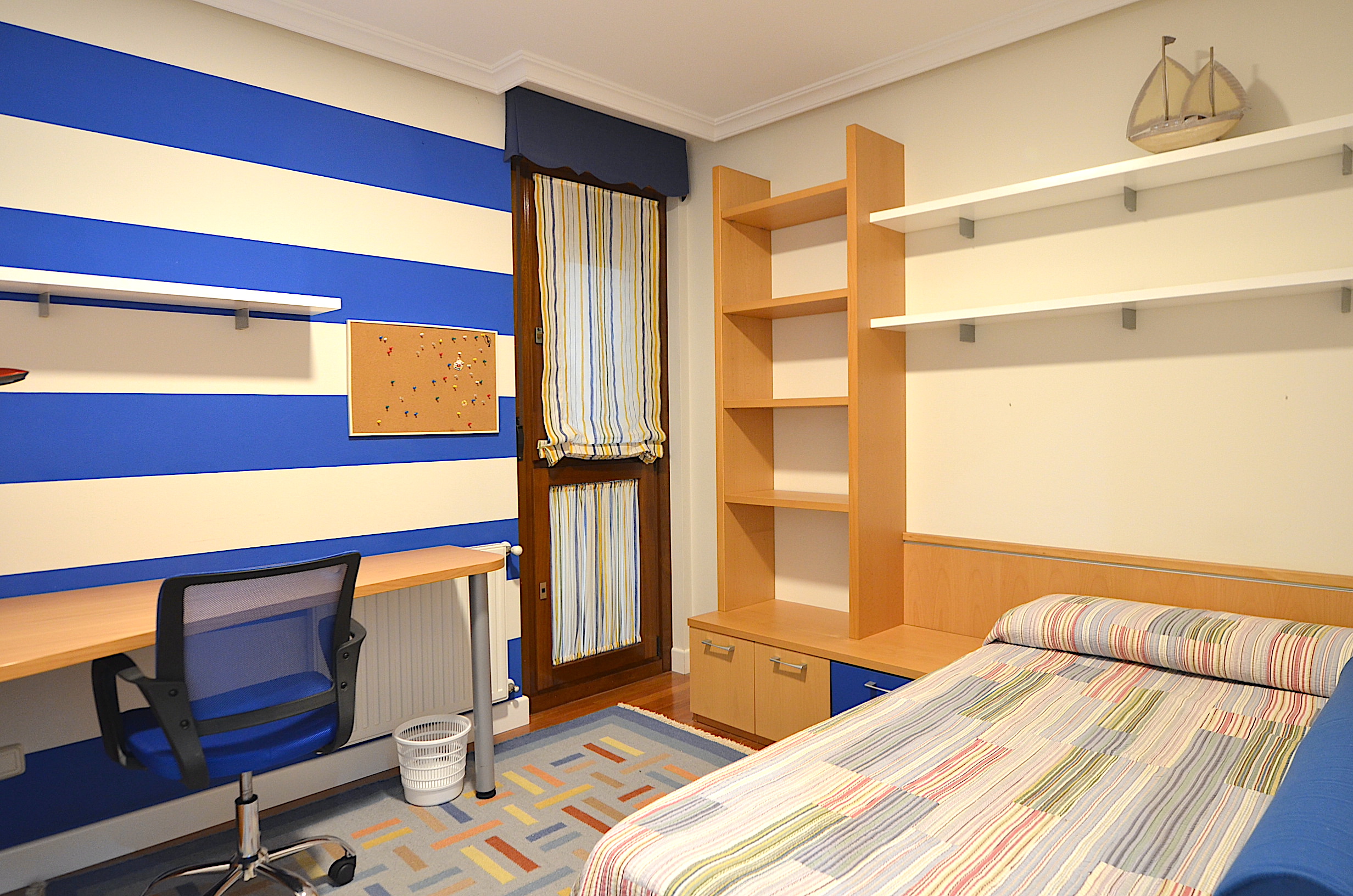 Mesa de estudio, silla ergonómica, estanteria, corcho, papelera y flexo en ambas habitaciones.