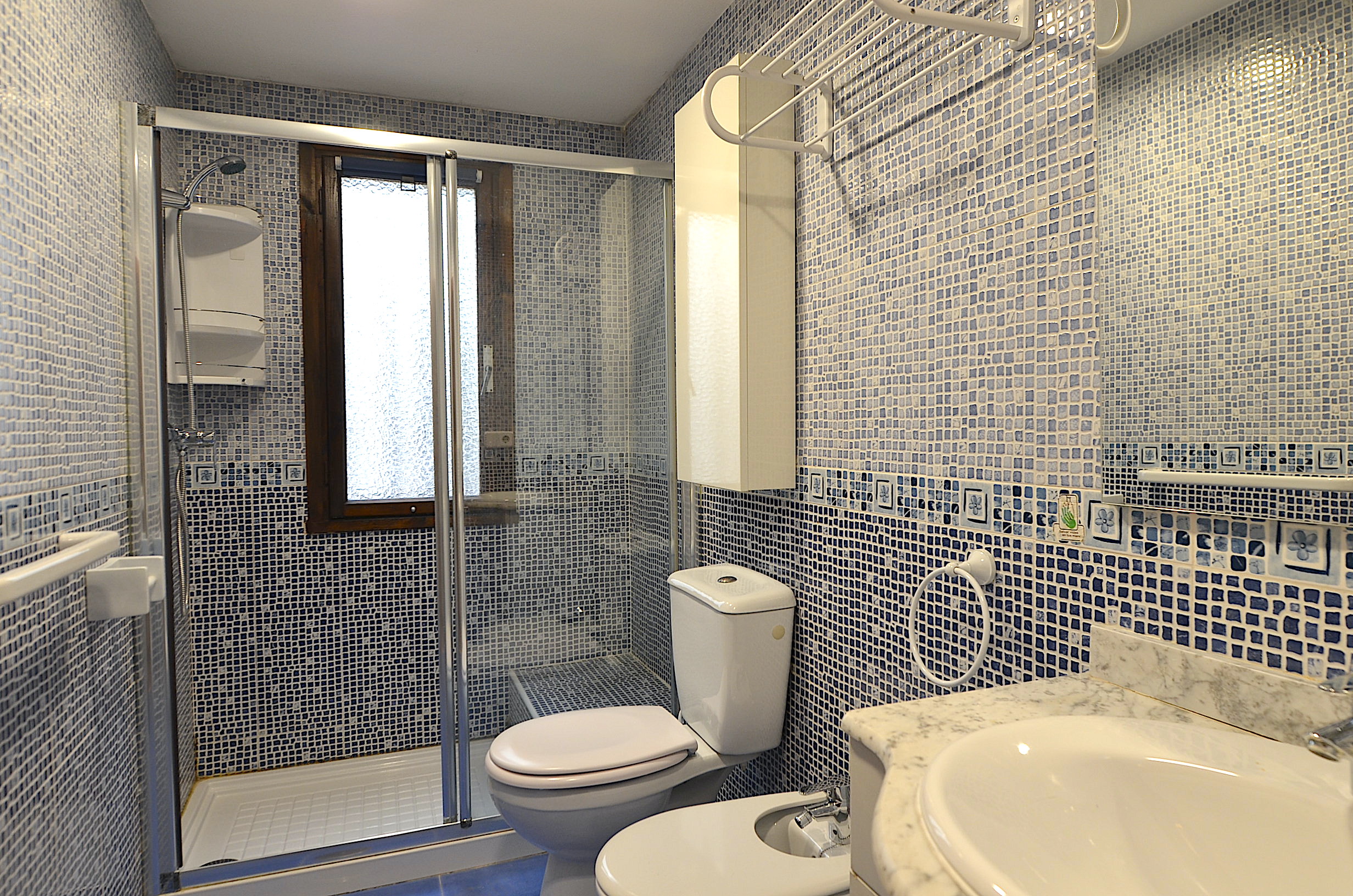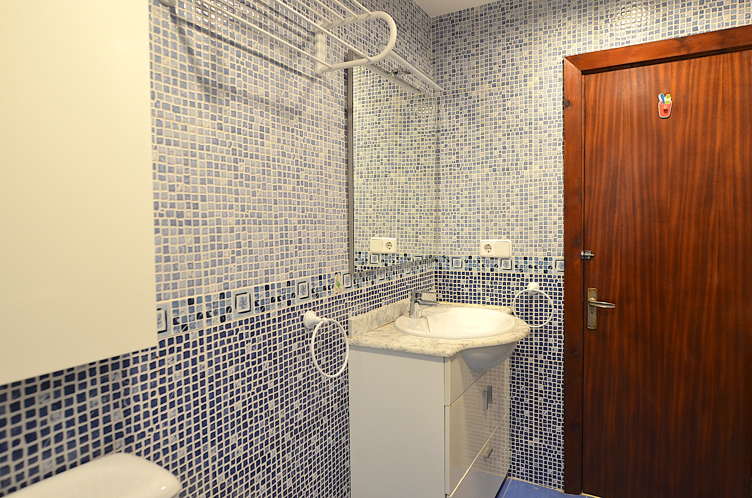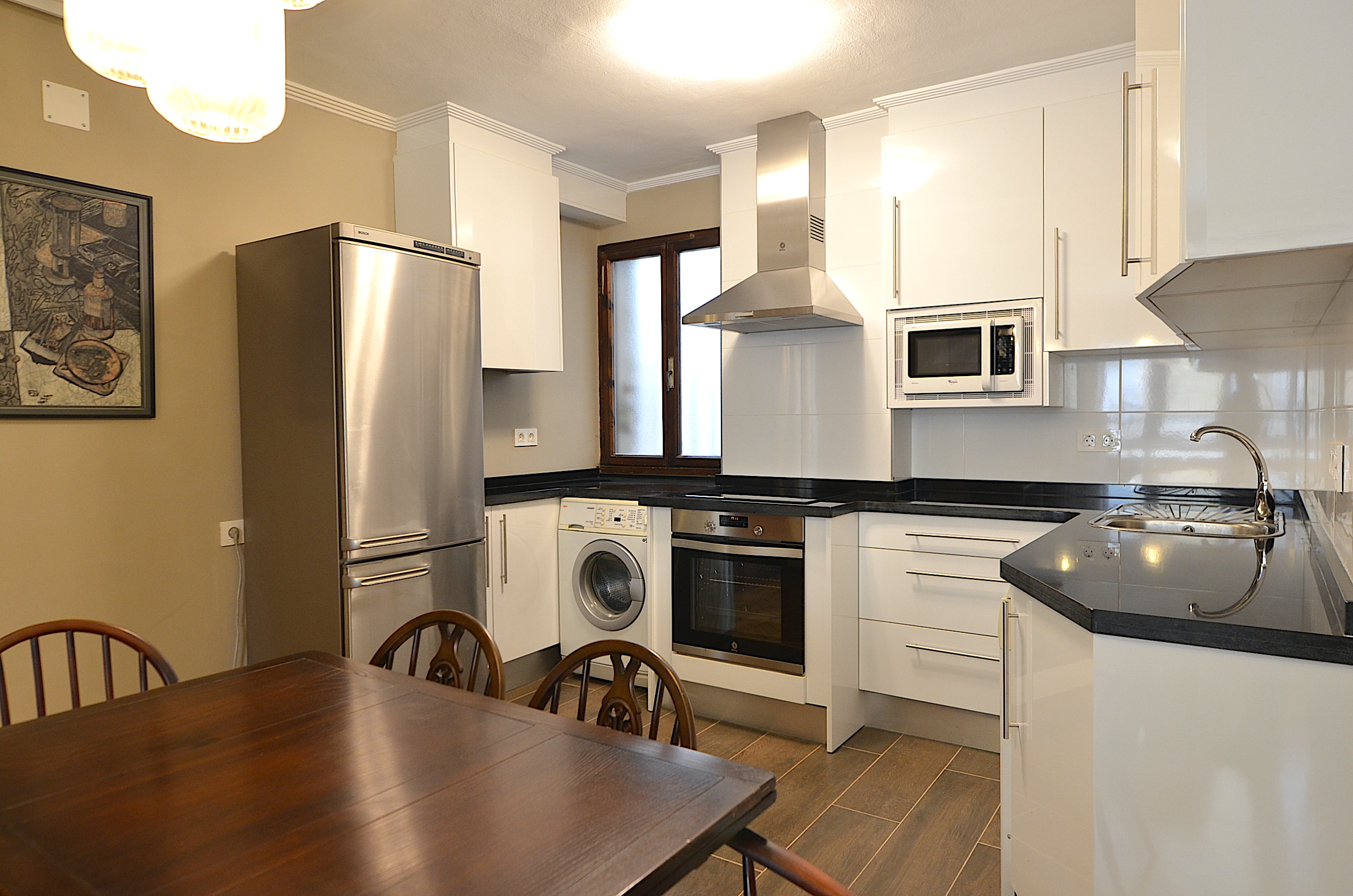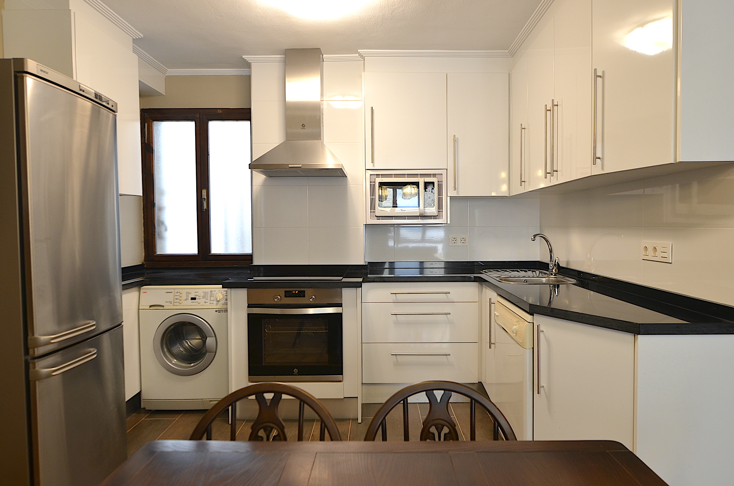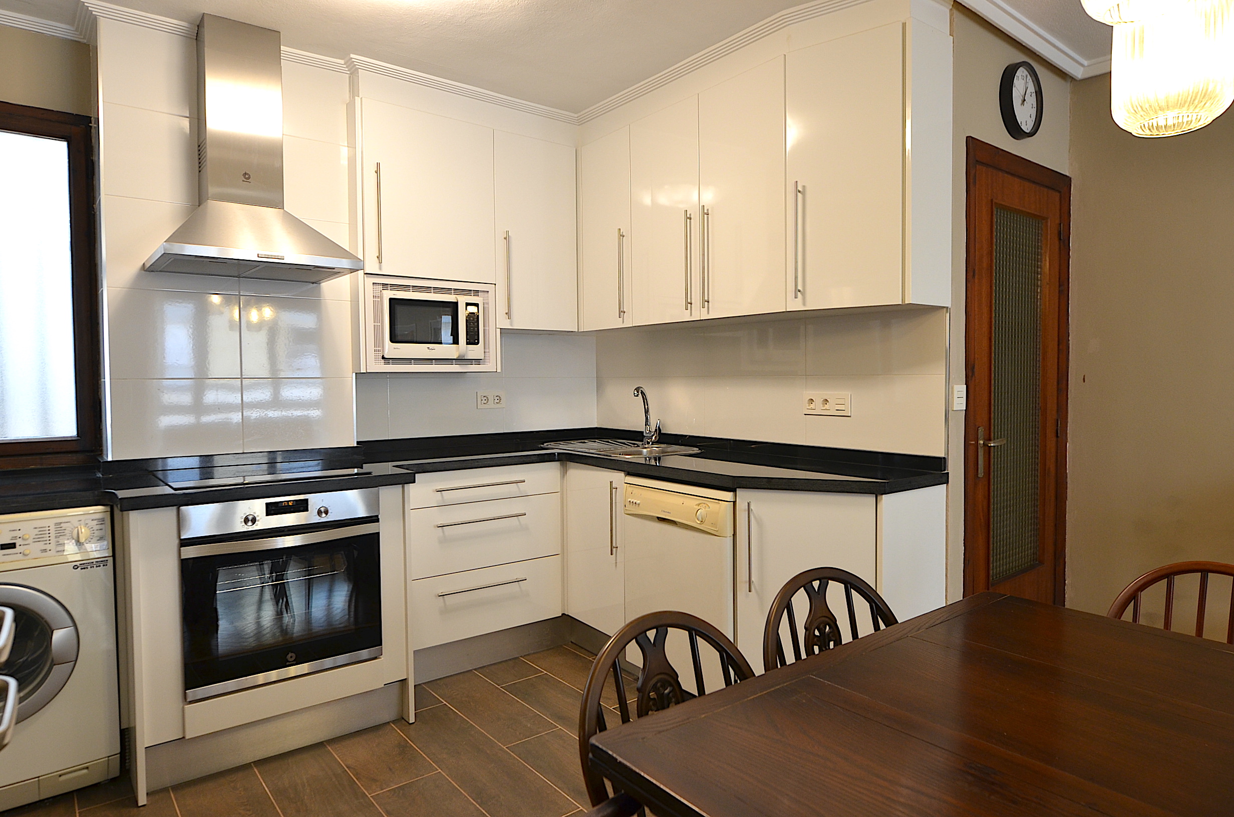 Cocina totalmente equipada con lavaplatos, lavadora, nevera, placa vitro-ceramica, horno, microondas, cafetera, tostador, etc…