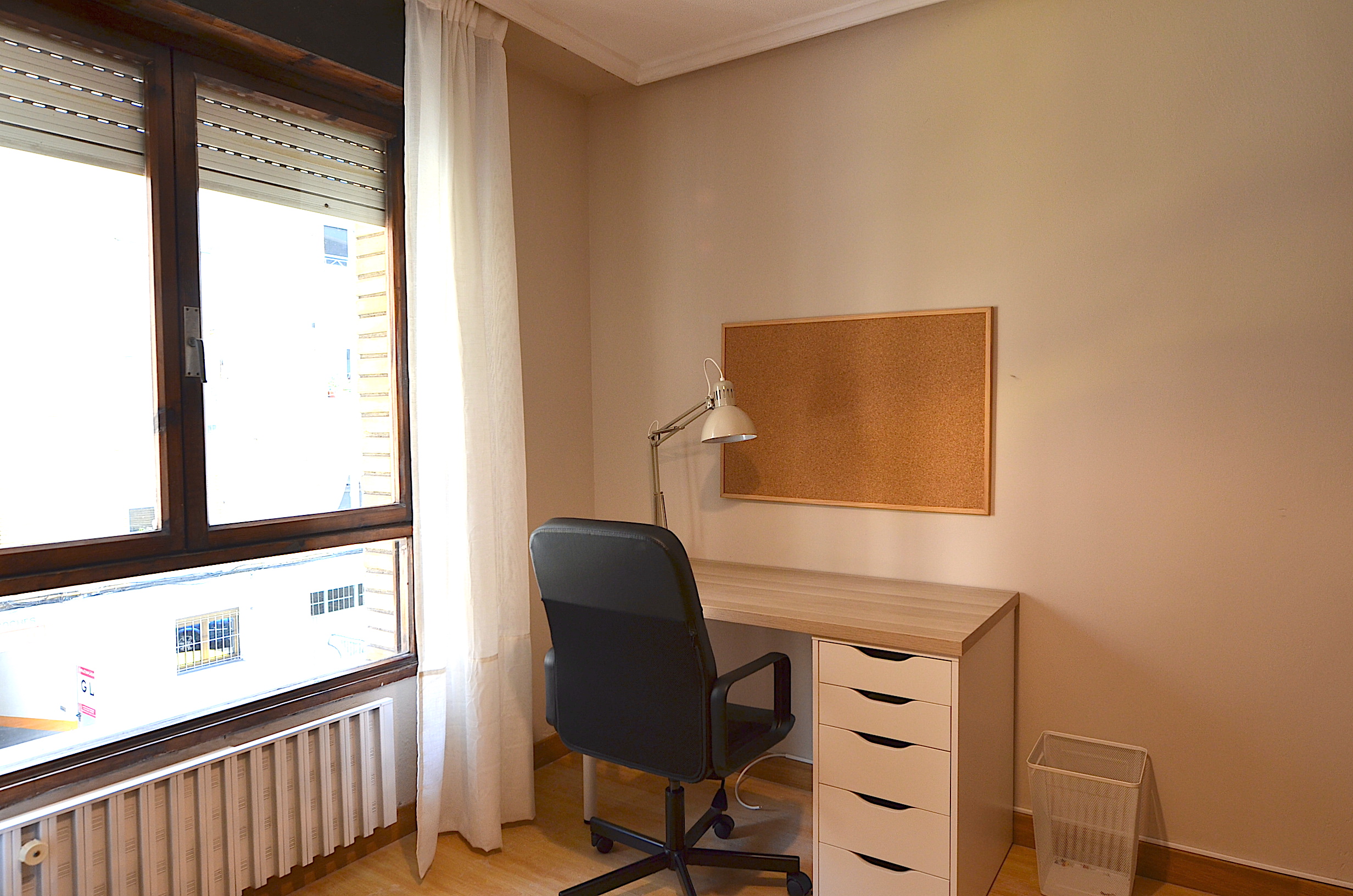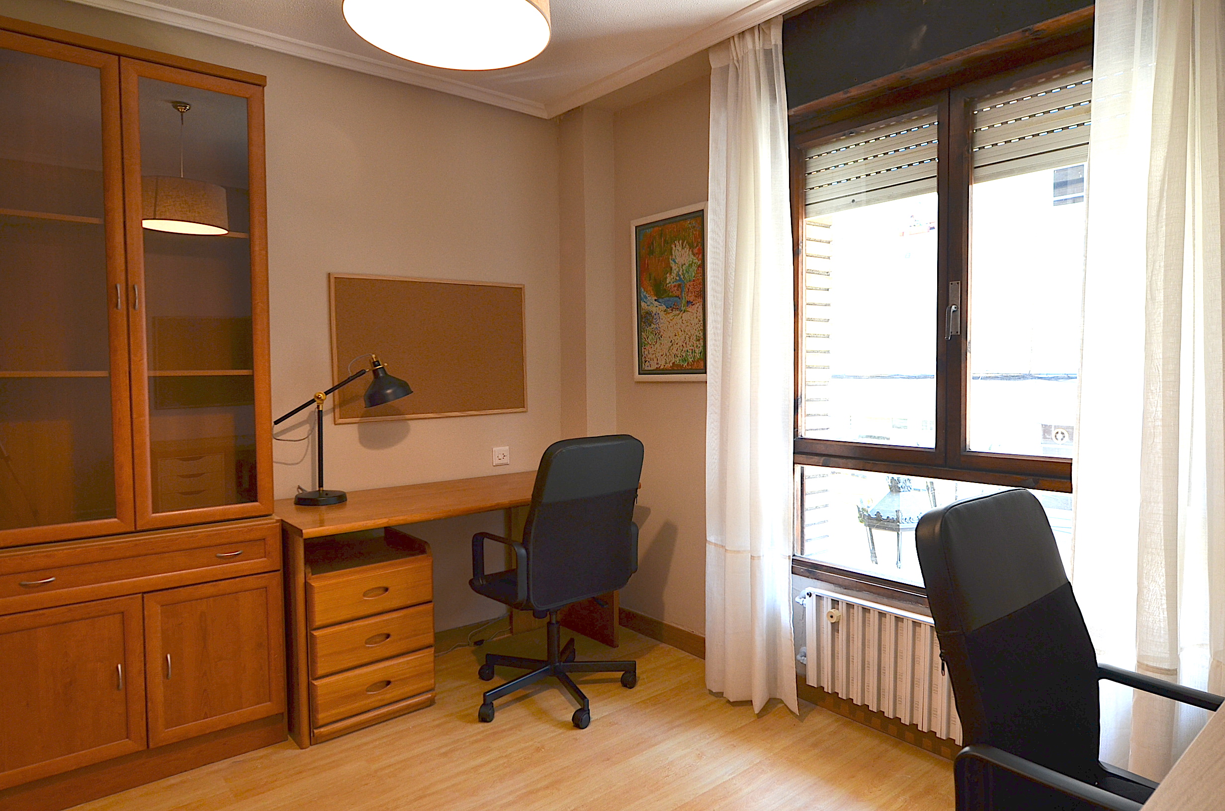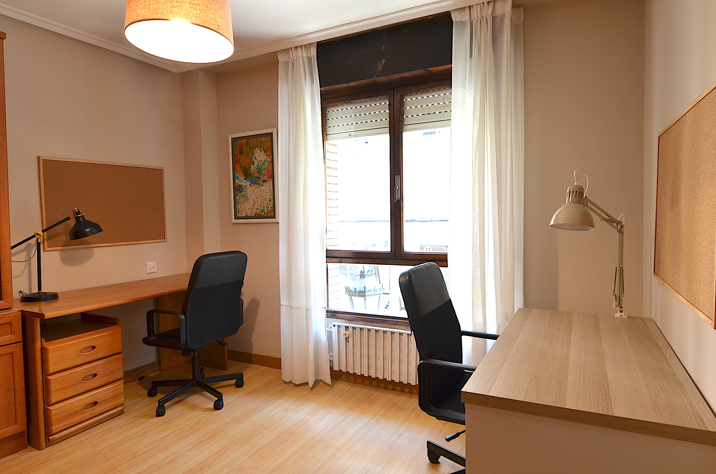 Una tercera habitación dispuesta como sala de estudio con dos buenos escritorios, silla ergonomica, estanteria para libros, flexo, corcho, papelera, etc…