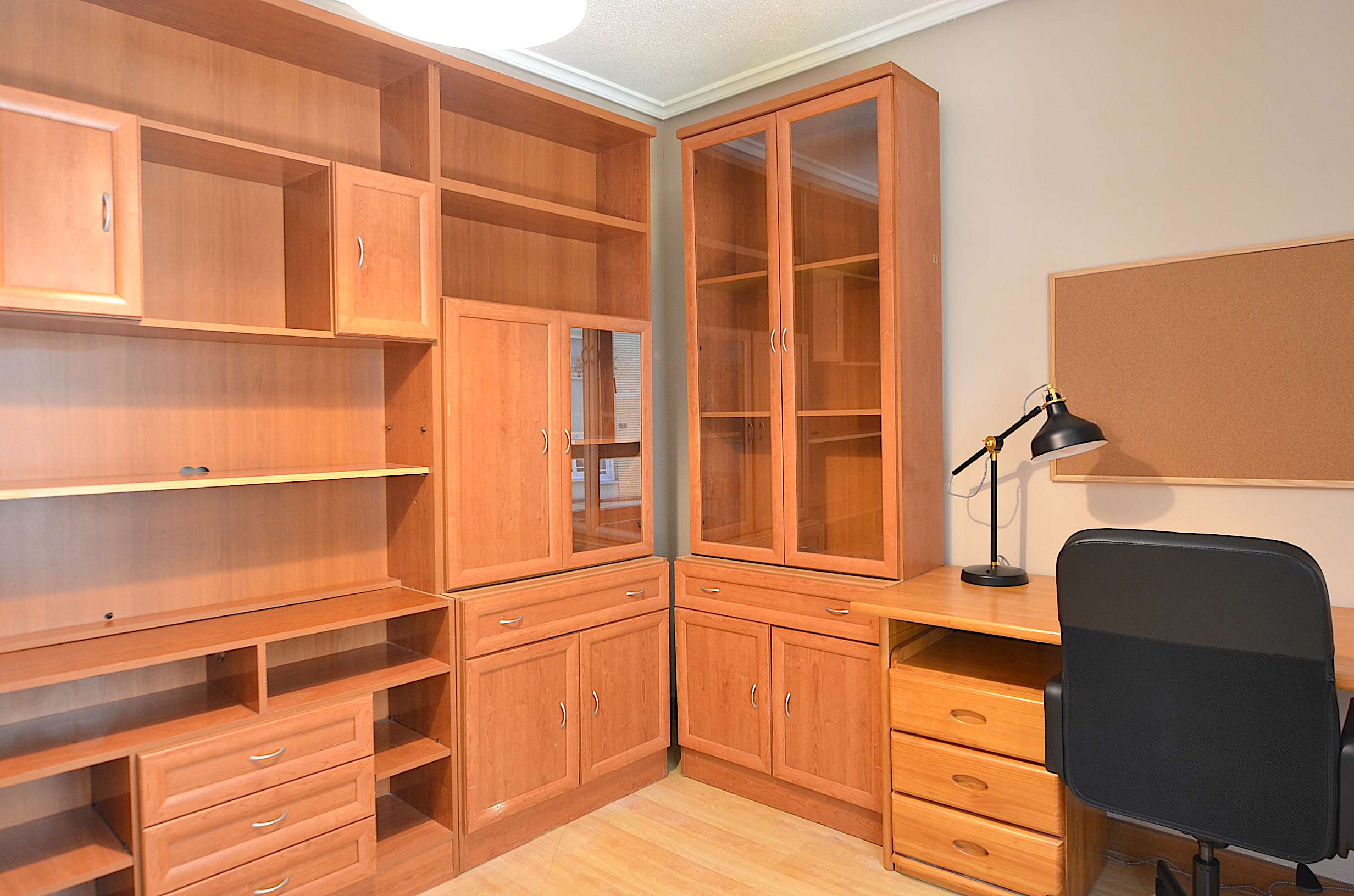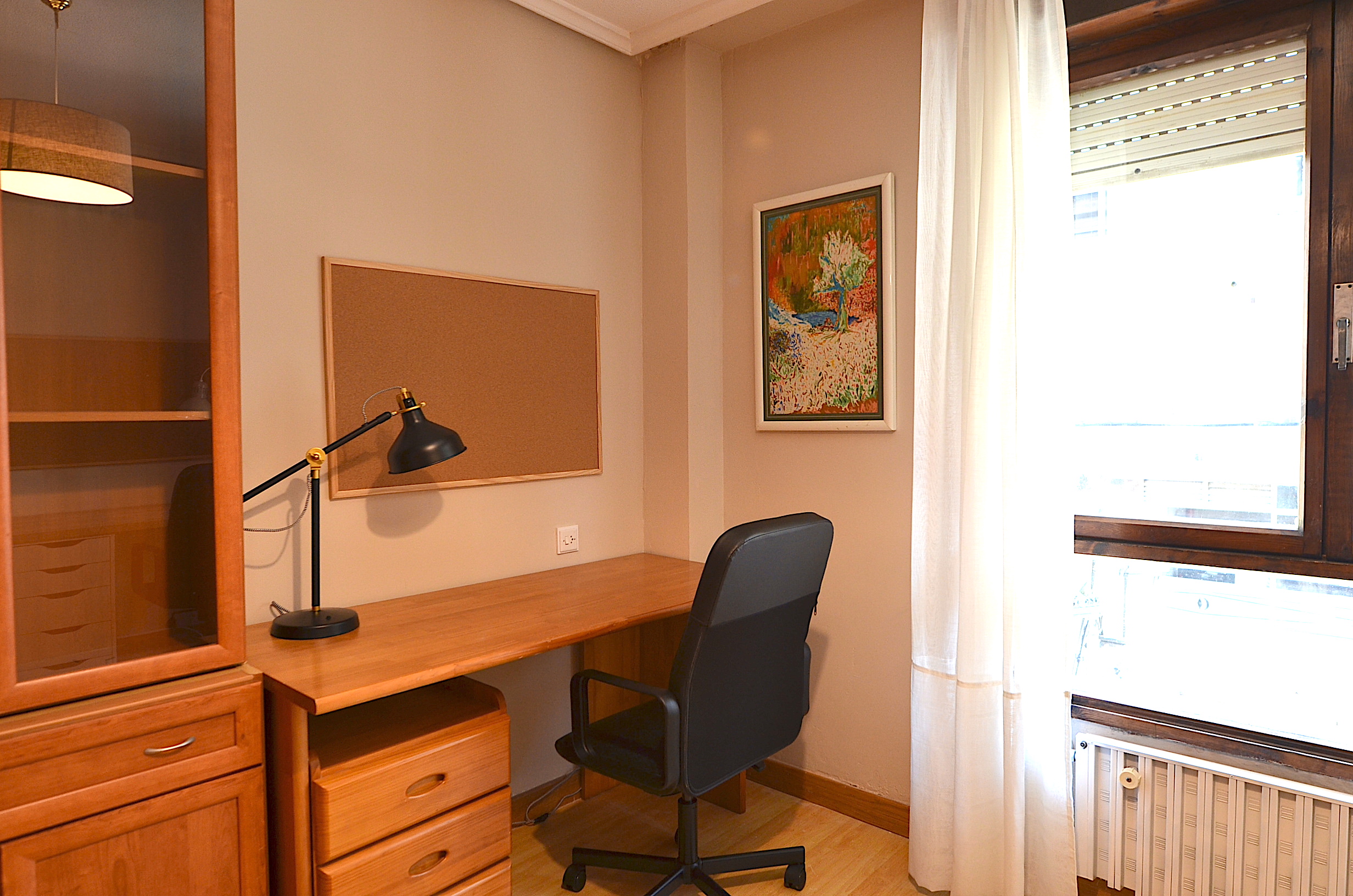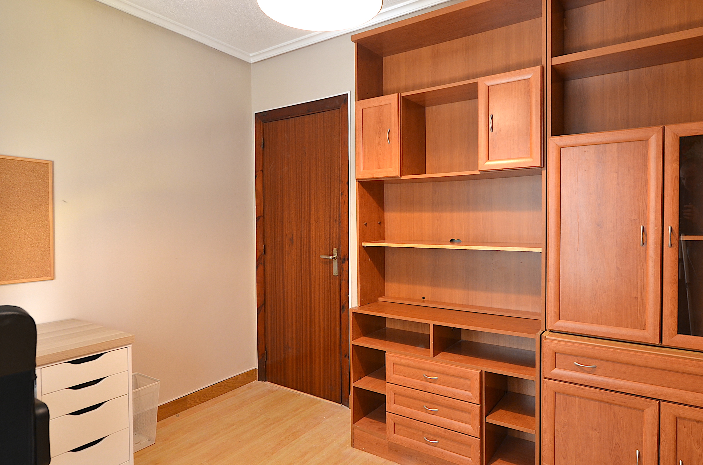 Una tercera habitación dispuesta como sala de estudio con dos buenos escritorios, silla ergonomica, estanteria para libros, flexo, corcho, papelera, etc…