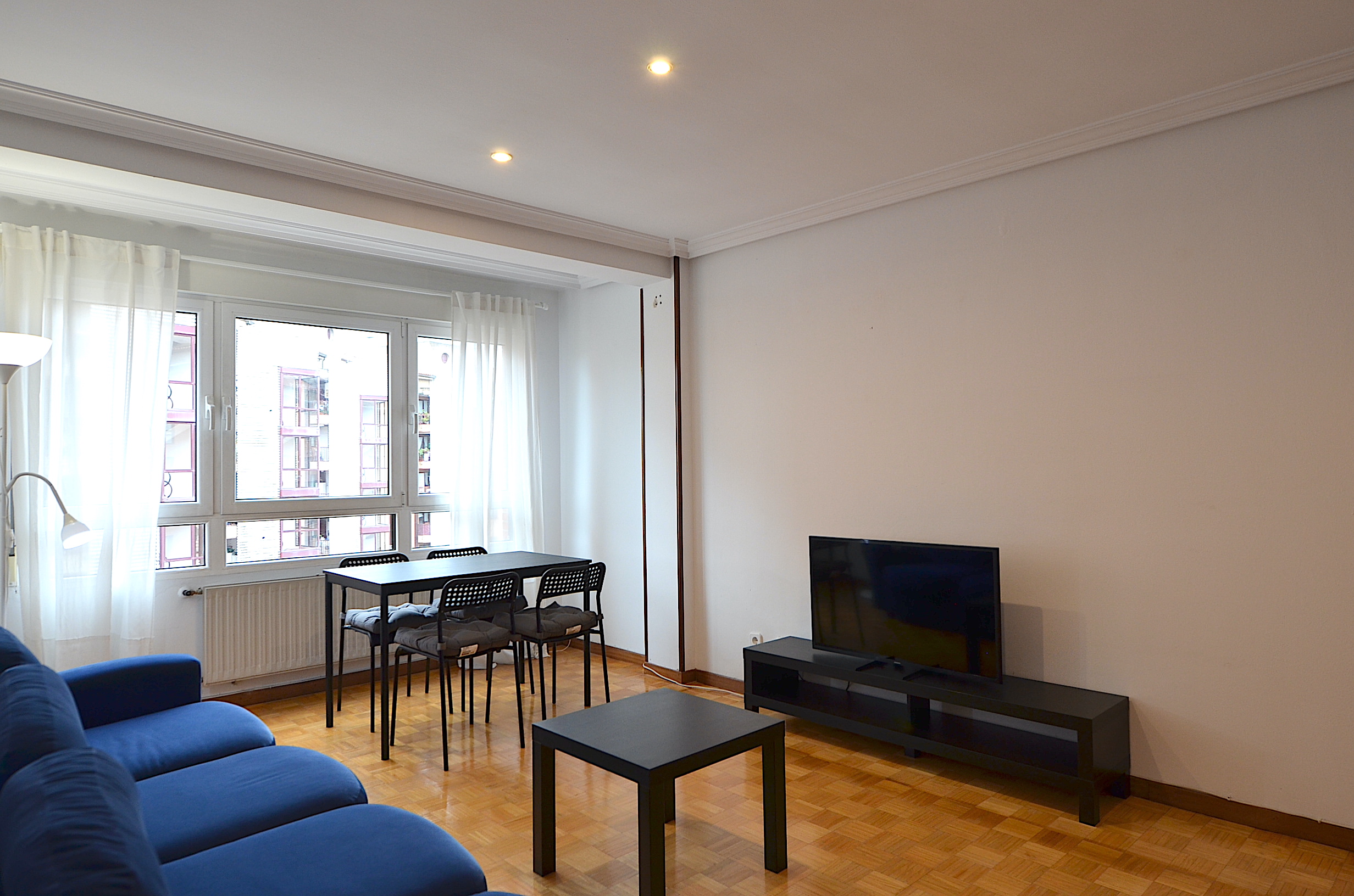 Salón exterior, orientación suroeste, con mesa de comedor y tv plana.