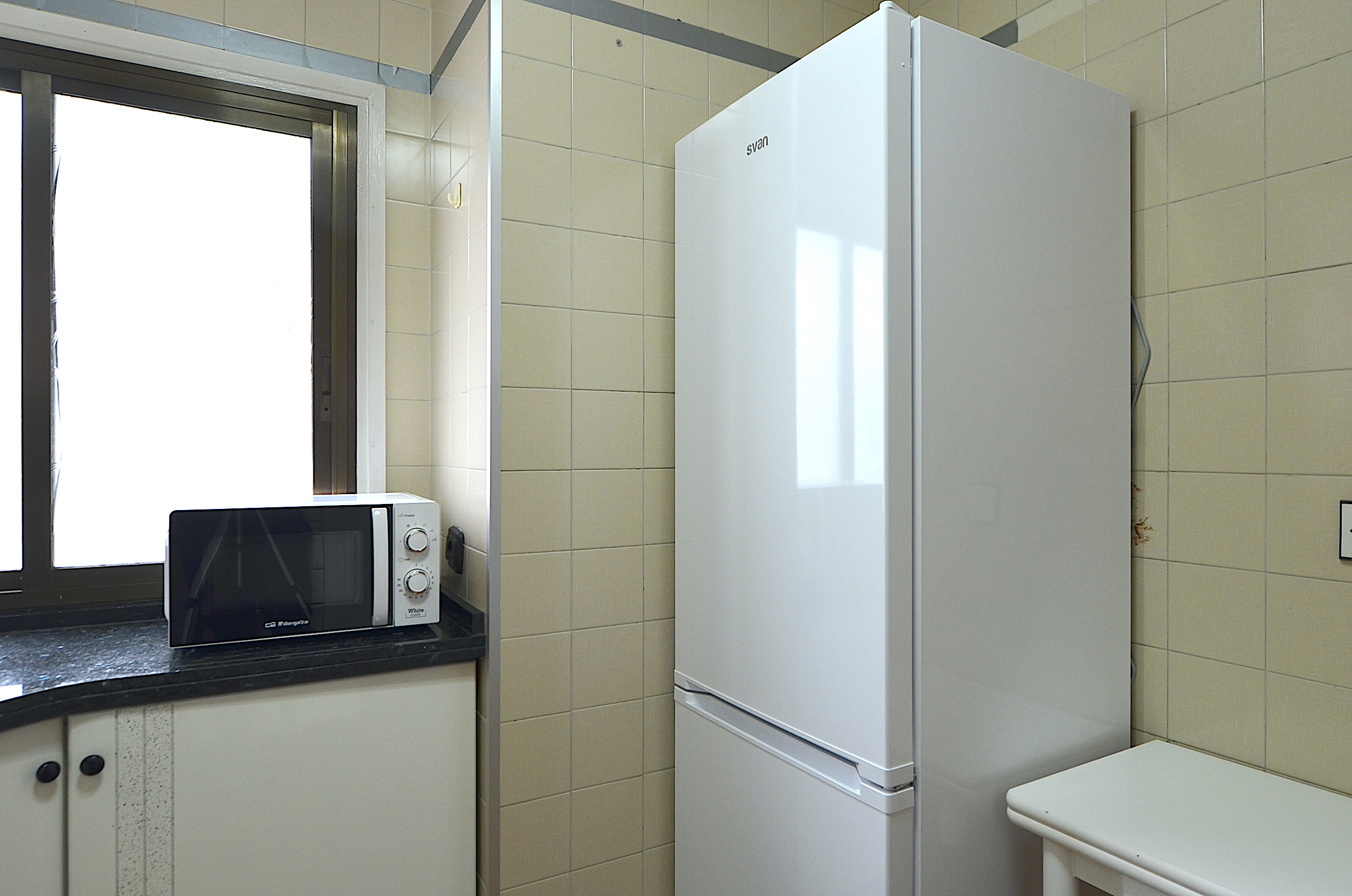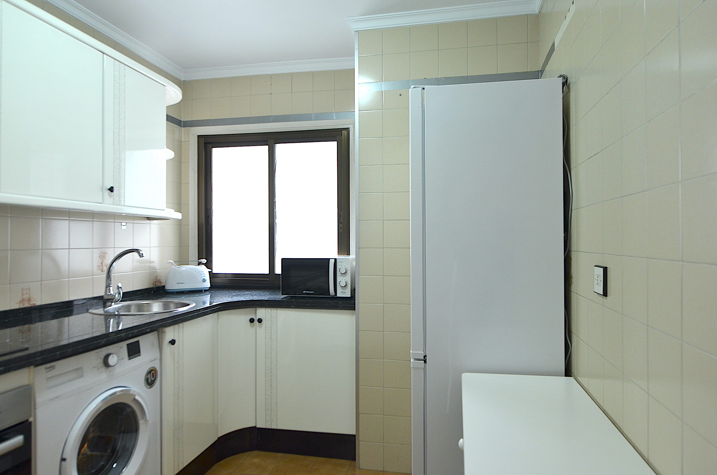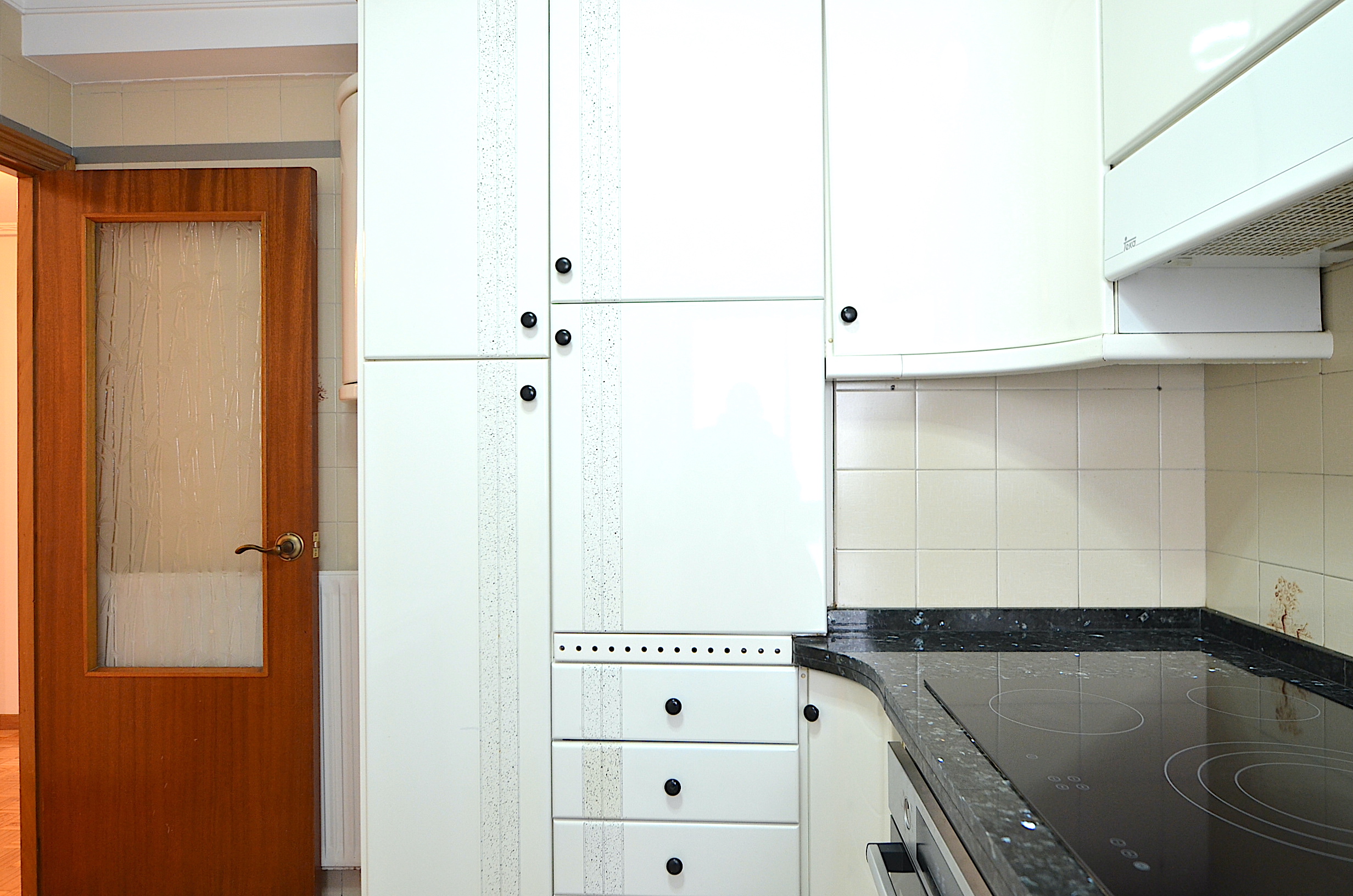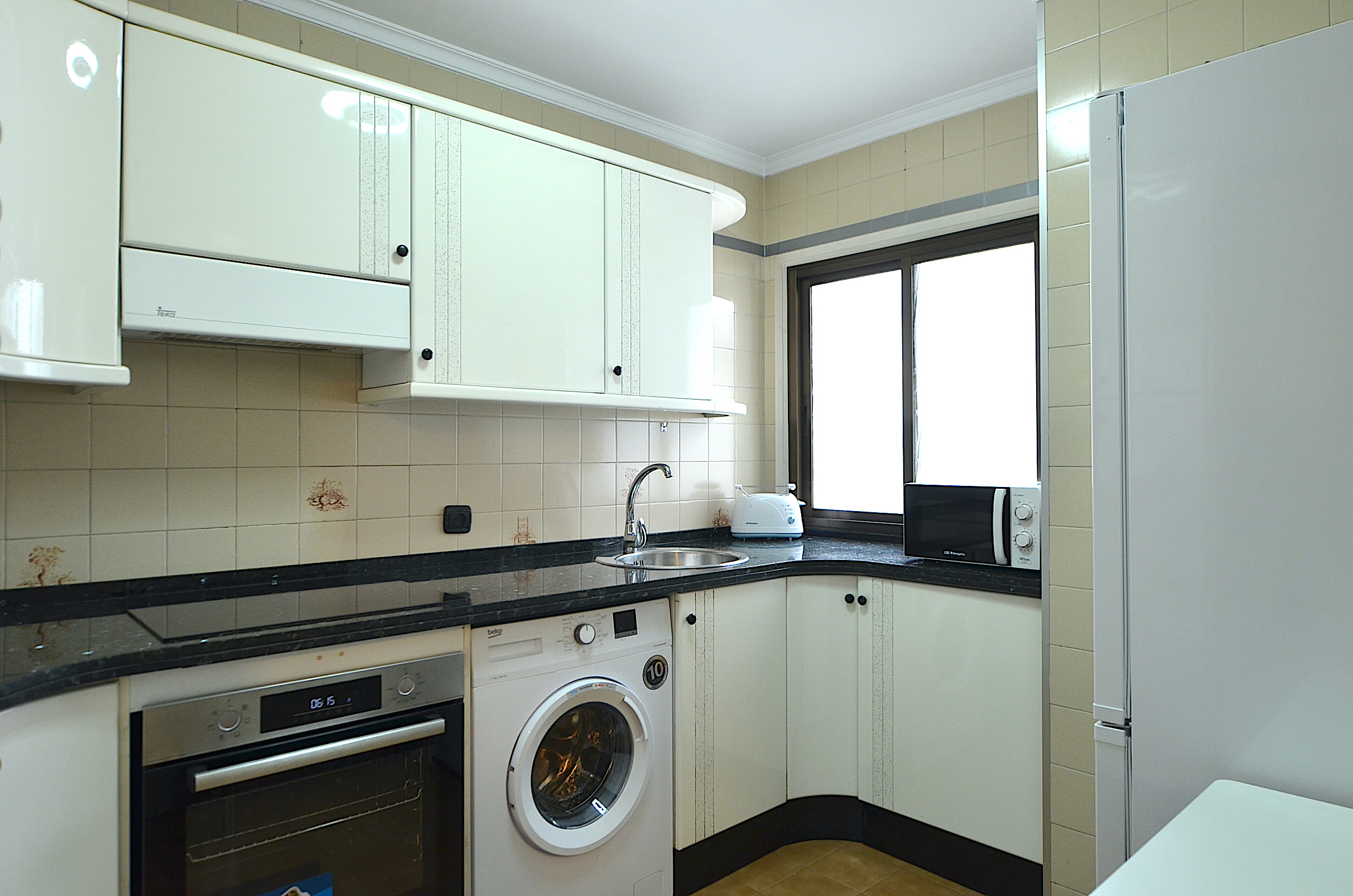 Cocina independiente equipada con nevera, lavadora, horno, vitrocerámica, campana extractora, microondas y cafetera. Menaje básico de cocina.
