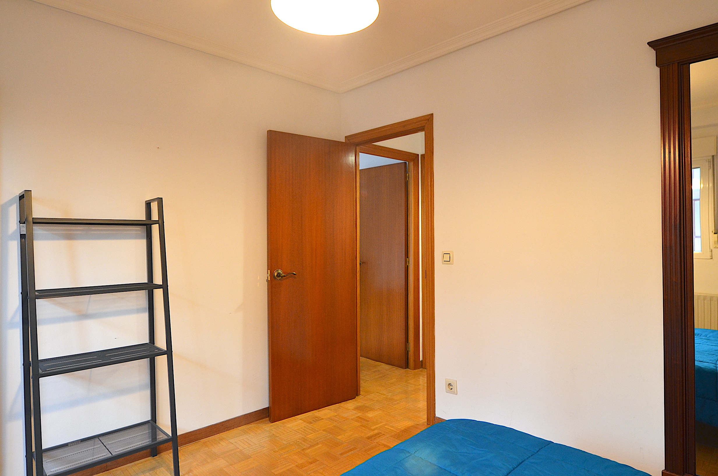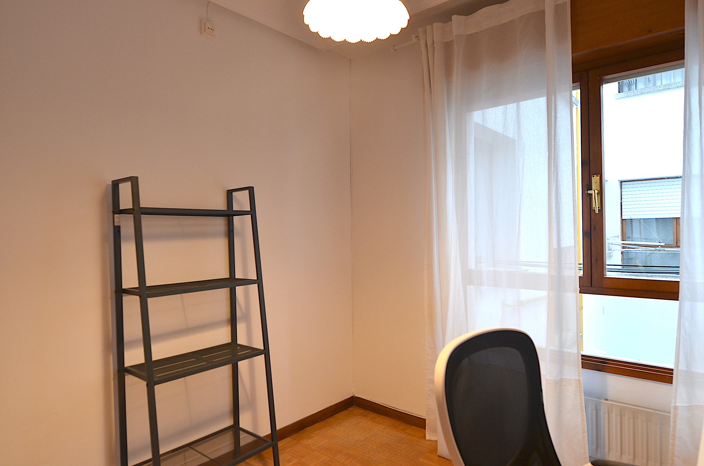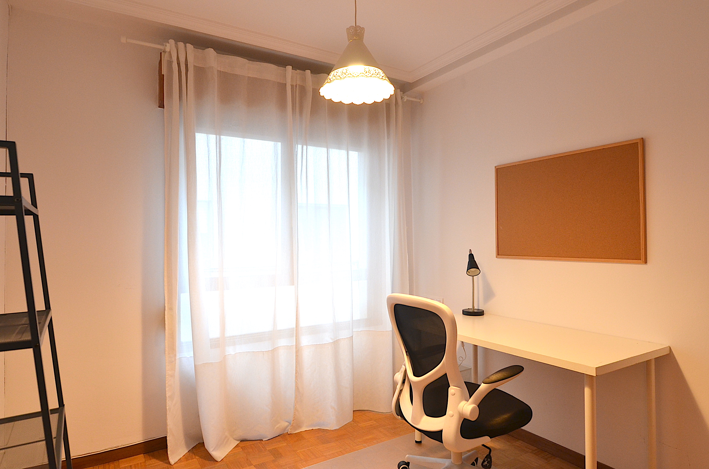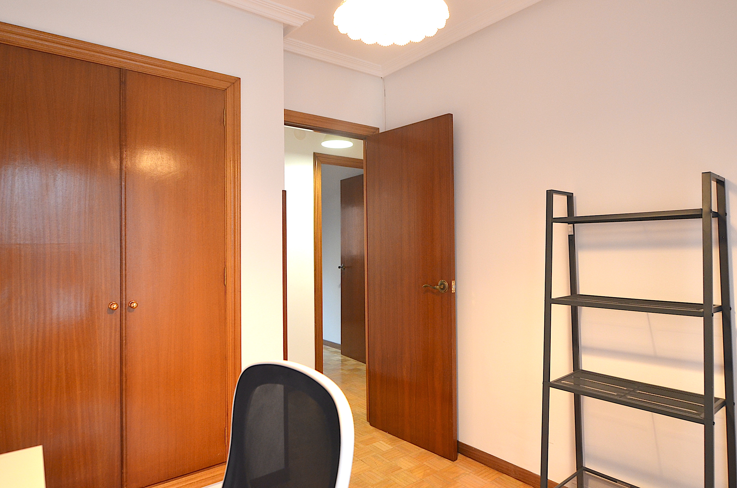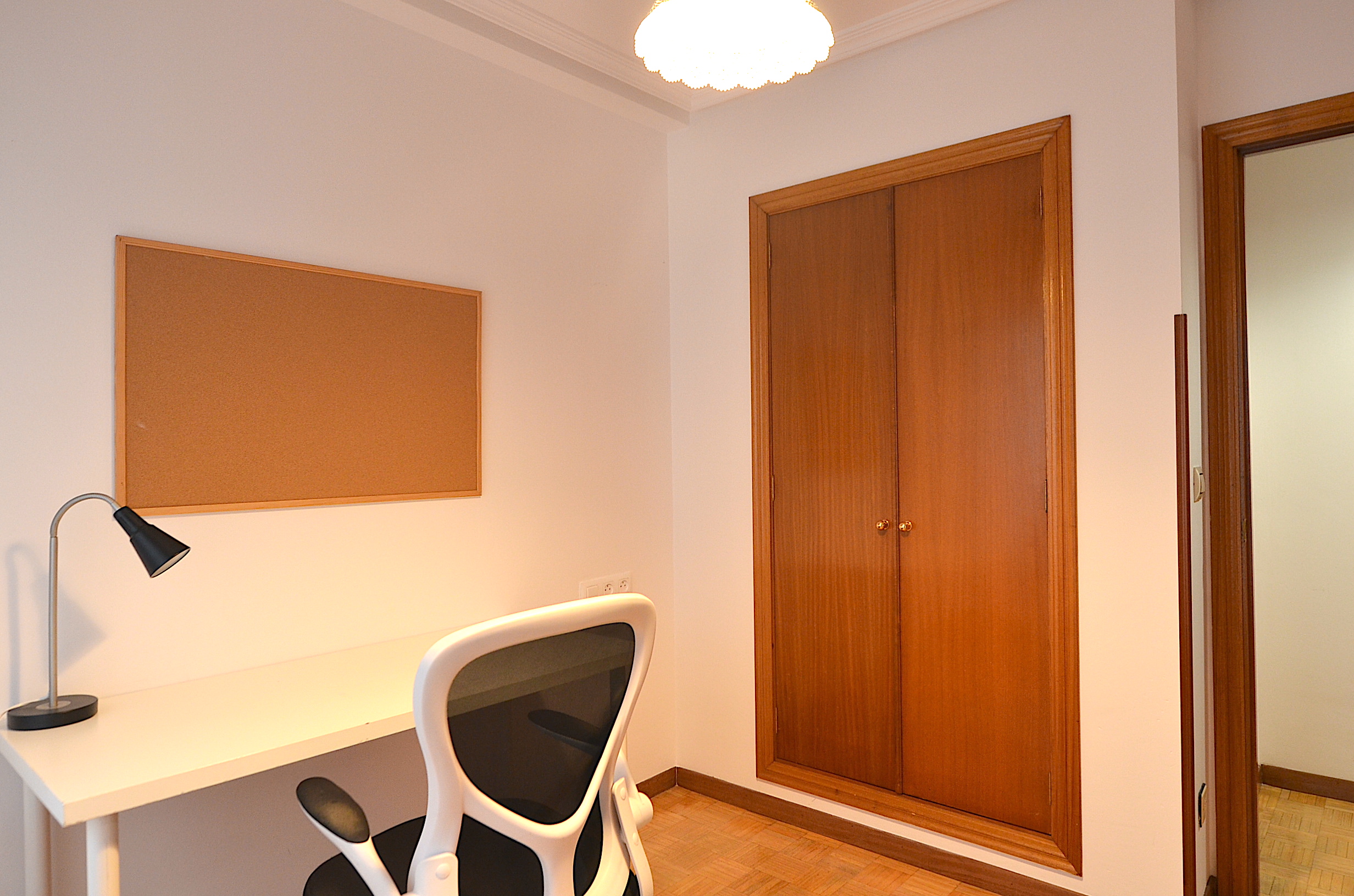 Habitación secundaria con zona de estudio (despacho), mesa de estudio, silla ergonómica, estanteria, flexo, corcho y papelera. Un segundo armario de almacenaje para ropa.