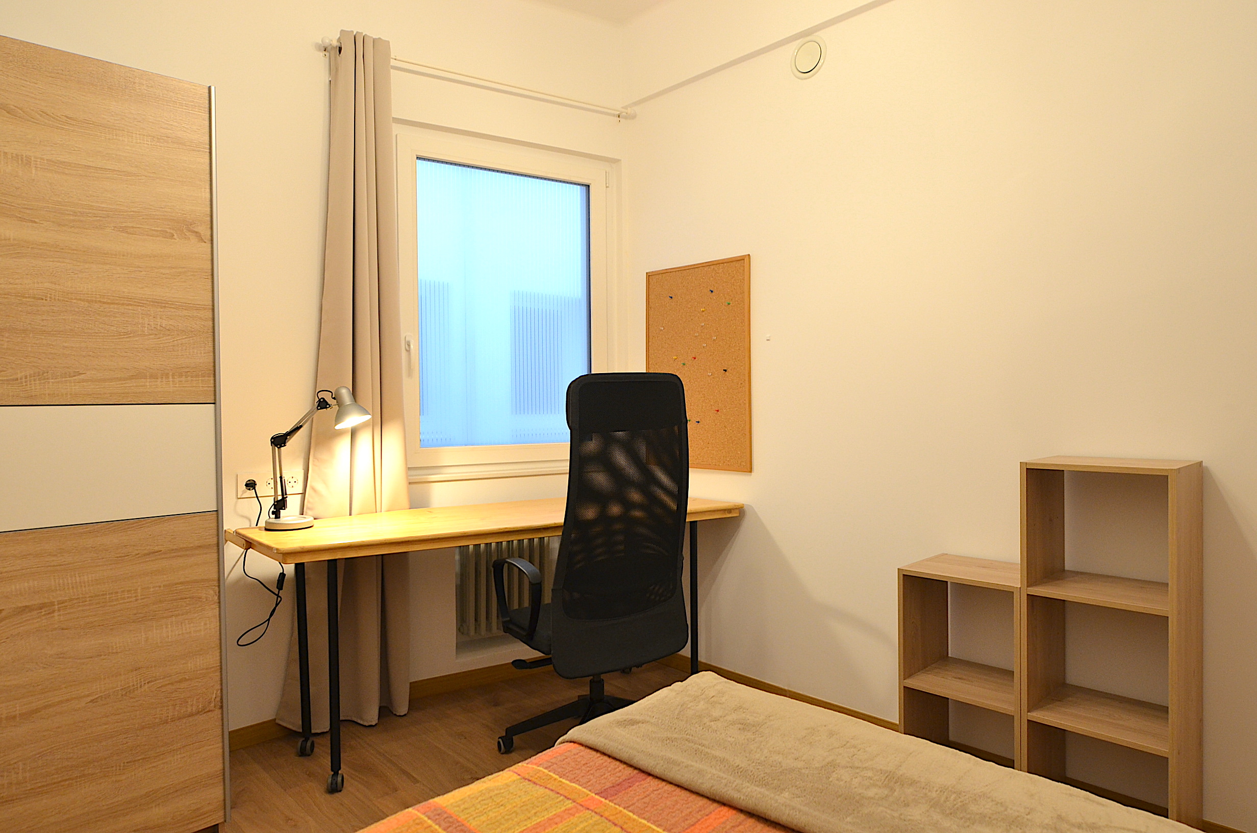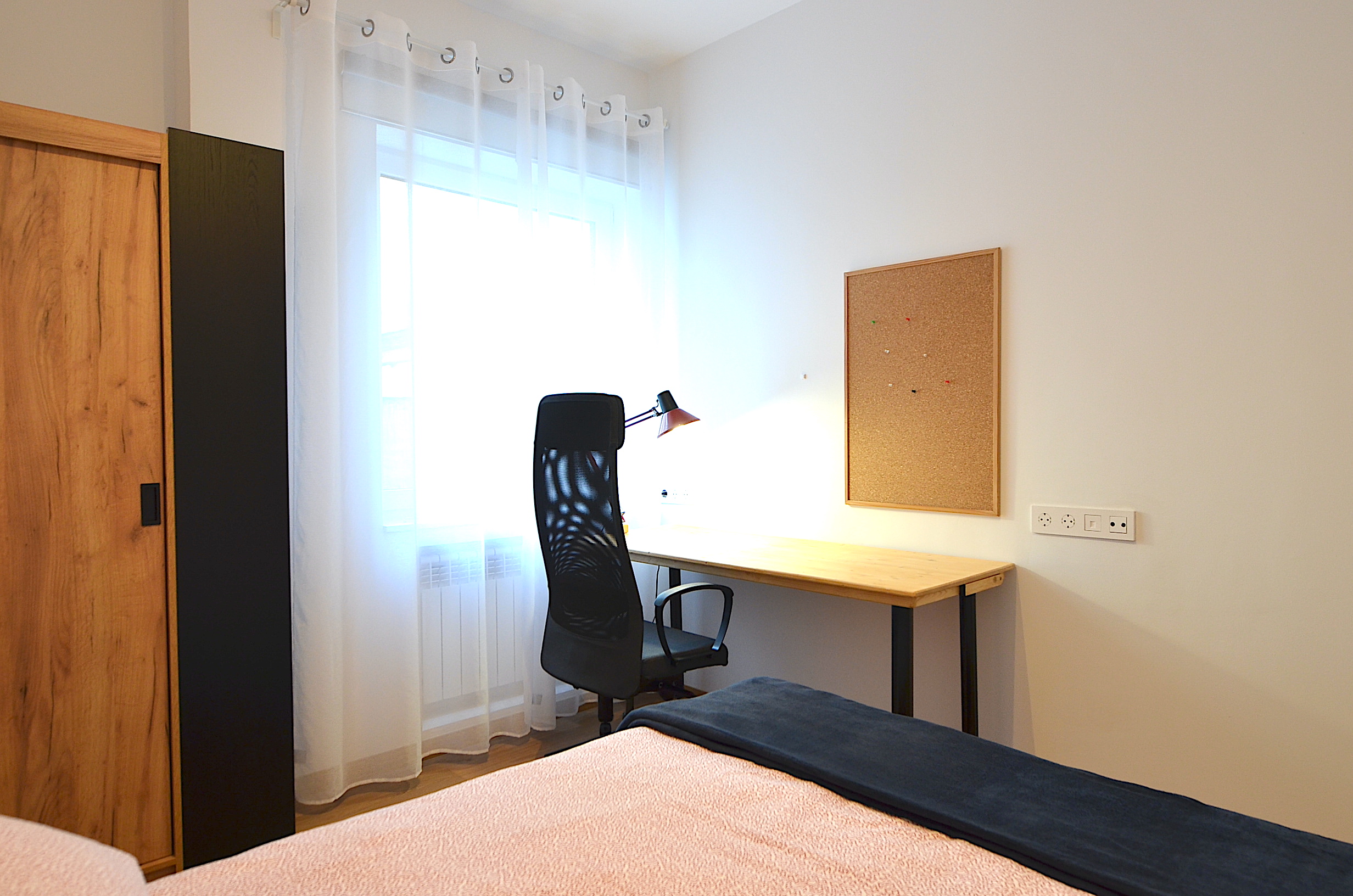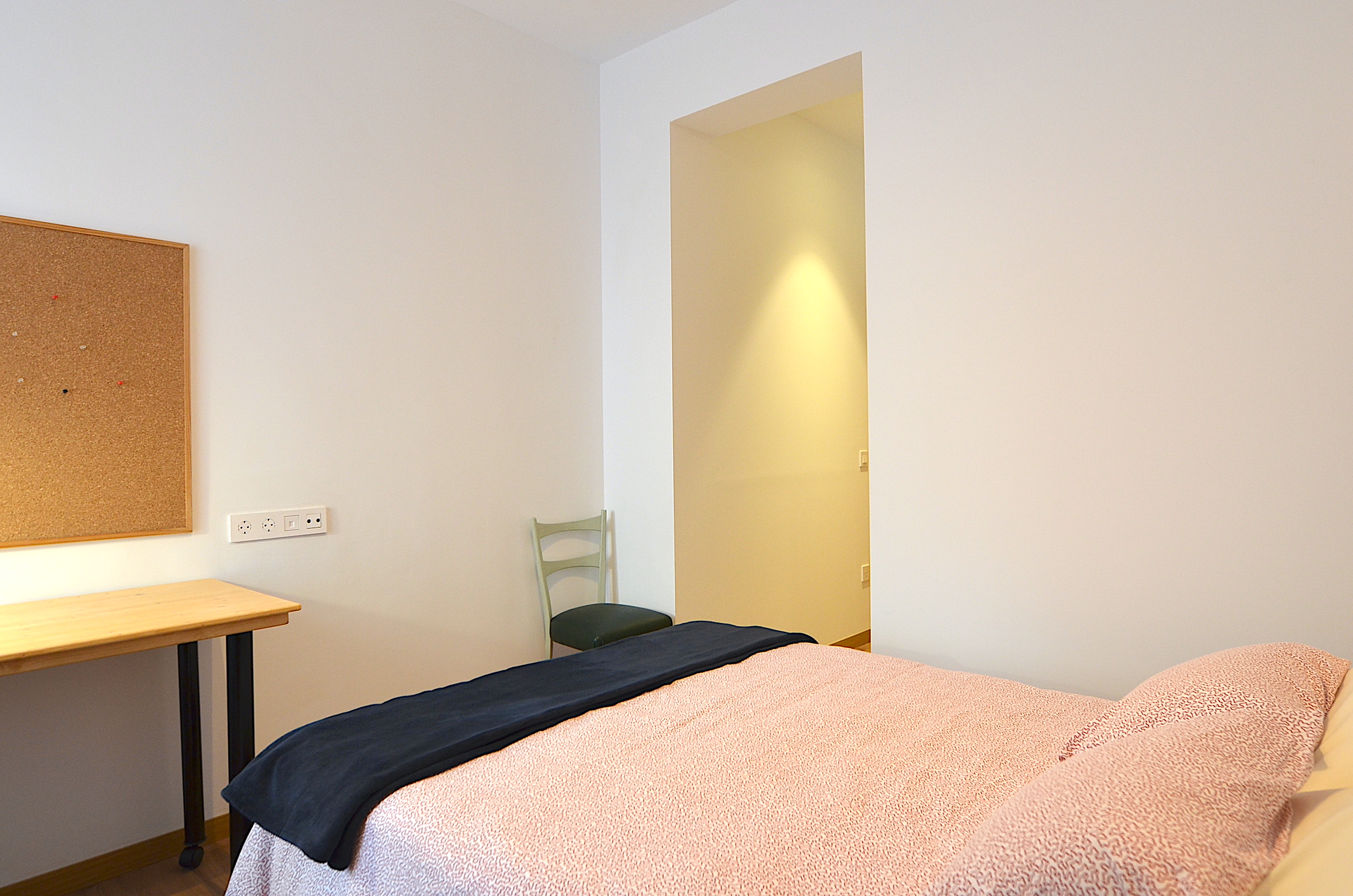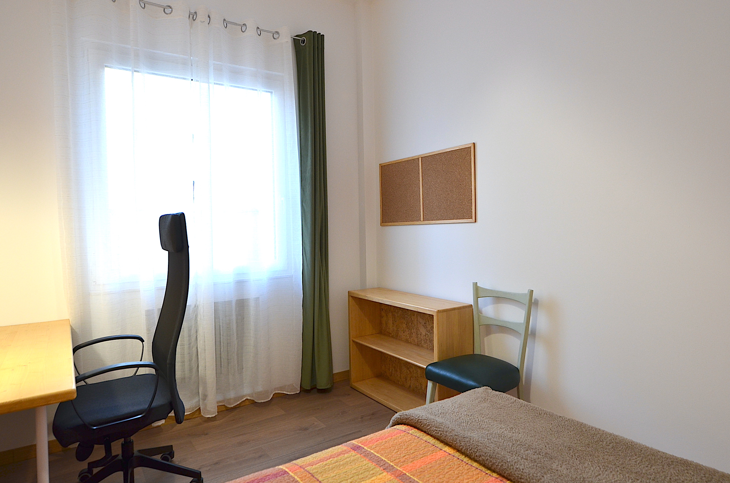 Cada habitación dispone de cama doble, mesa de escritorio amplia, silla de estudio confortable, gran armario de almacenamiento, estanteria, flexo, papelera, corcho.