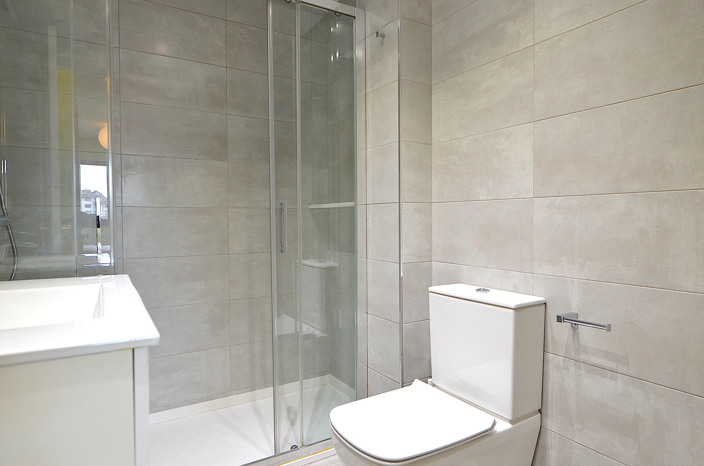 Cuarto de baño completamente reformado situado dentro de la habitación. Plato de ducha y mampara.