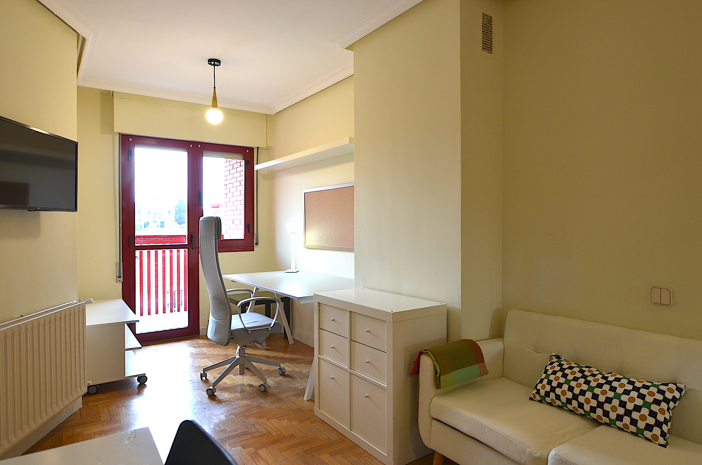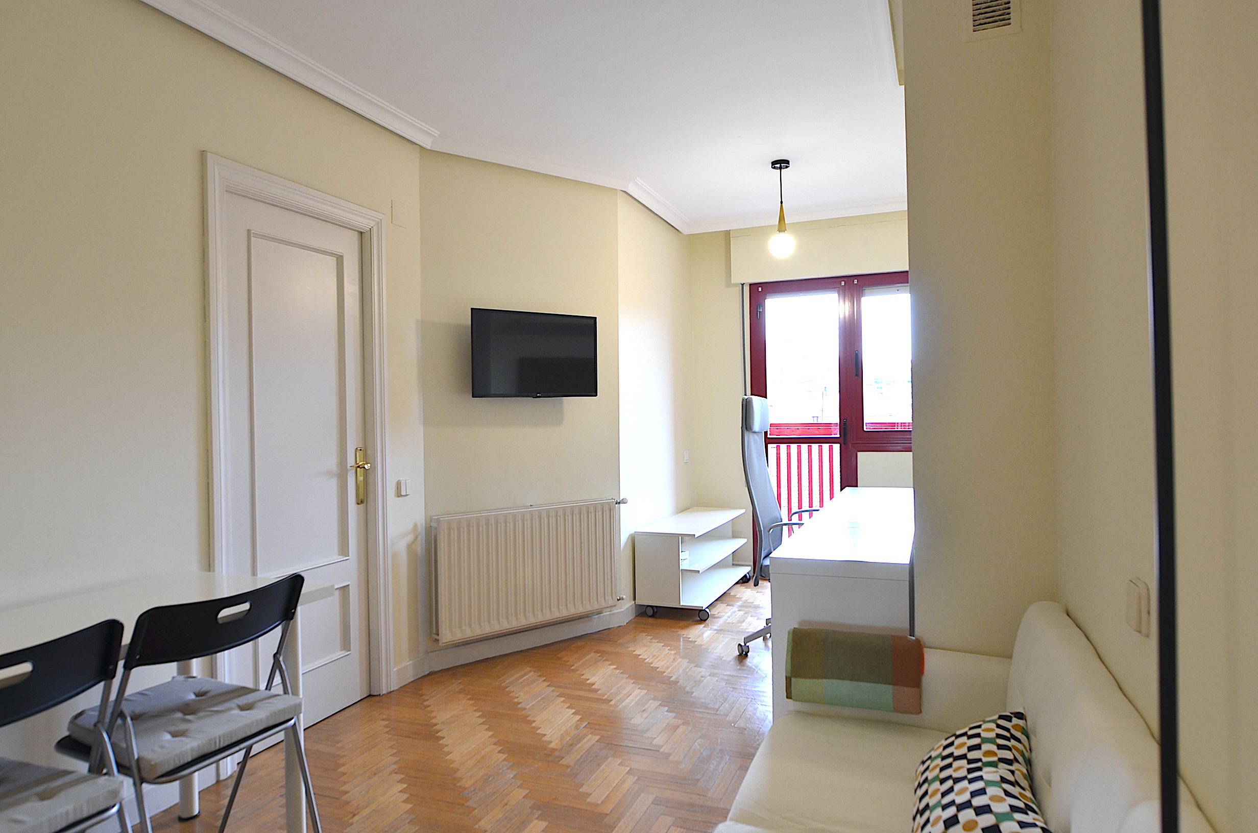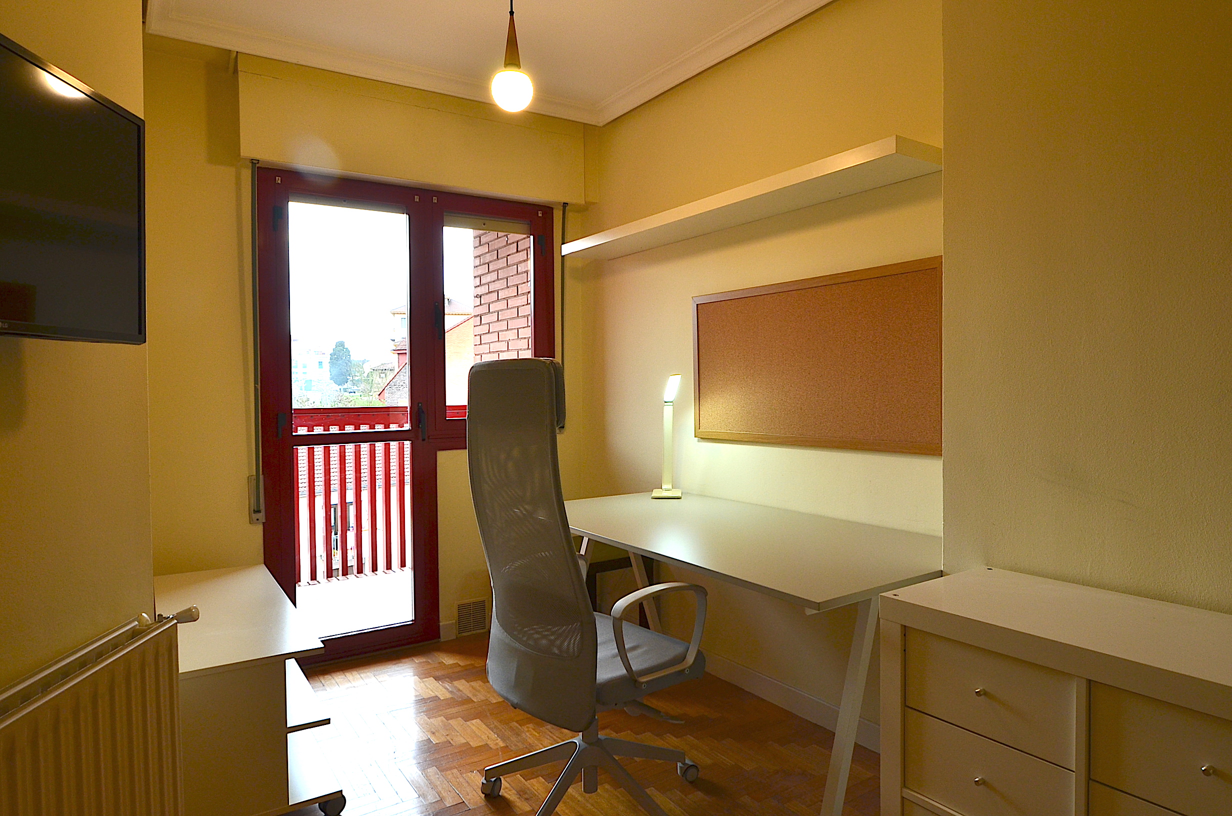 Amplia zona de estudio situada en el salón, con gran escritorio, silla de estudio ergonómica, estanteria, corcho, flexo y papelera. Dispone de una terraza junto a la zona de estudio.