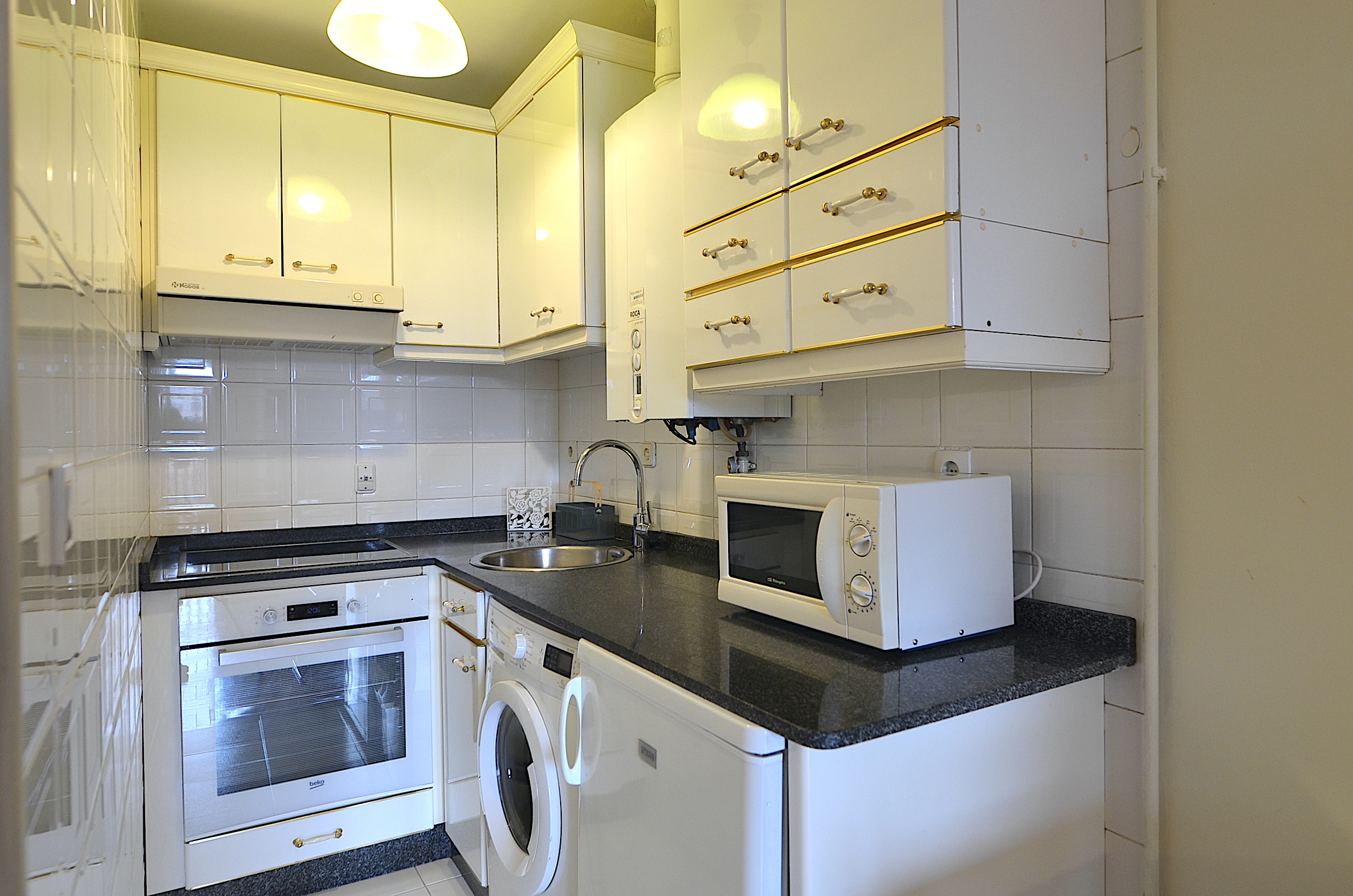 Cocina equipada con nevera, lavadora, horno, vitro-ceramica, microondas, cafetera, tostador y menaje basico de cocina.