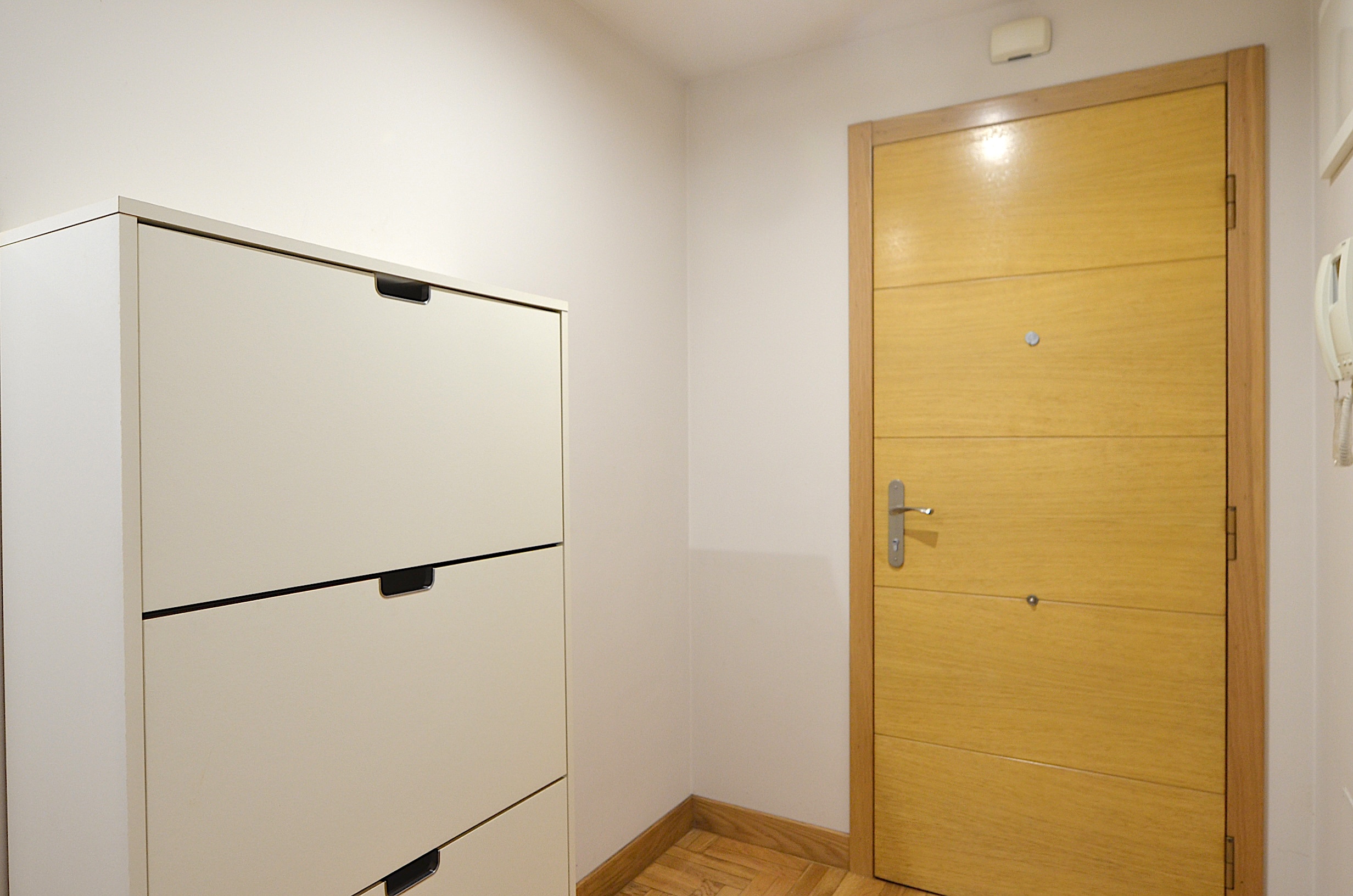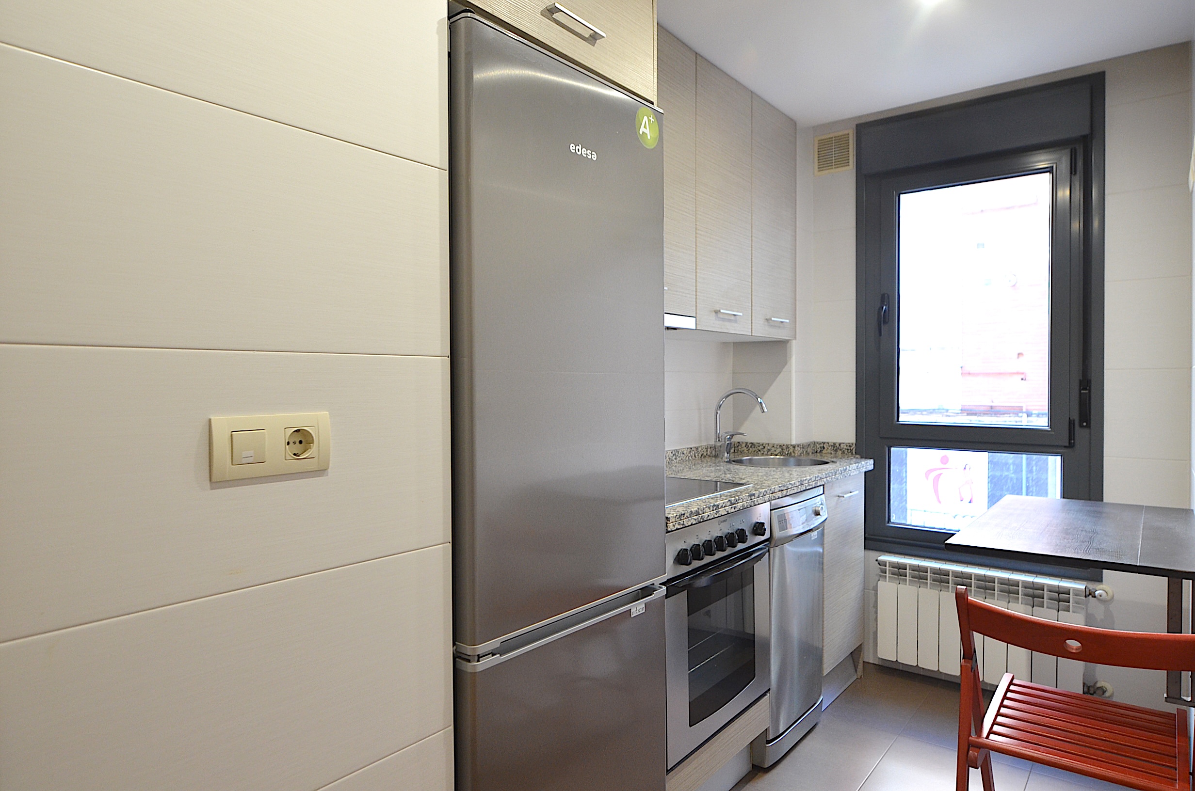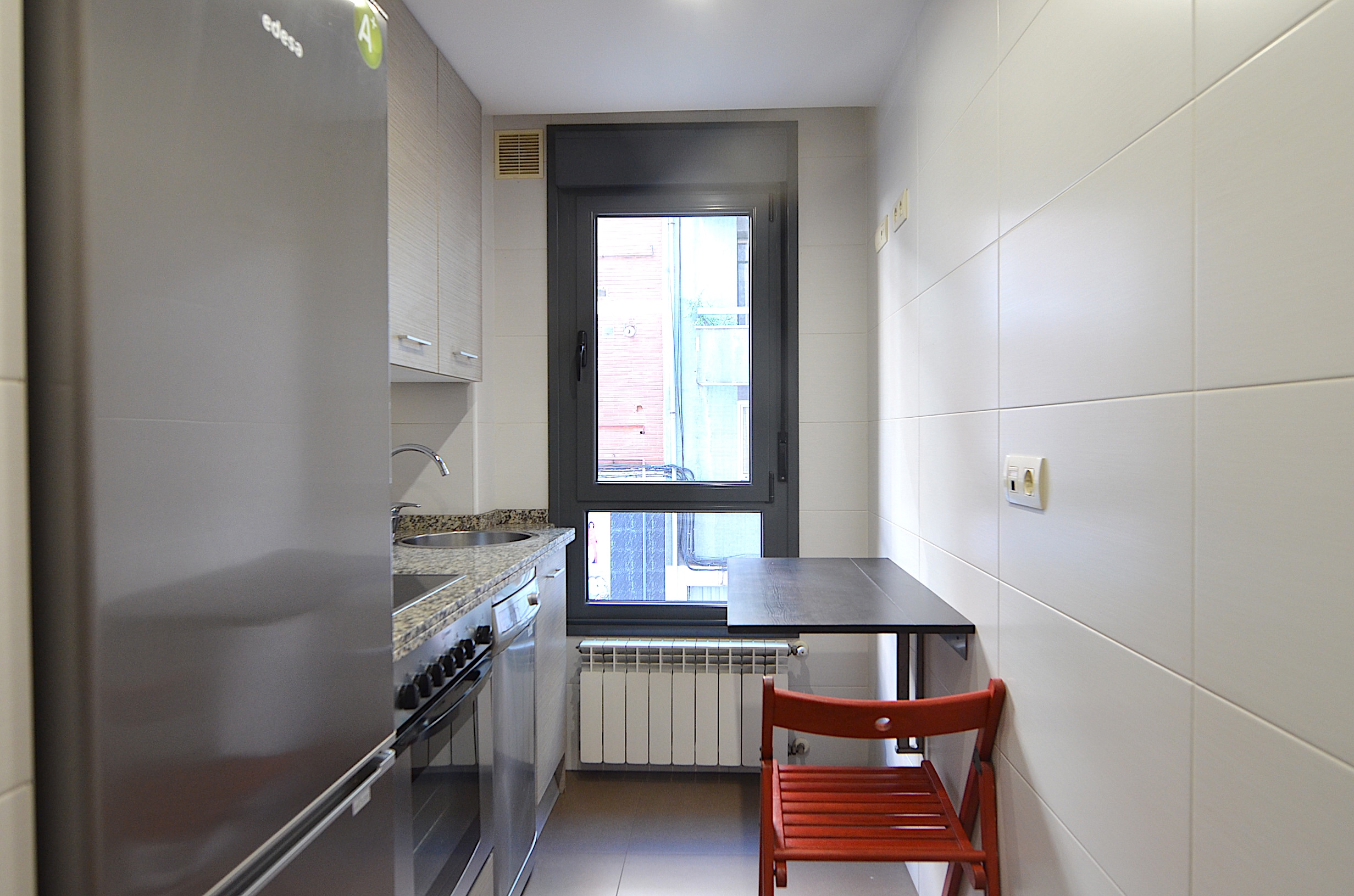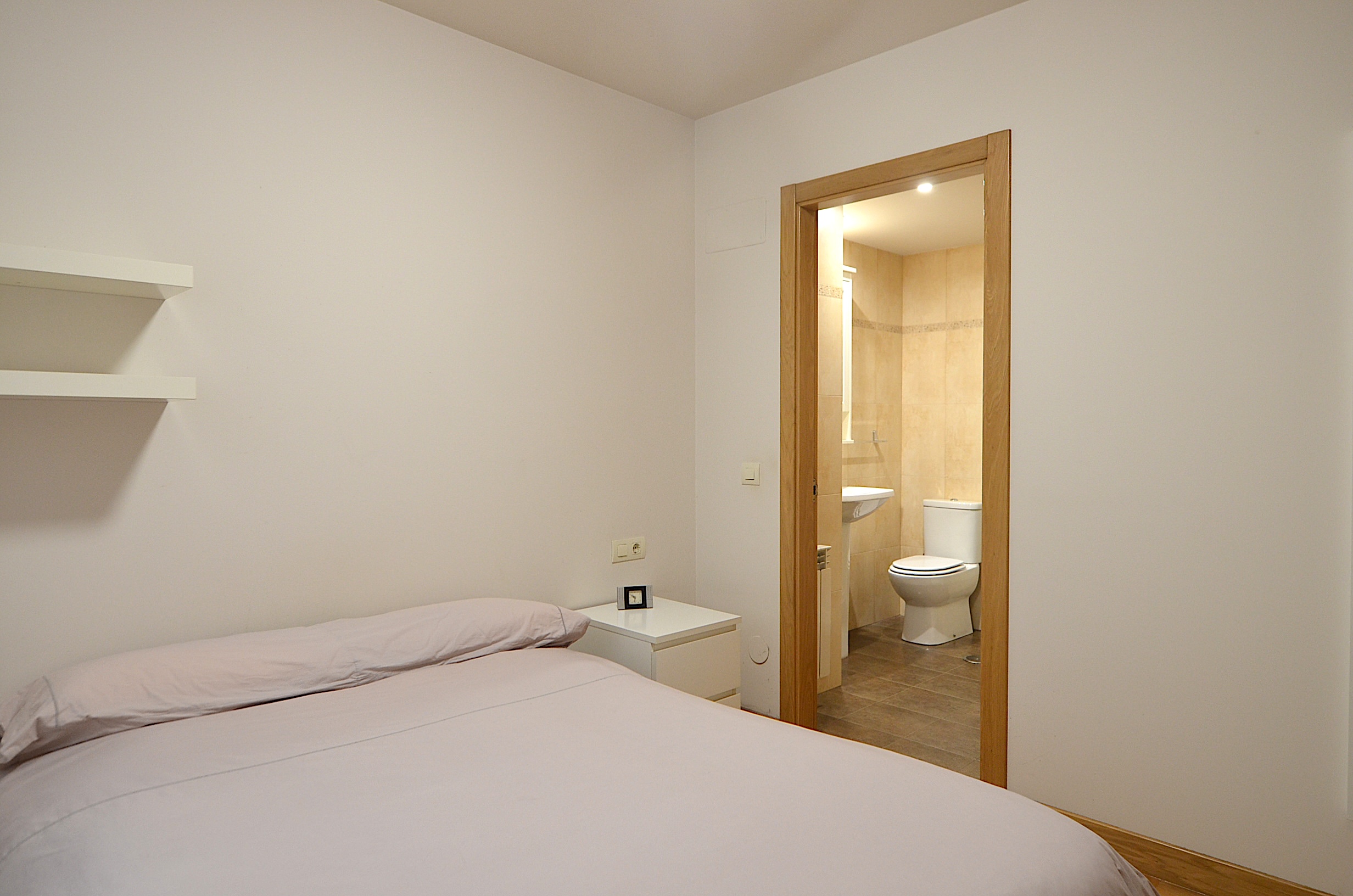 Apartamento individual distribuido en hall de entrada, salón-comedor con zona de estudio, cocina independiente, habitación con cama matrimonial, y cuarto de baño dentro de esta.