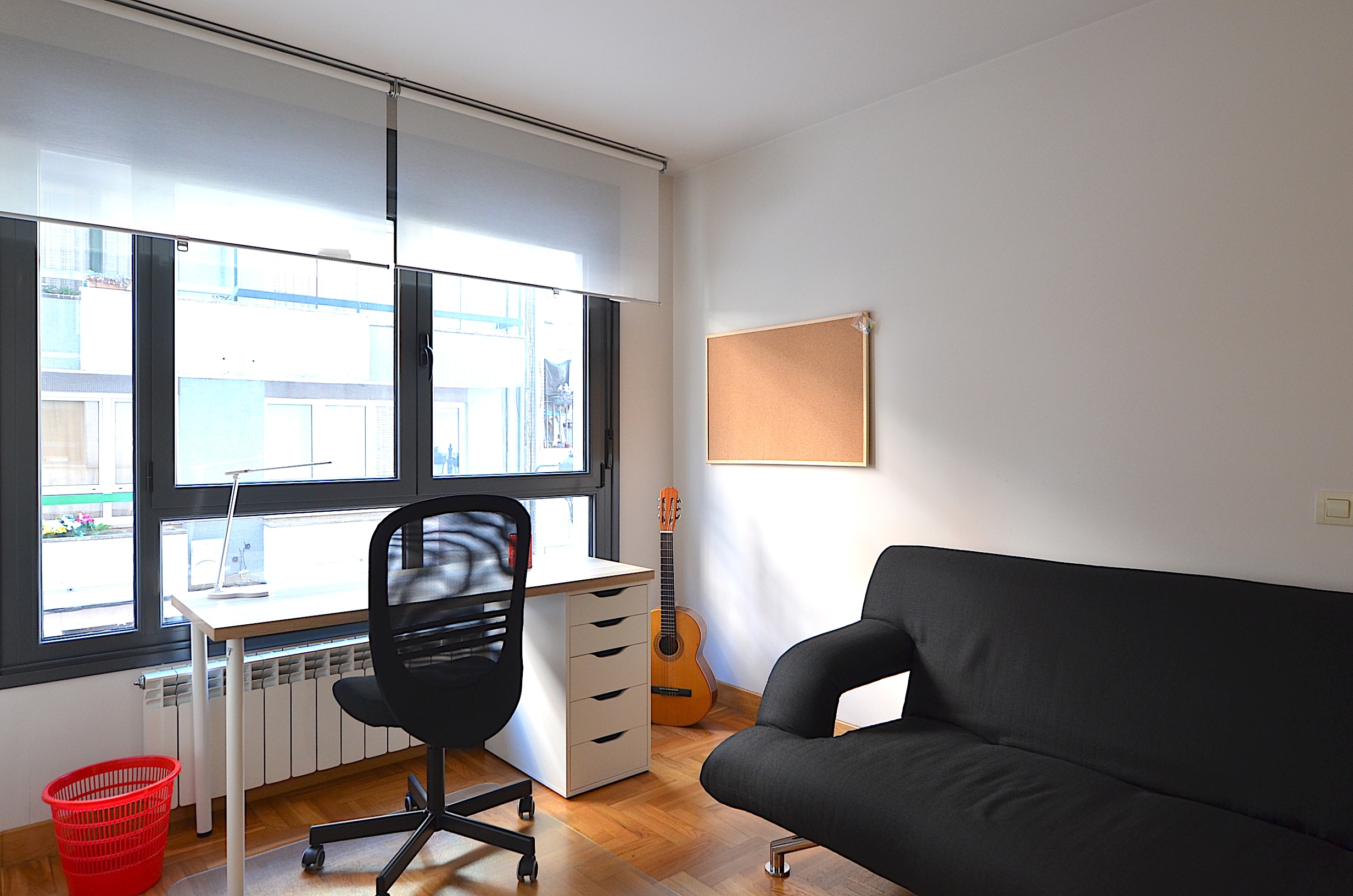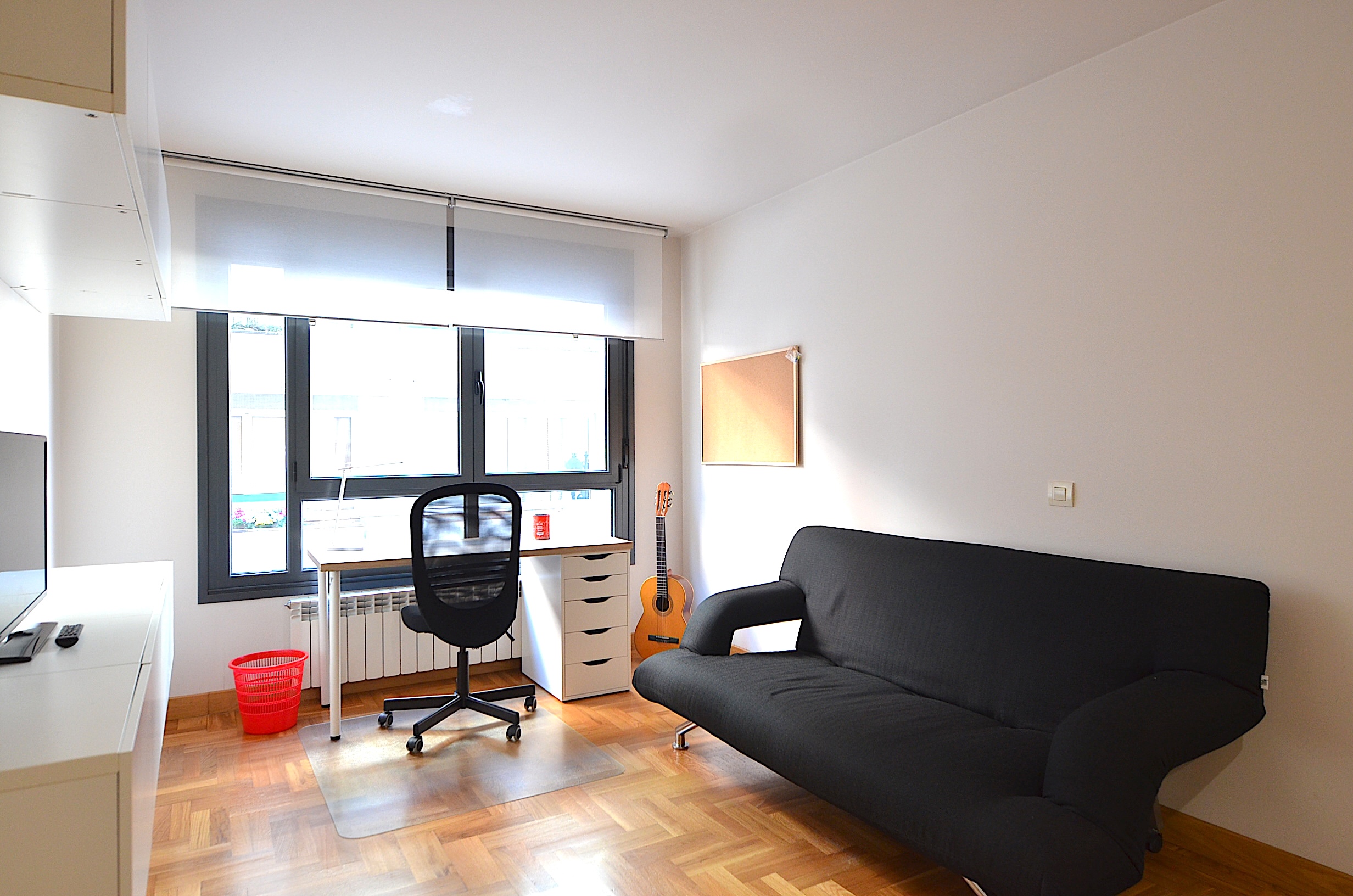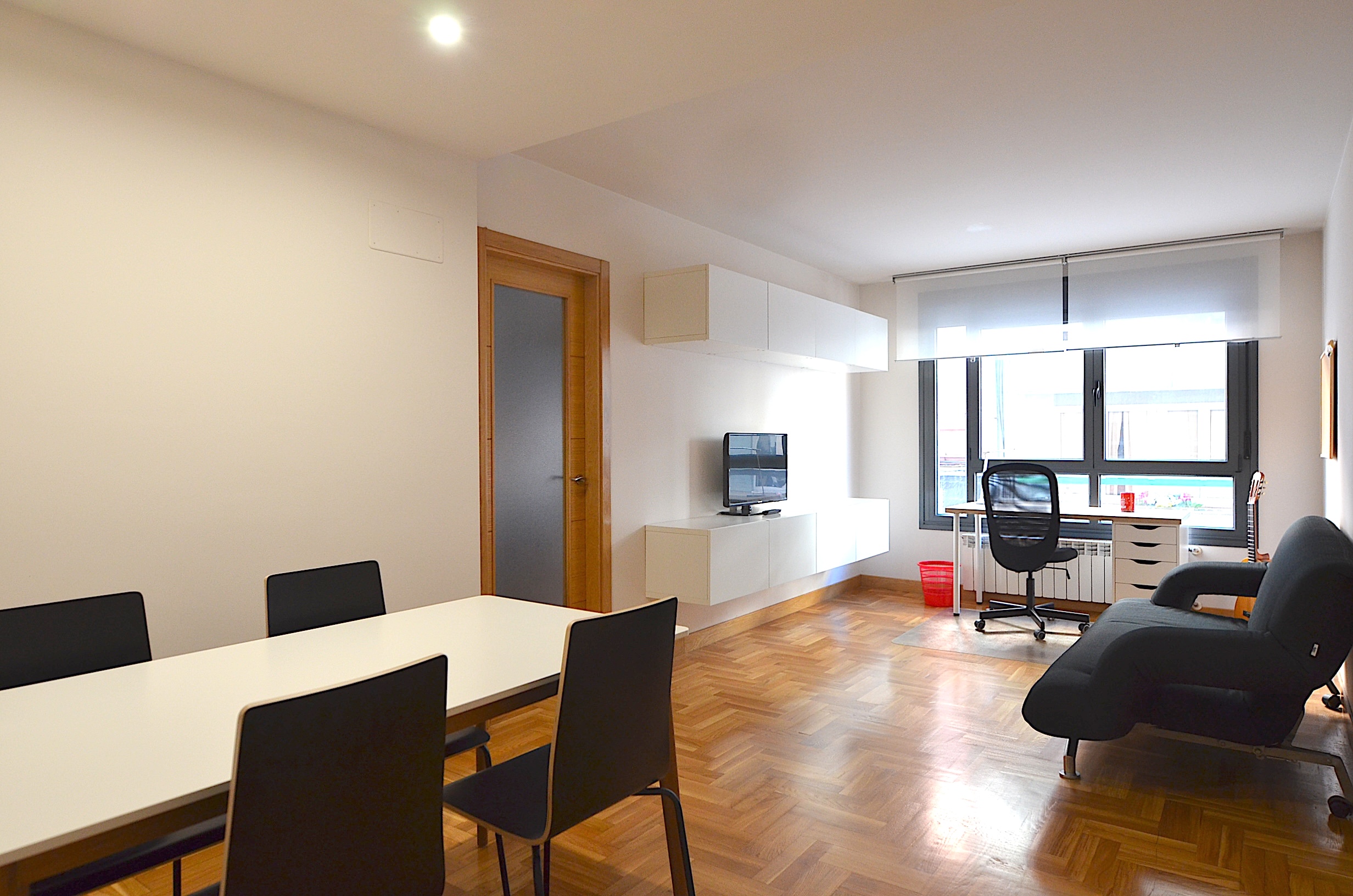Amplio salón-comedor exterior con mesa de estudio, silla ergonomica, estanteria, flexo y corcho. Televisión plana y sofá-cama.