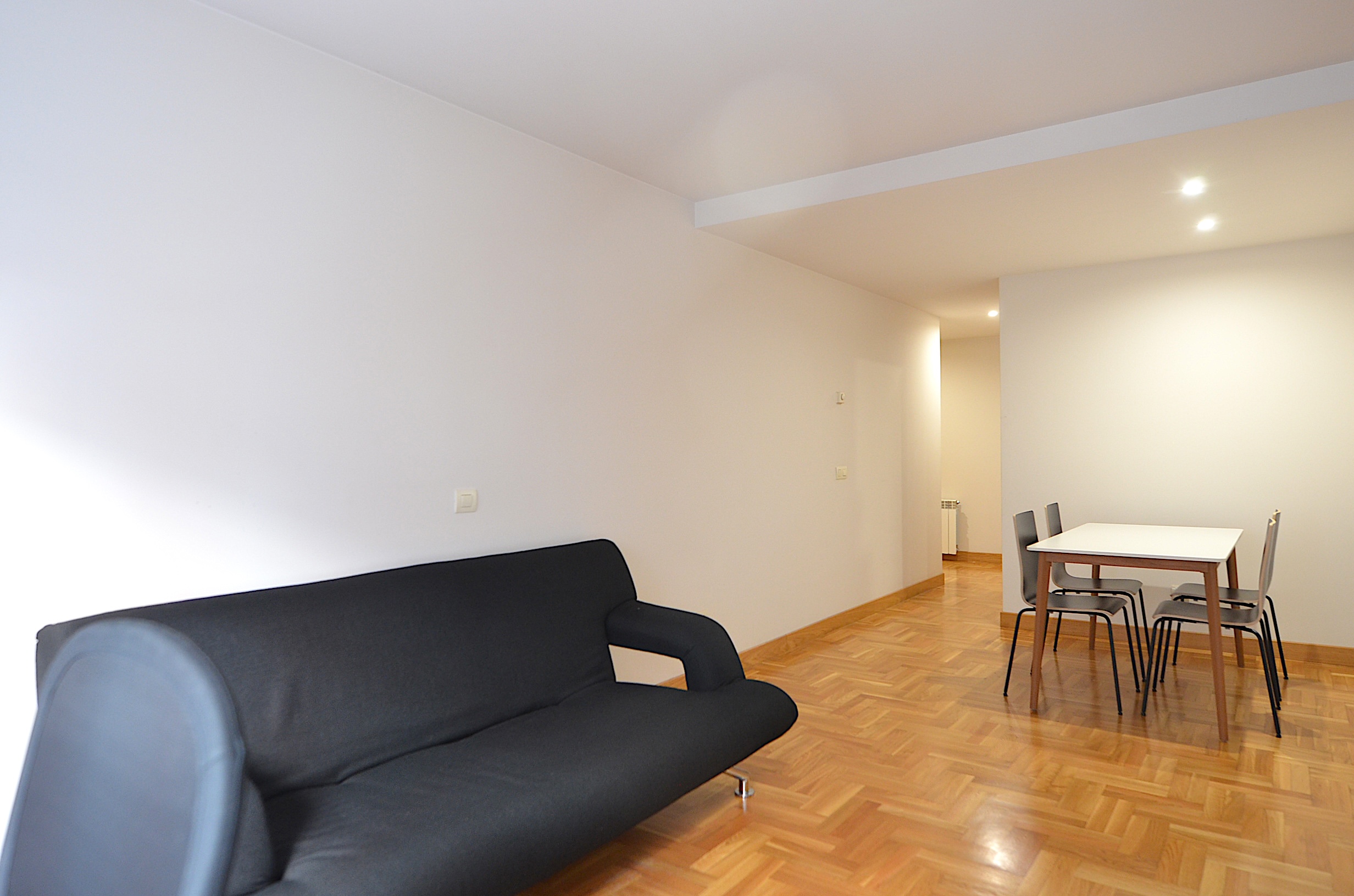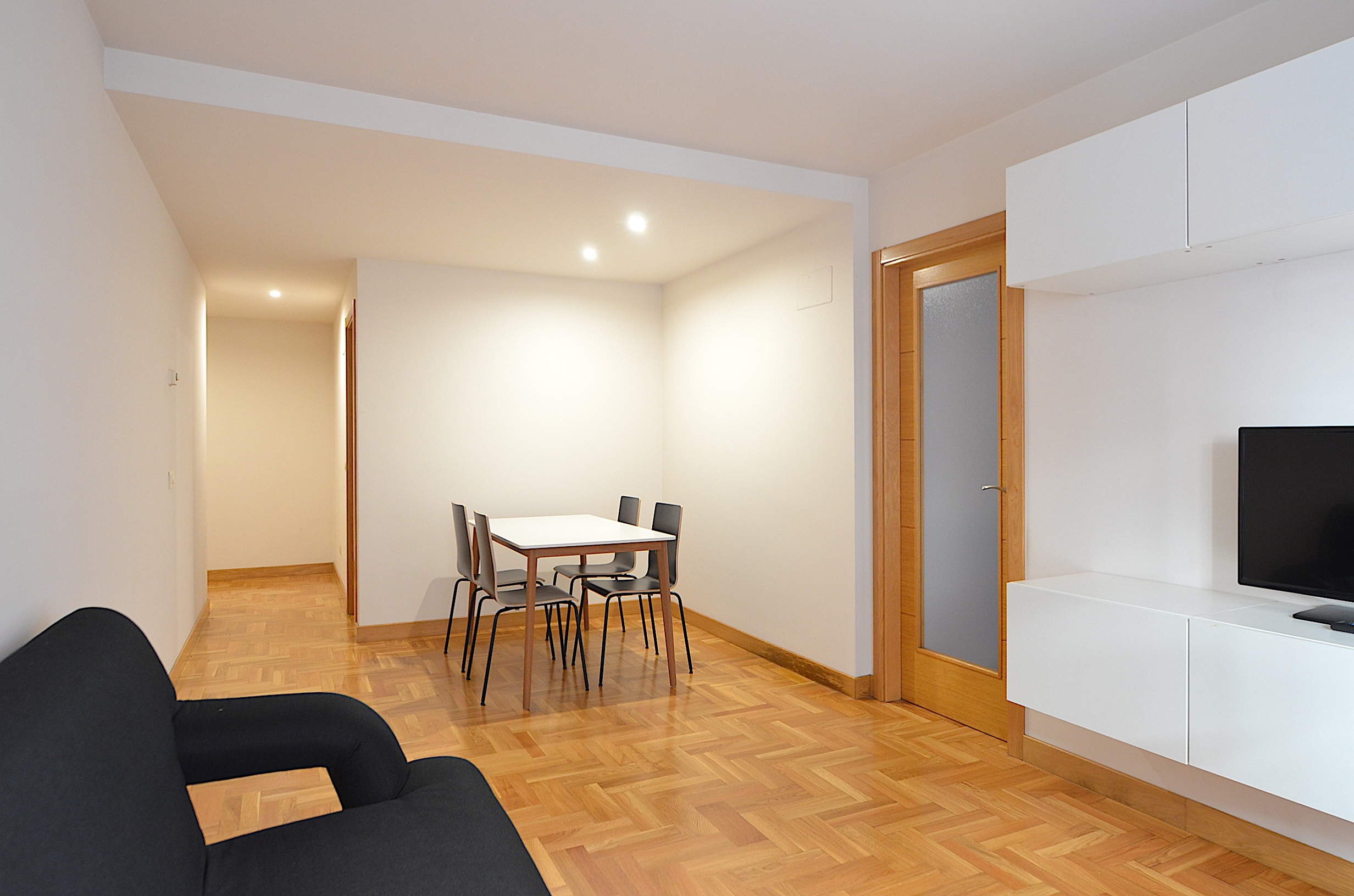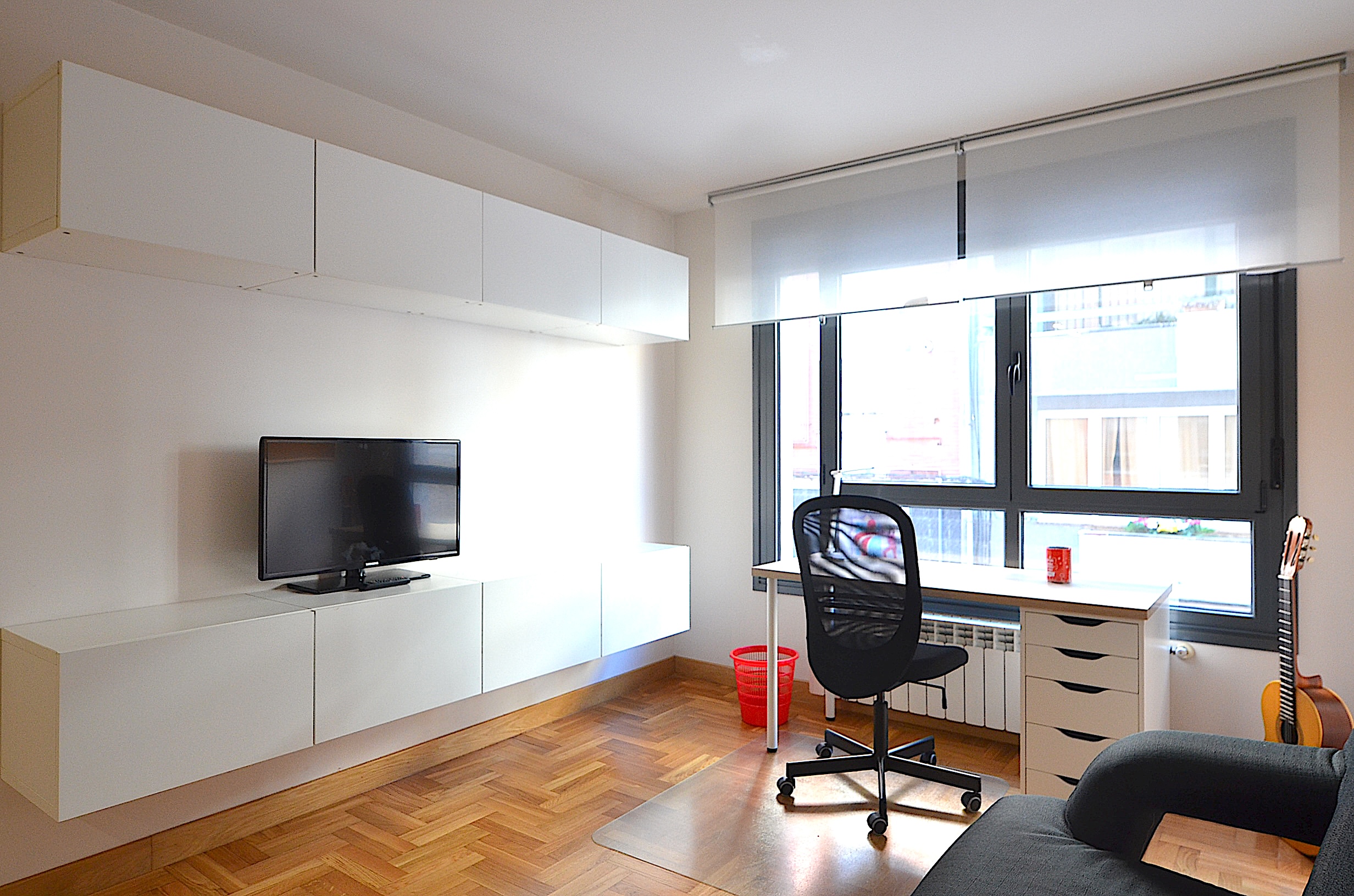 Amplio salón-comedor exterior con mesa de estudio, silla ergonomica, estanteria, flexo y corcho. Televisión plana y sofá-cama.