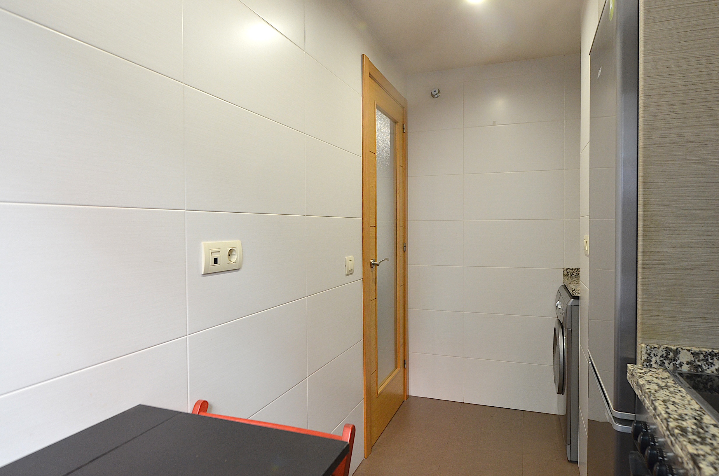 Cocina independiente exterior,con mesa, nevera, horno, placa vitro-ceramica, campana extractora, lavaplatos, lavadora y microondas.