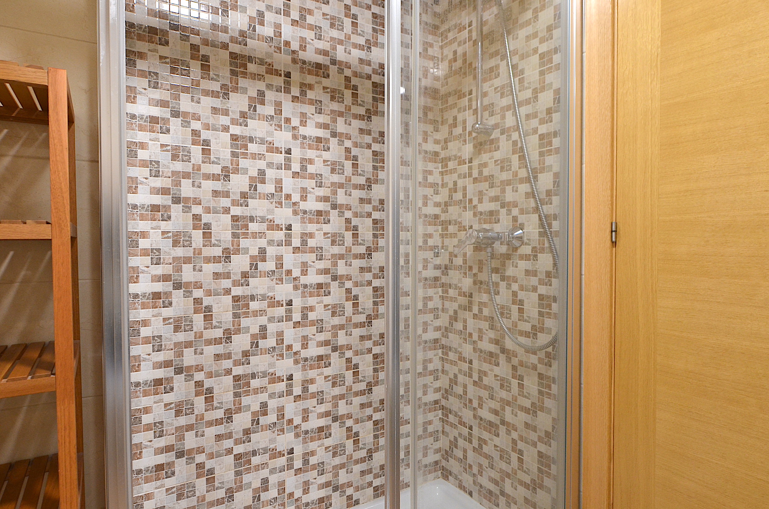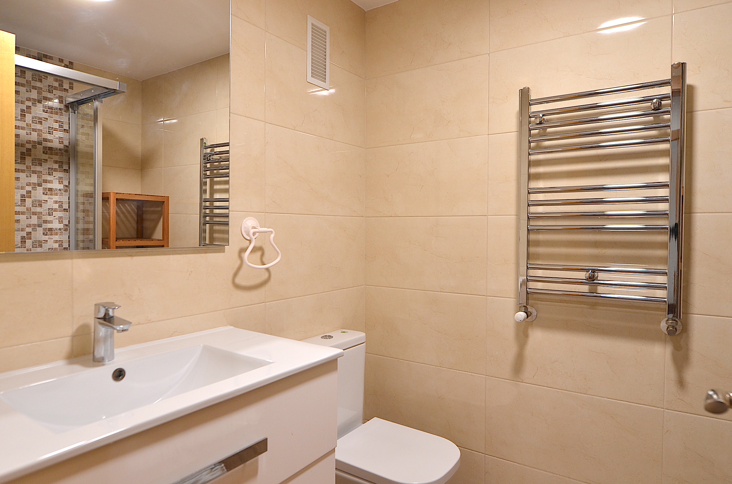 Cuarto de baño completo con plato de ducha, mampara y toallero eléctrico.