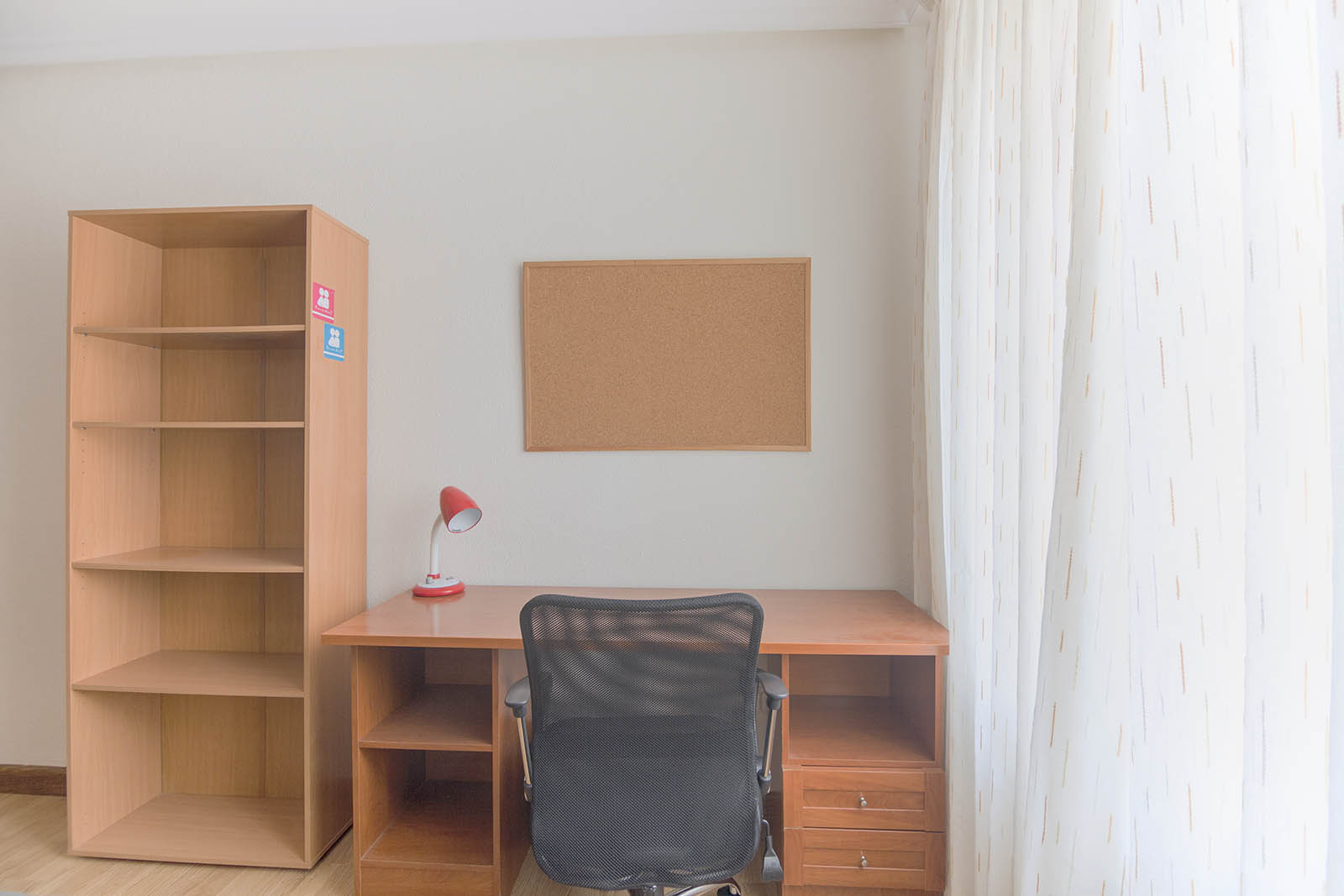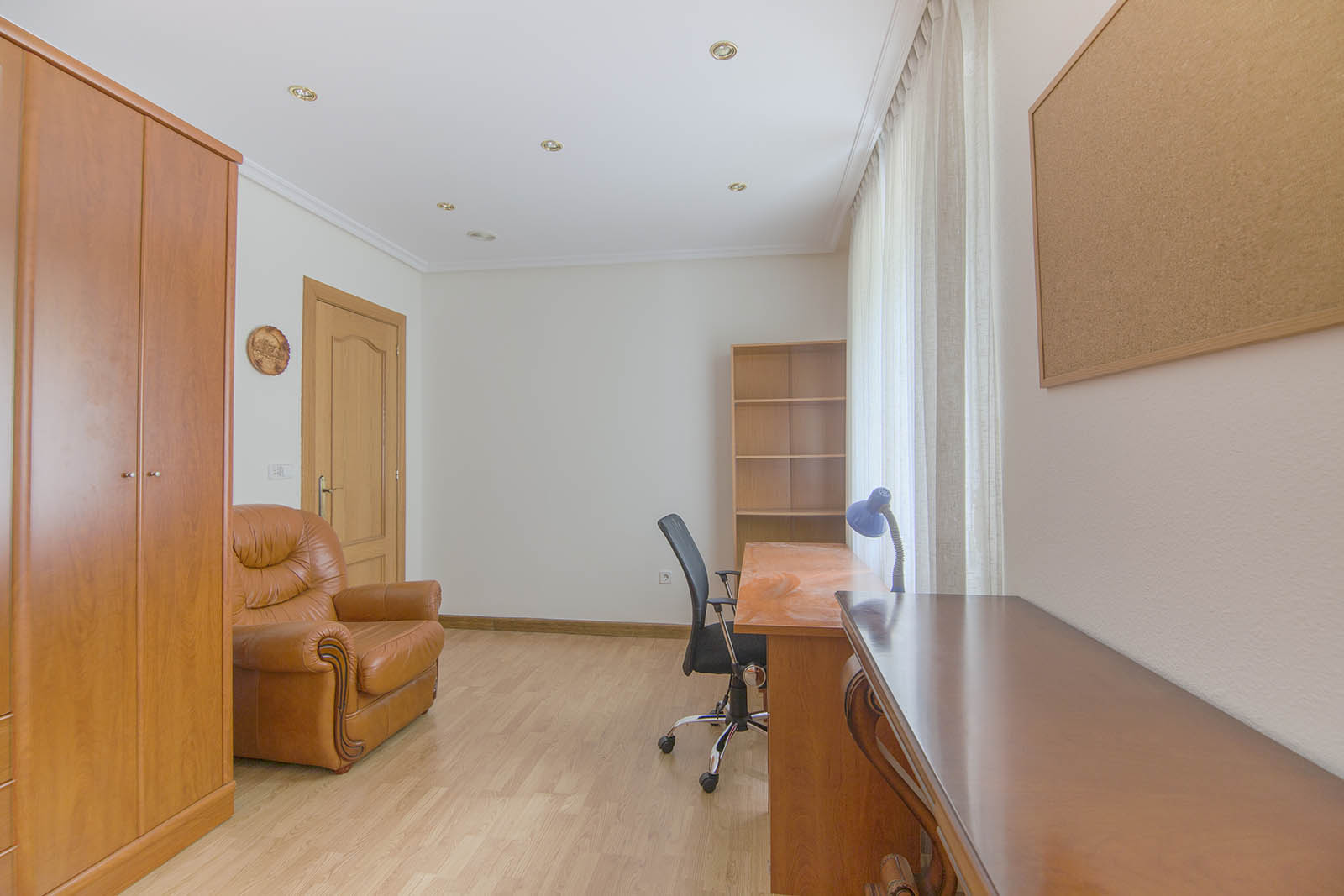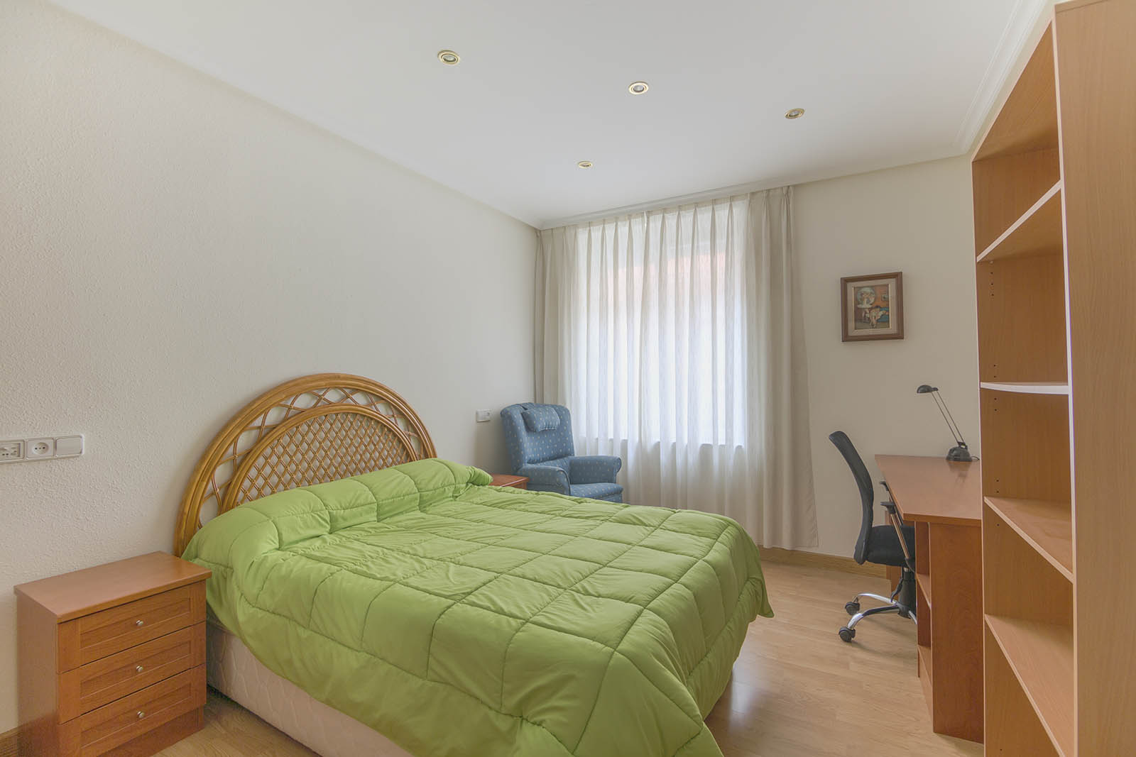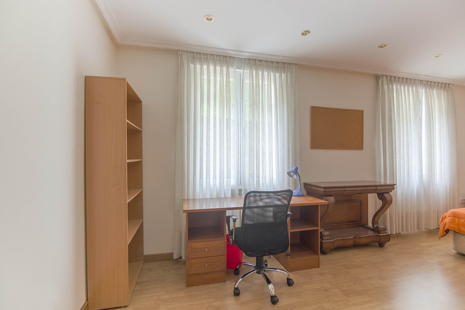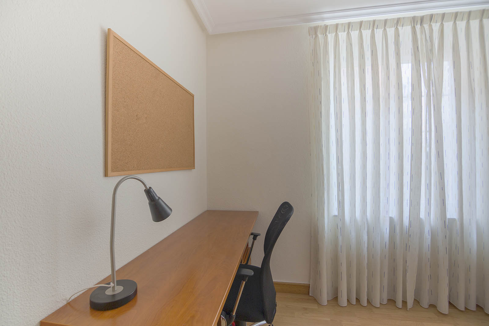 Piso de cuatro habitaciones amplias con cama grande, mesa de estudio y silla ergonóminca.situado en planta calle. Salón amplio con varios sofás.