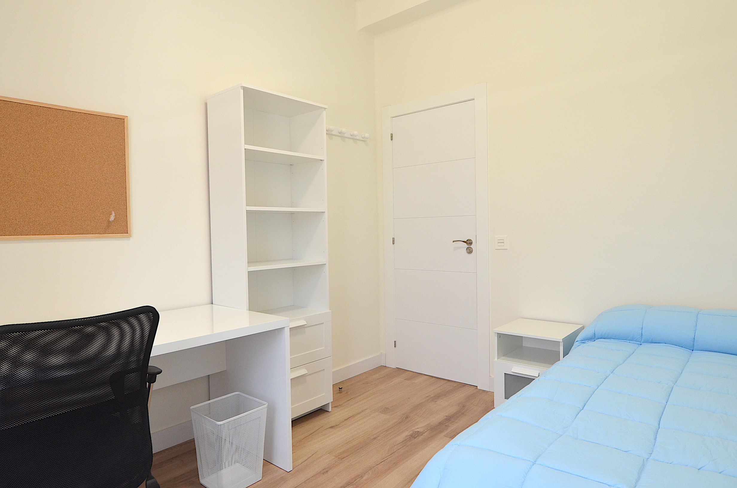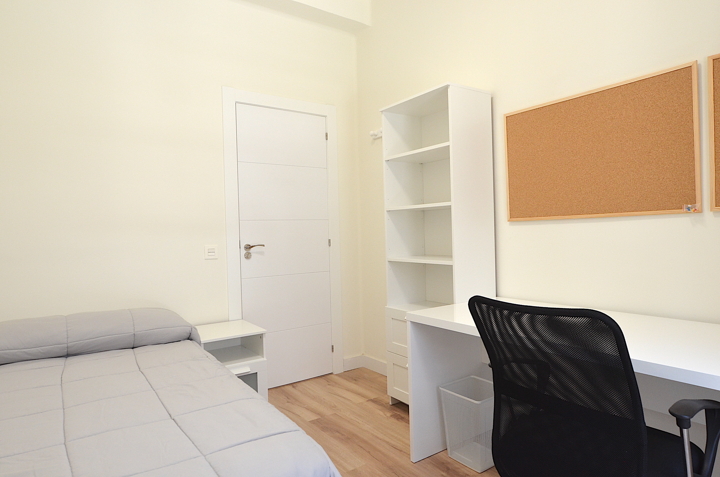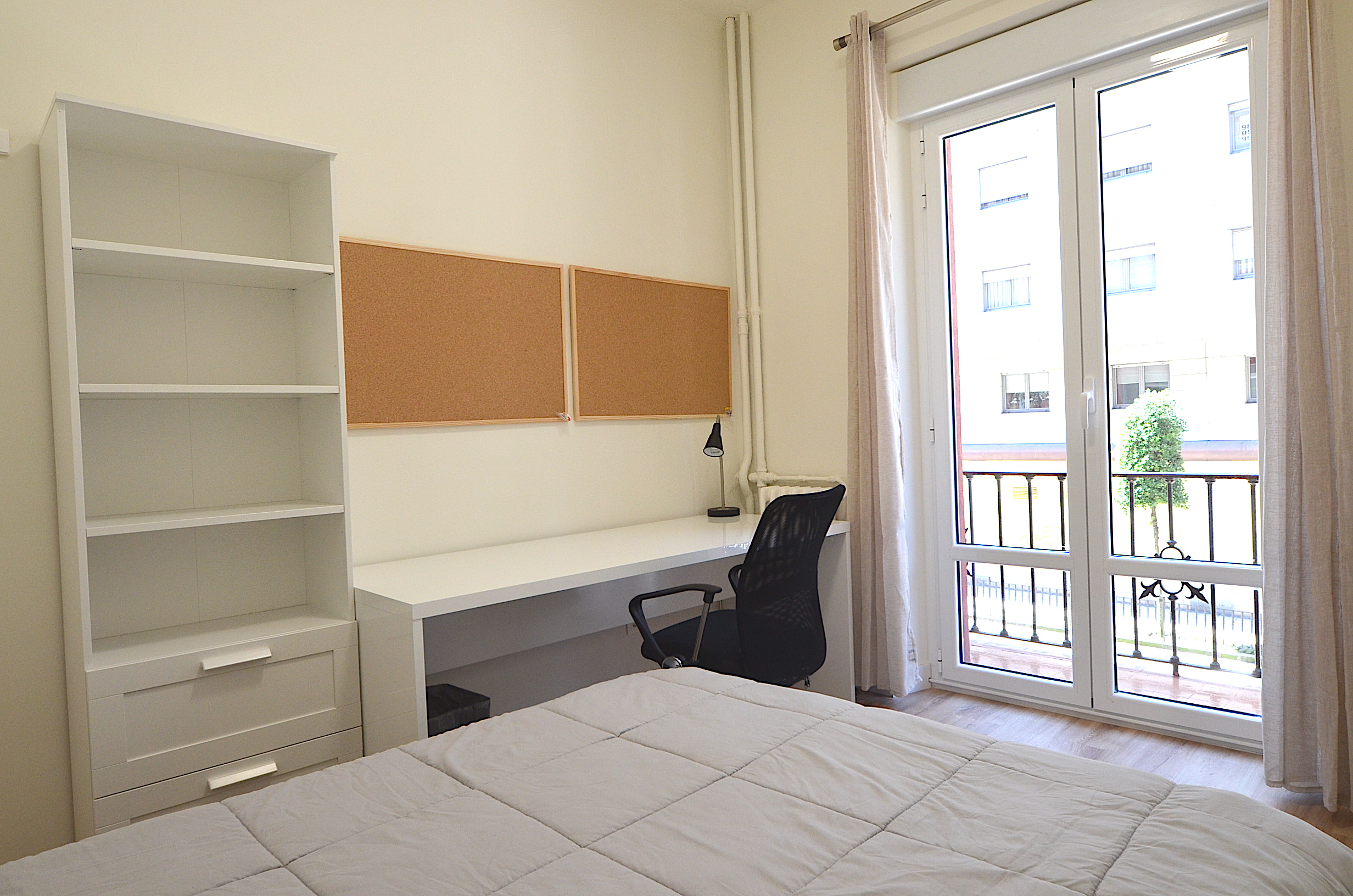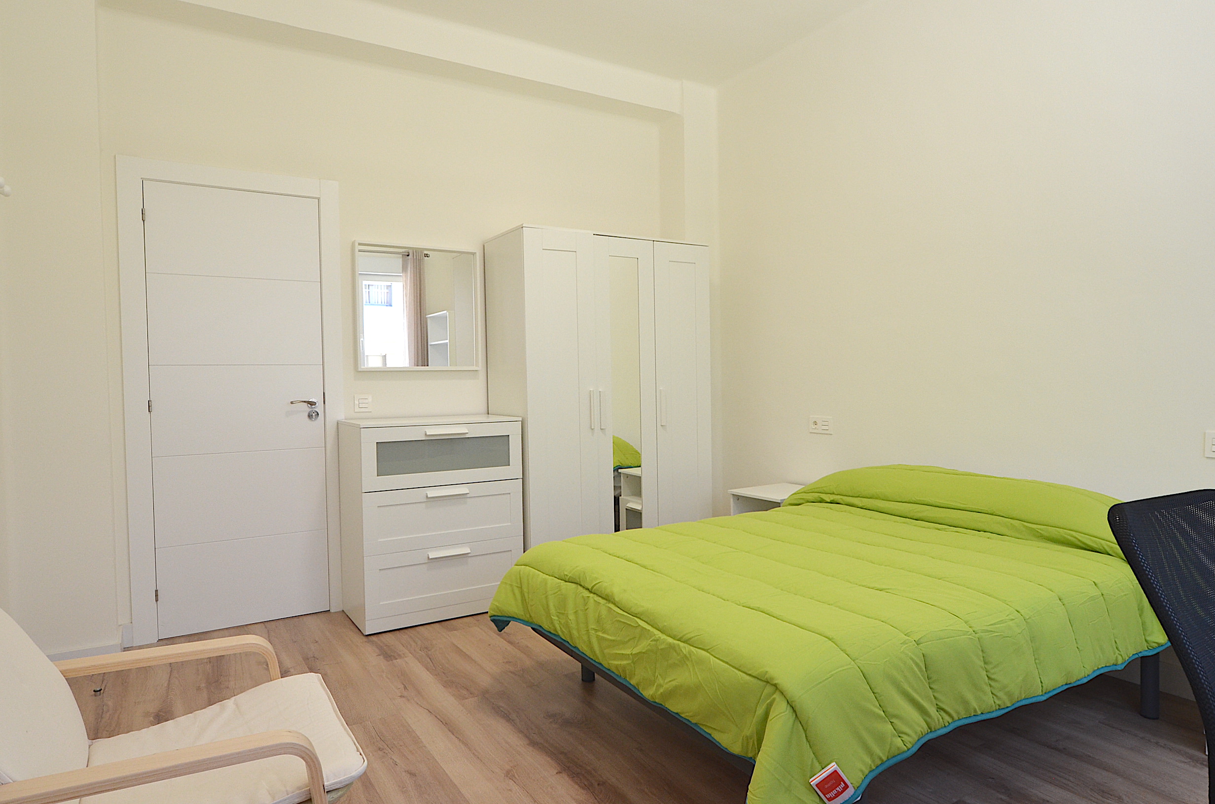 Cuenta con cuatro amplias habitaciones, todas ellas con cama matrimonial, mesa de estudio, estantería, armario ropero, etc. Tres habitaciones exteriores, dos de ellas cuentan con pequeño balcón y/o terraza. La habitación interior es la más grande, con dos ventanas. Dos cuartos de baño completos con ducha de hidromasaje en cada uno.