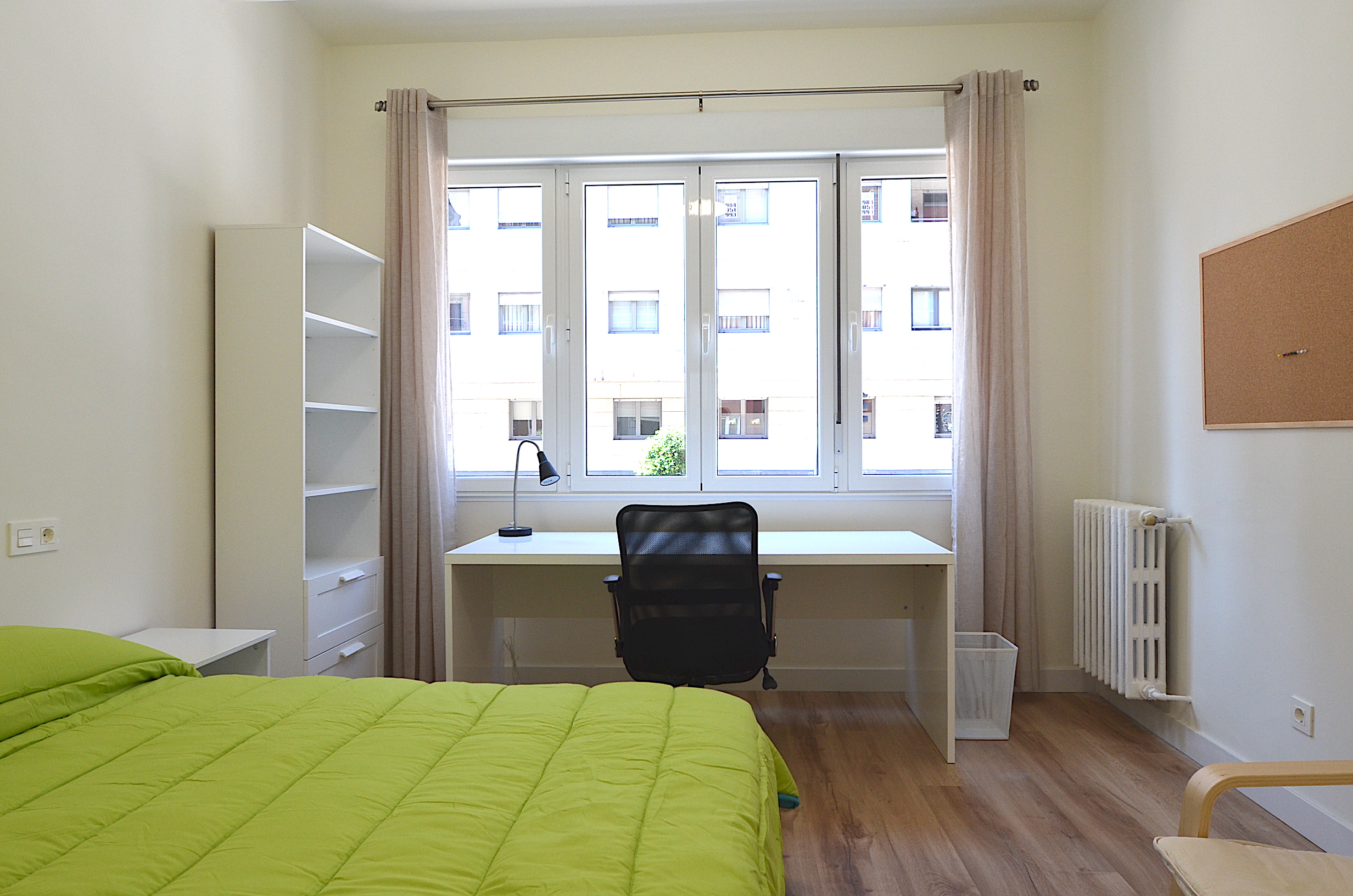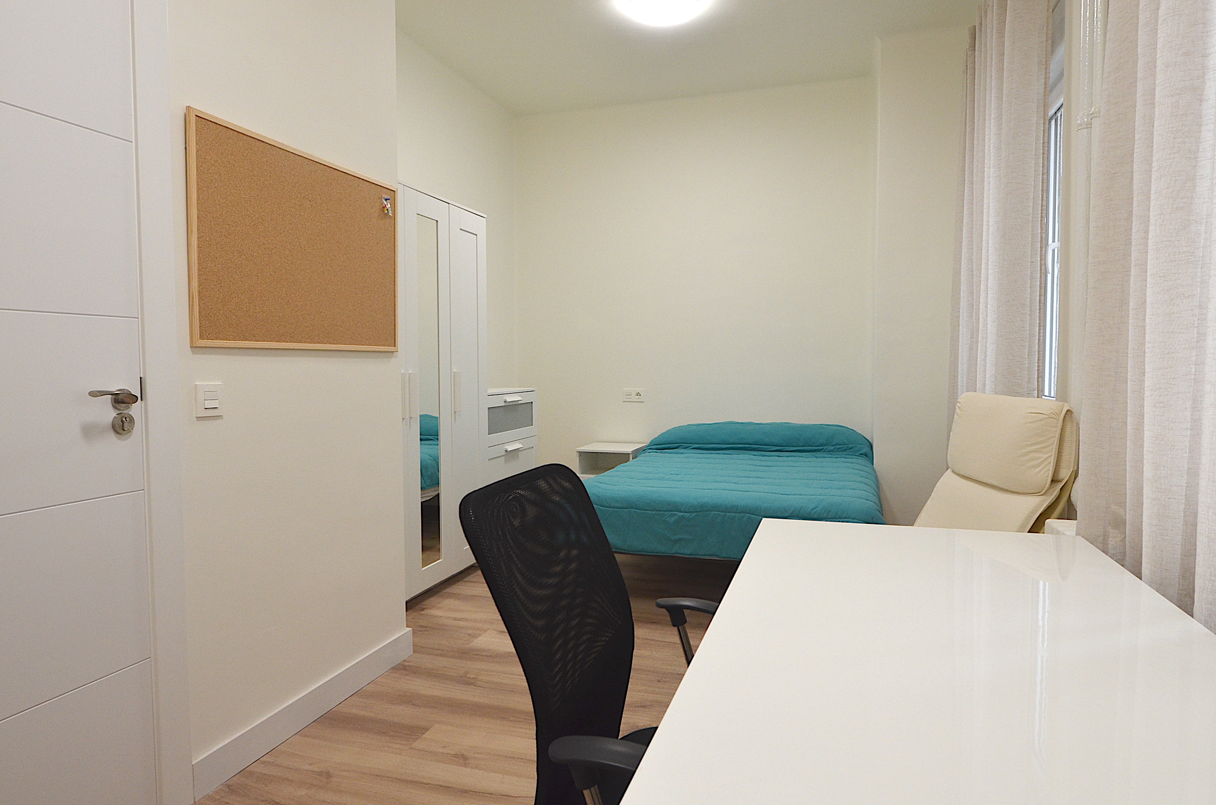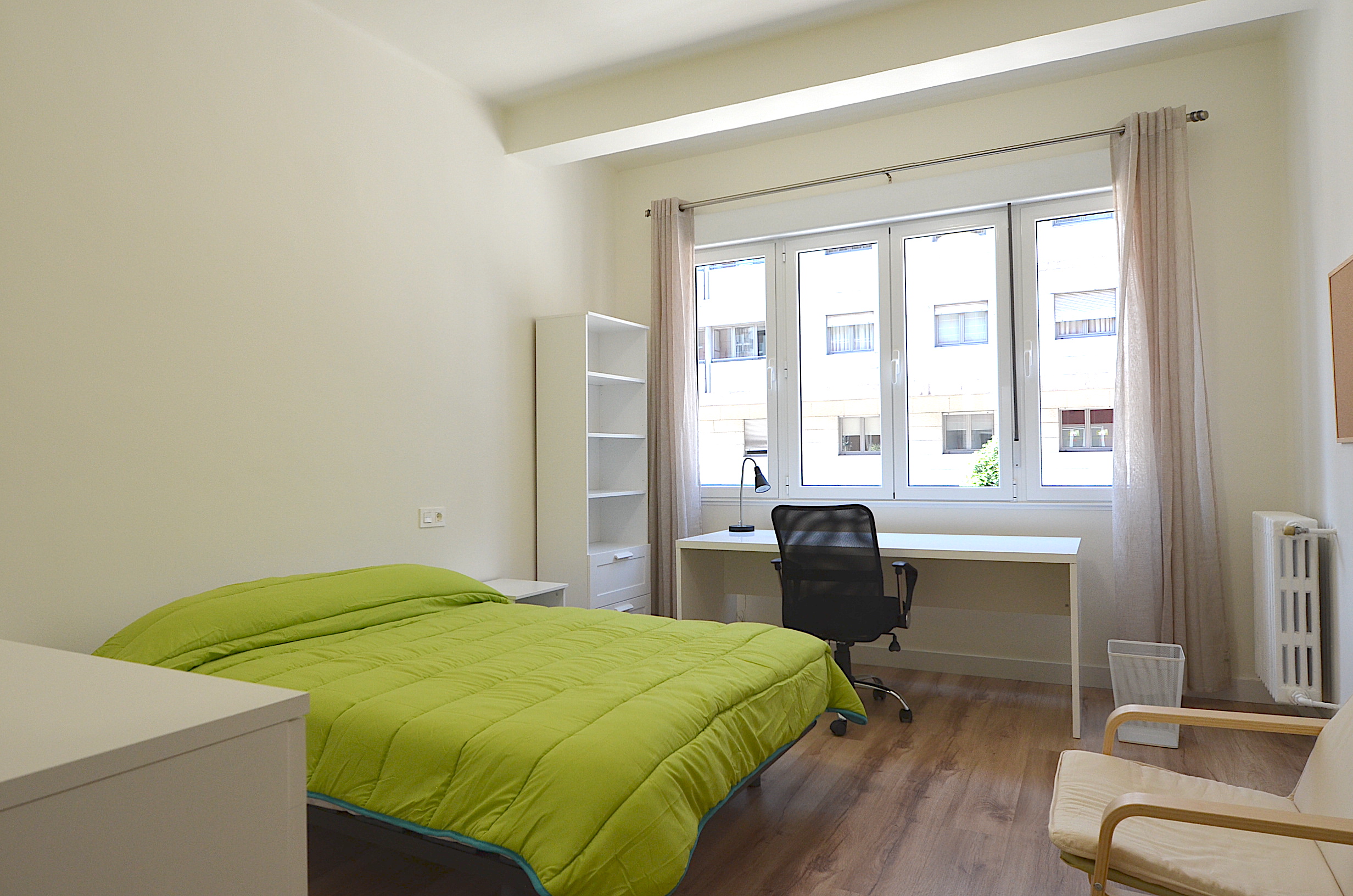 Cuenta con cuatro amplias habitaciones, todas ellas con cama matrimonial, mesa de estudio, estantería, armario ropero, etc. Tres habitaciones exteriores, dos de ellas cuentan con pequeño balcón y/o terraza. La habitación interior es la más grande, con dos ventanas. Dos cuartos de baño completos con ducha de hidromasaje en cada uno.