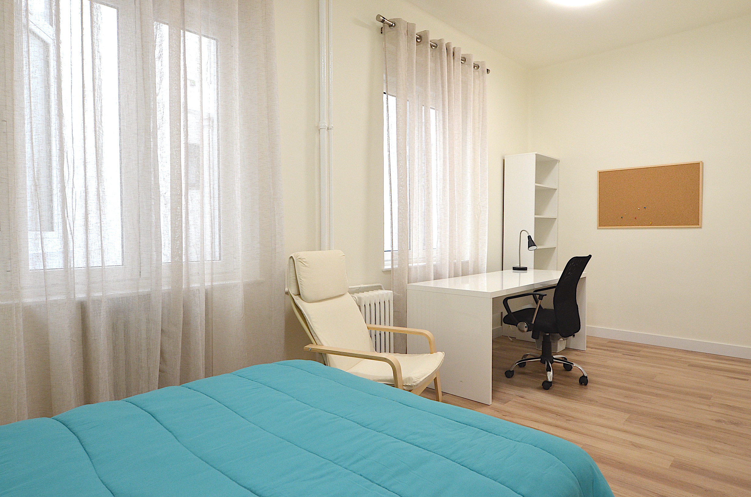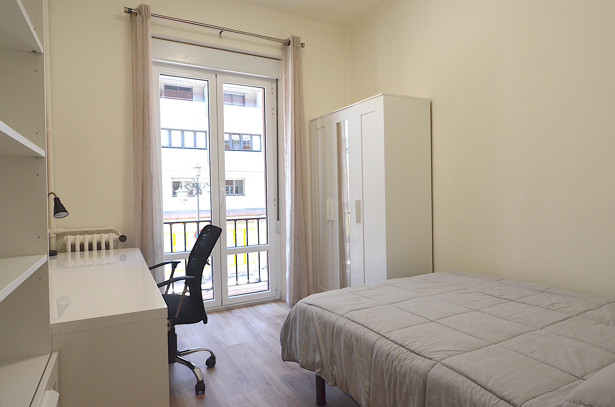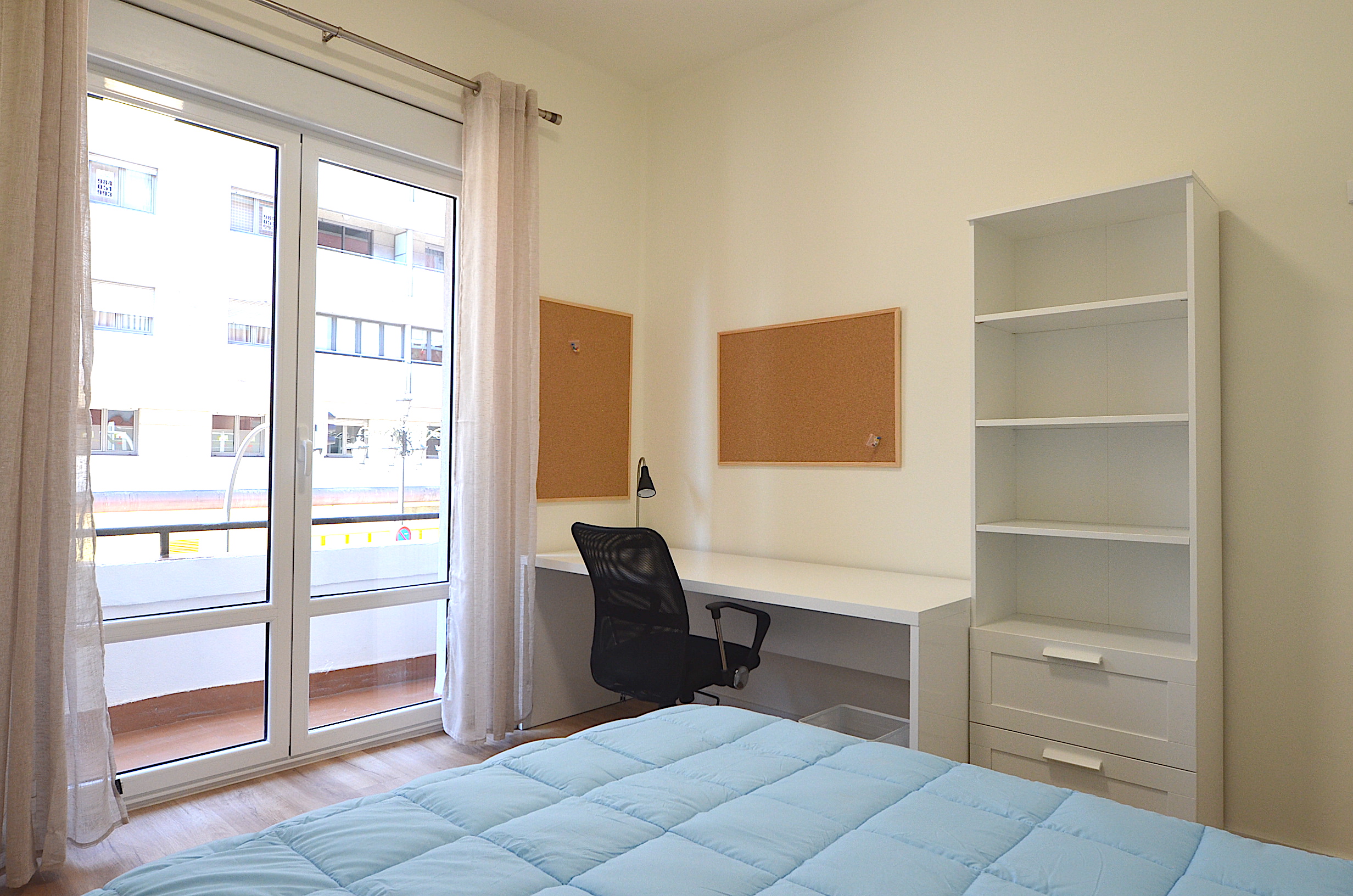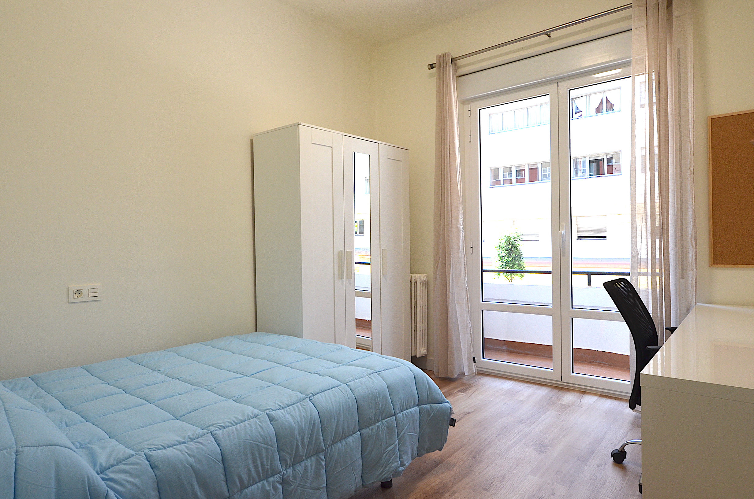 Cuenta con cuatro amplias habitaciones, todas ellas con cama matrimonial, mesa de estudio, estantería, armario ropero, etc. Tres habitaciones exteriores, dos de ellas cuentan con pequeño balcón y/o terraza. La habitación interior es la más grande, con dos ventanas. Dos cuartos de baño completos con ducha de hidromasaje en cada uno.