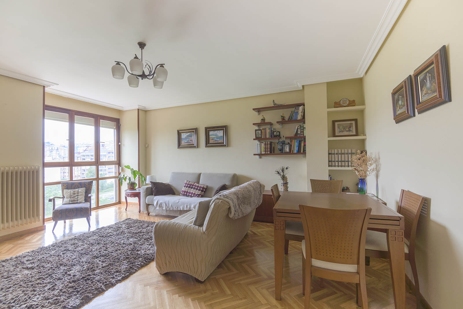 Piso semi-reformado que destaca por su luminosidad y su tranquilidad. Completamente exterior con vistas al Aramo. Cuenta con tres habitaciones y dos cuartos de baño completos.