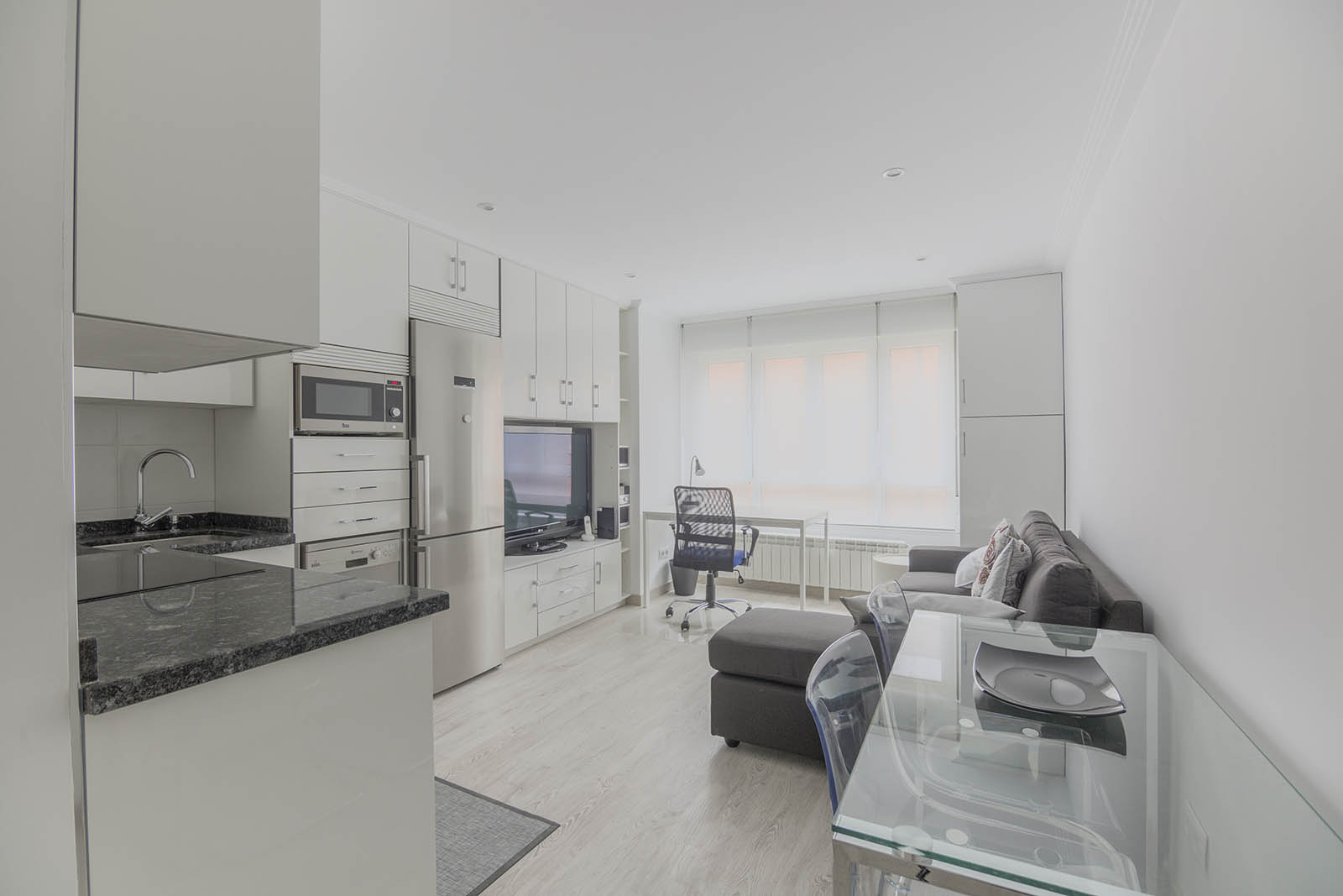 Un hall de entrada divide el apartamento en dos alas. A la derecha salón con cocina americana totalmente equipada y zona de estudio. A la izquierda se encuentra una amplia habitación con baño moderno con calidades de primera.