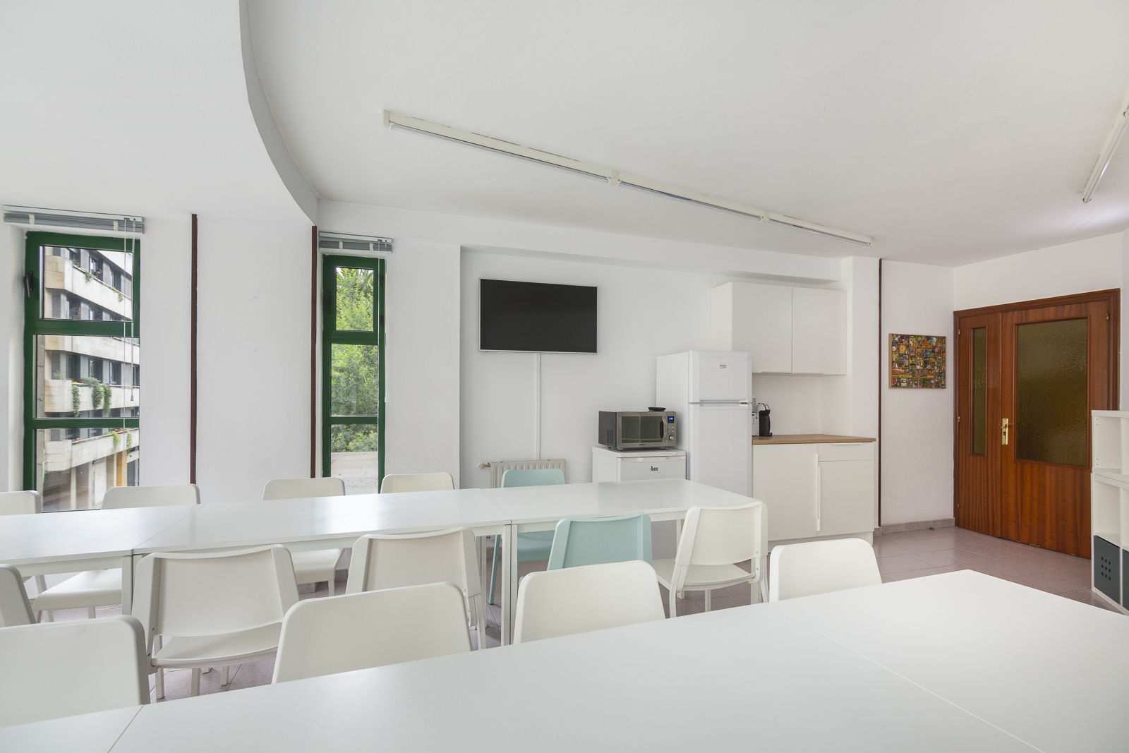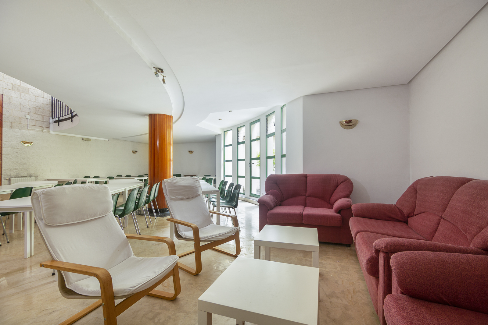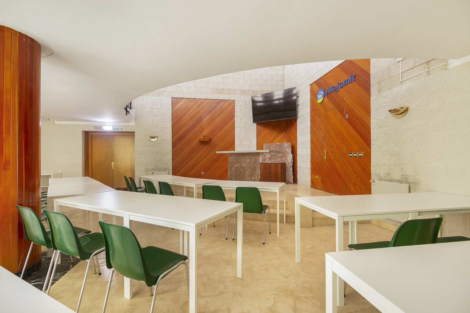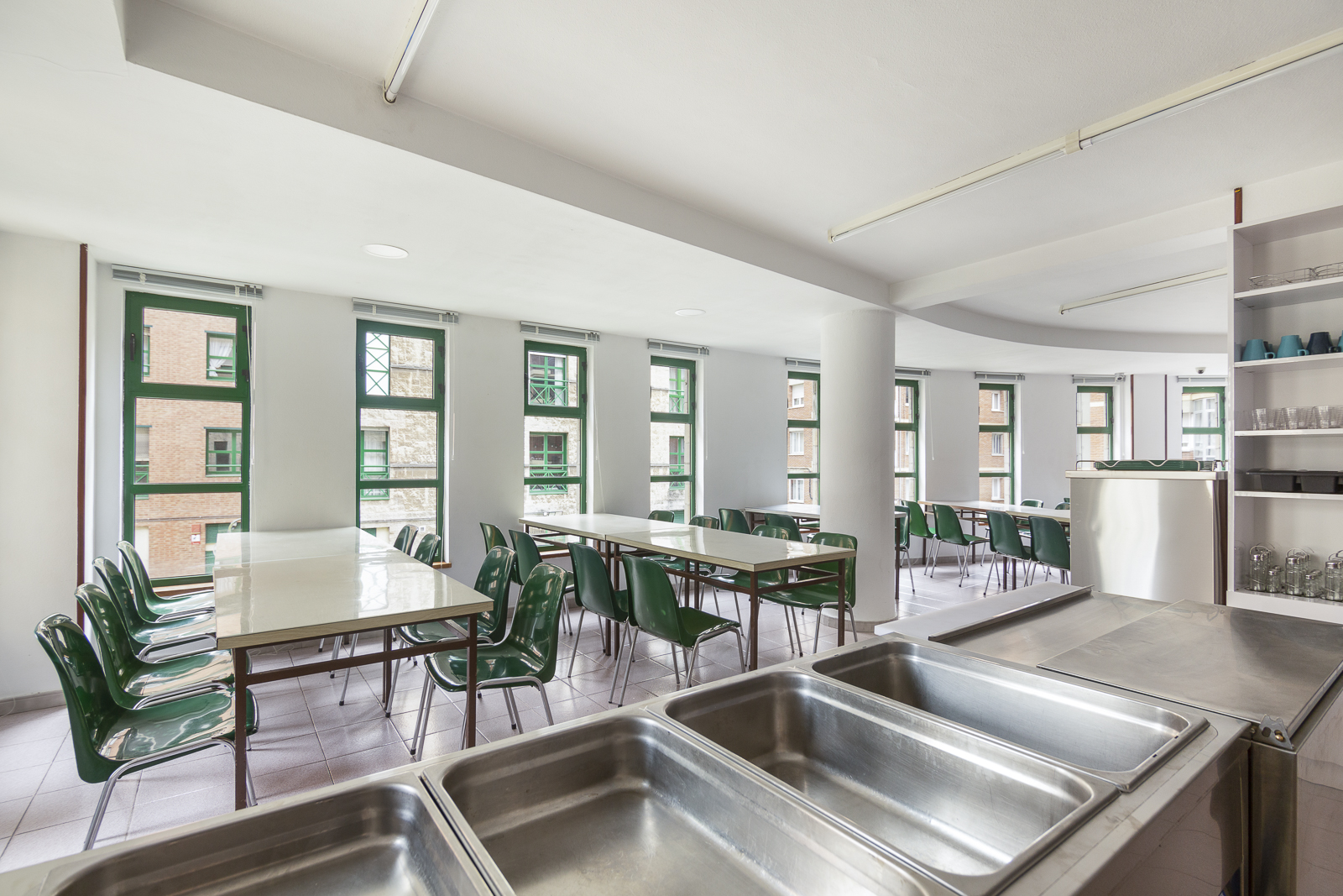En la primera planta se encuentran la recepción, el comedor, la cocina y una sala común con televisión. En el resto de plantas estan las habitaciones y las salas de estudio.