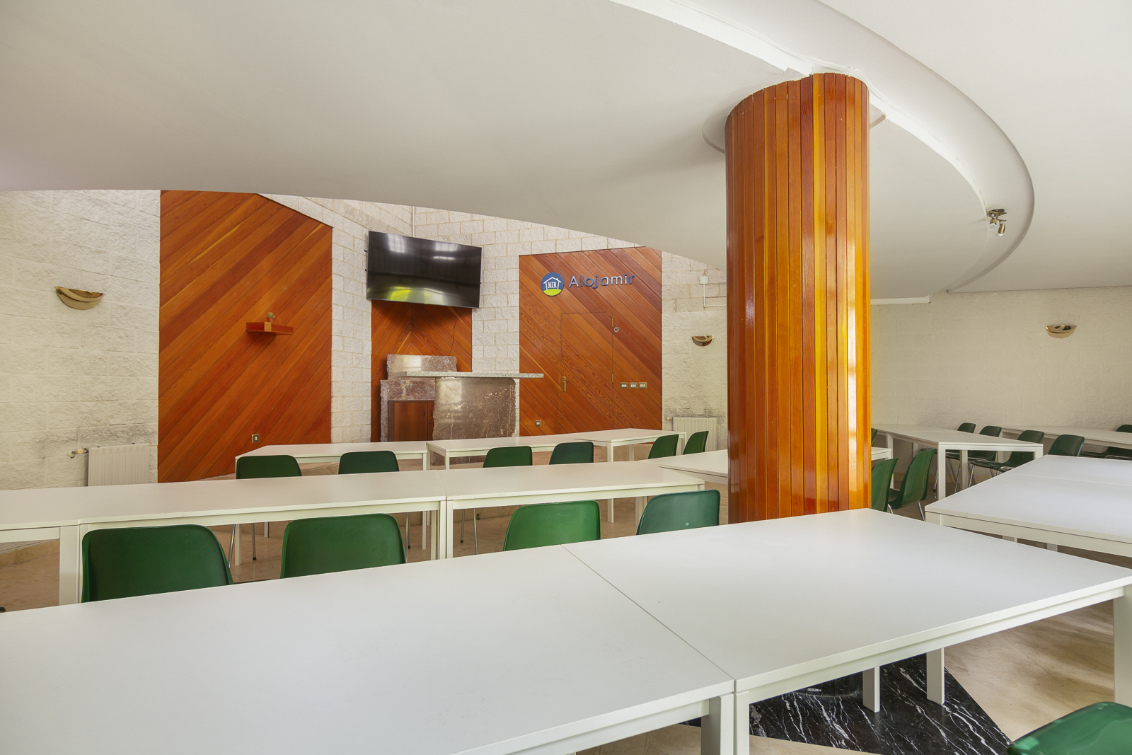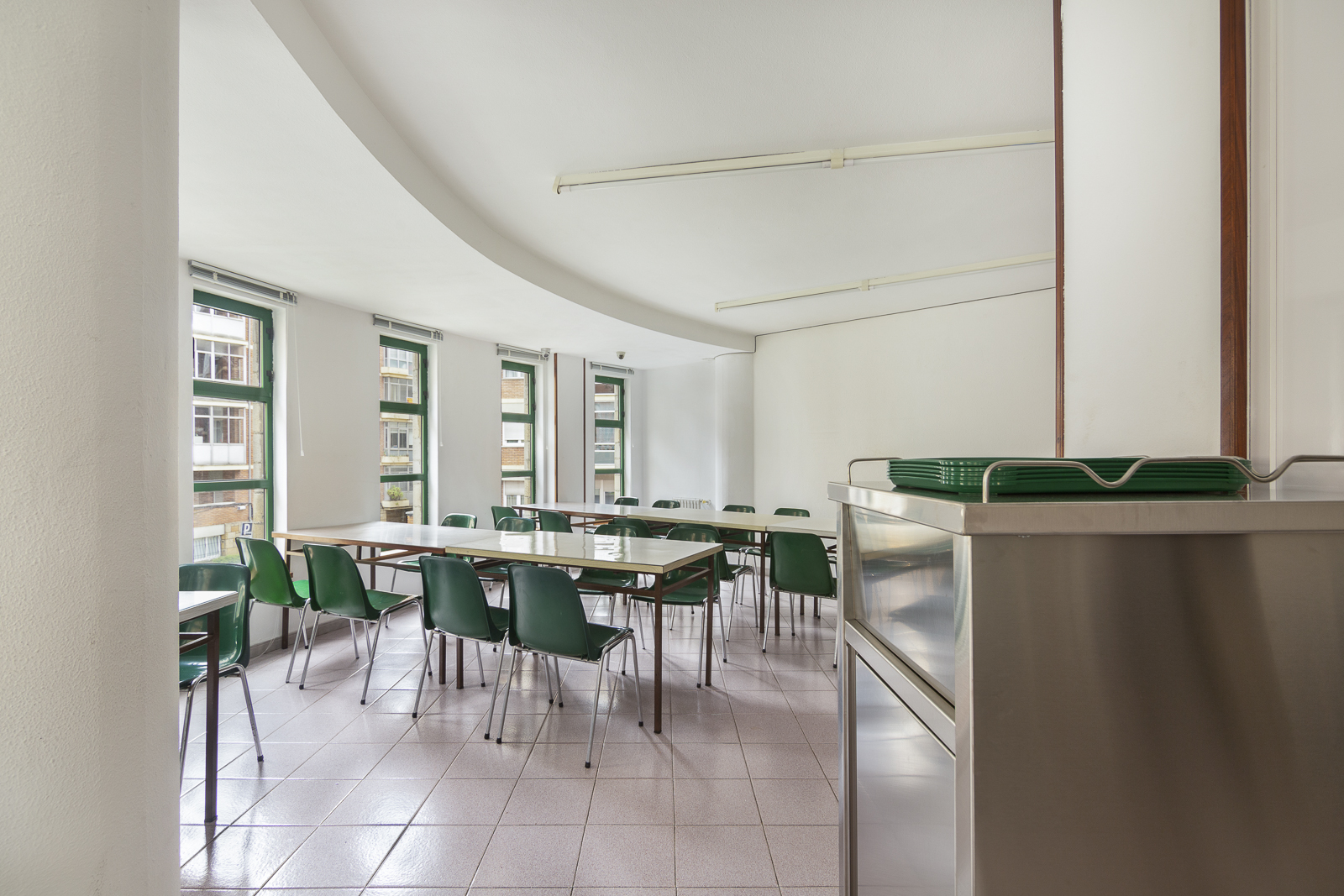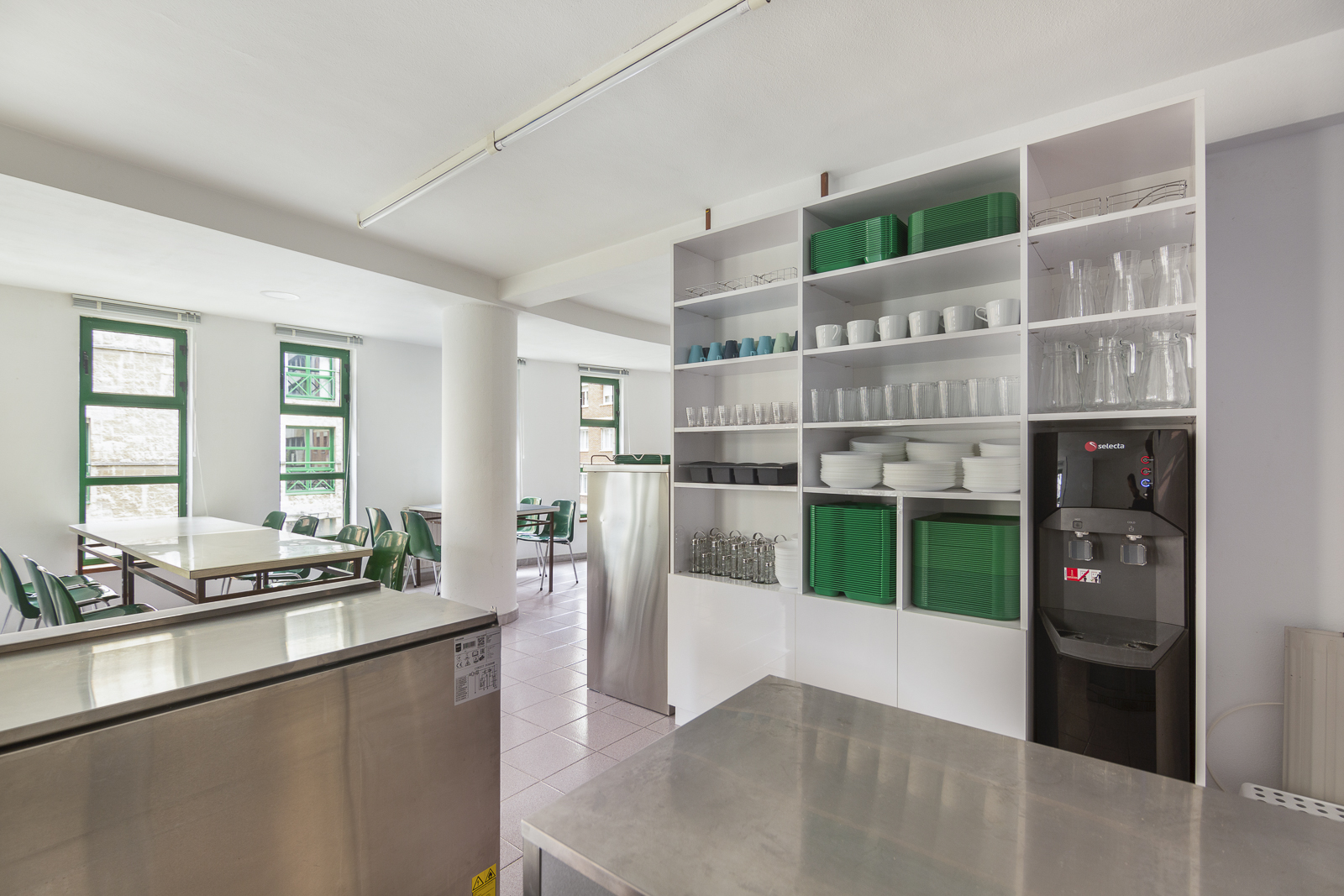 En la primera planta se encuentran la recepción, el comedor, la cocina y una sala común con televisión. En el resto de plantas estan las habitaciones y las salas de estudio.