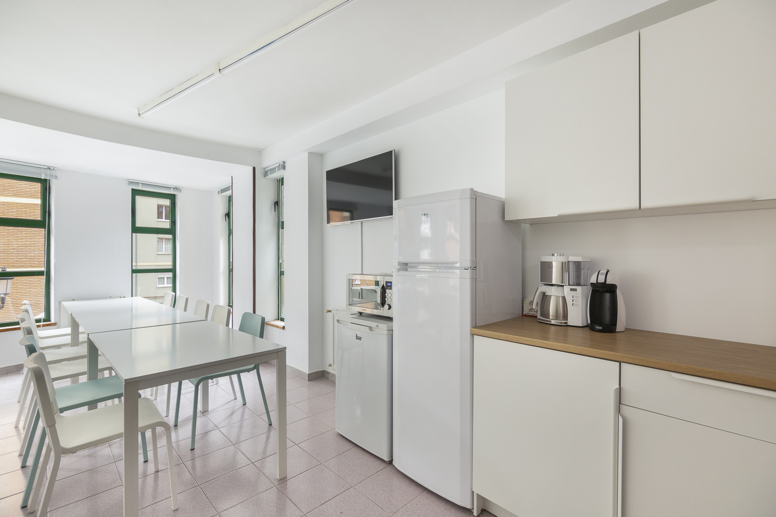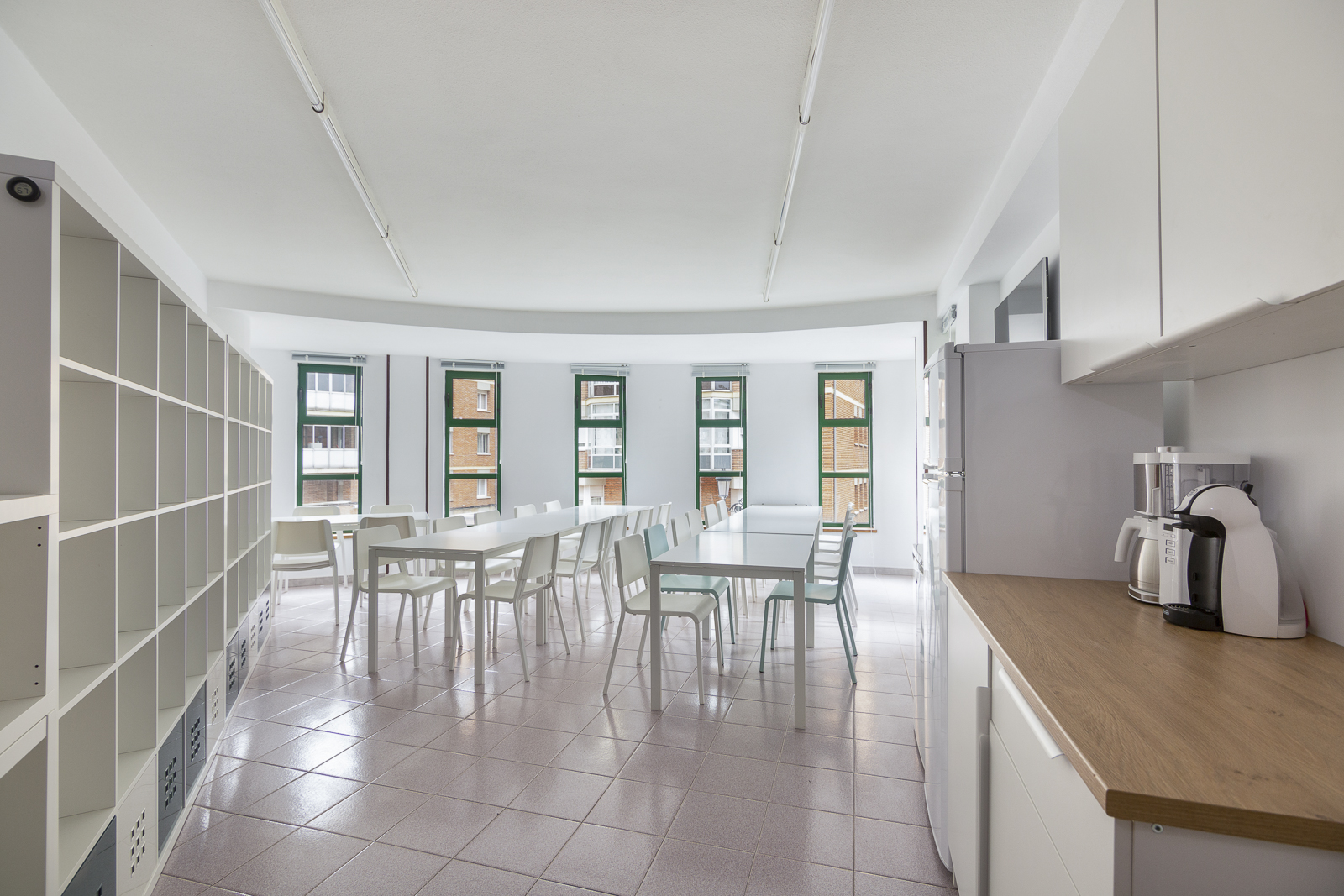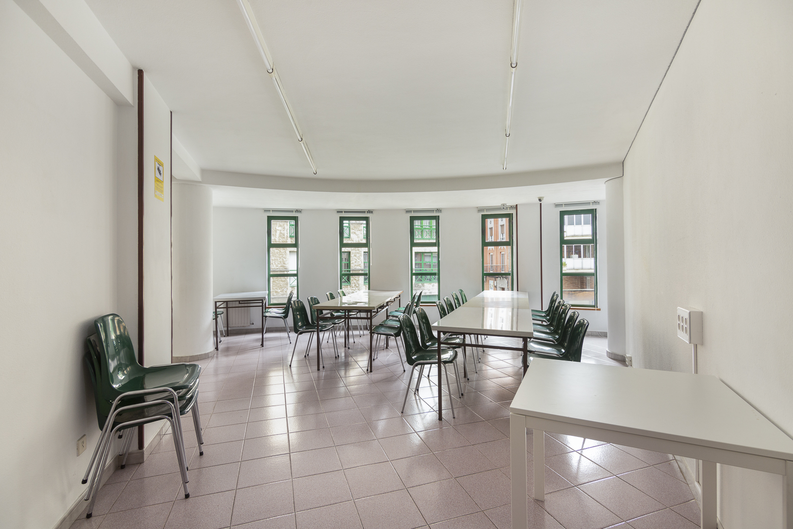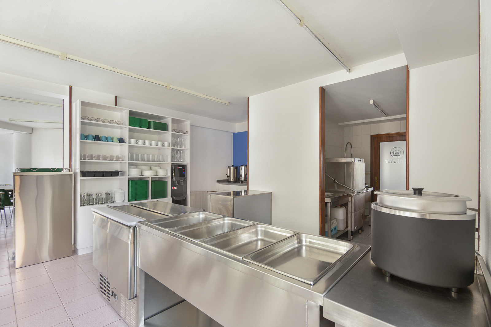 En la primera planta se encuentran la recepción, el comedor, la cocina y una sala común con televisión. En el resto de plantas estan las habitaciones y las salas de estudio.