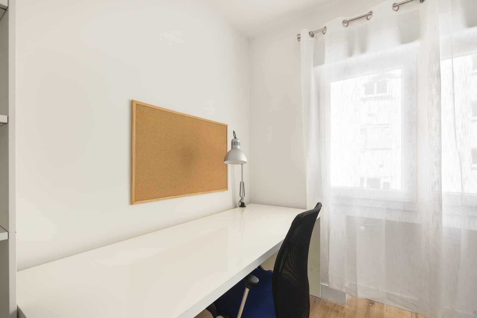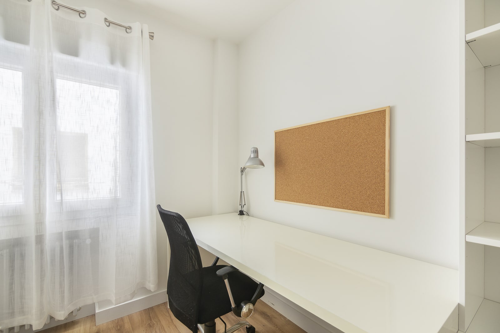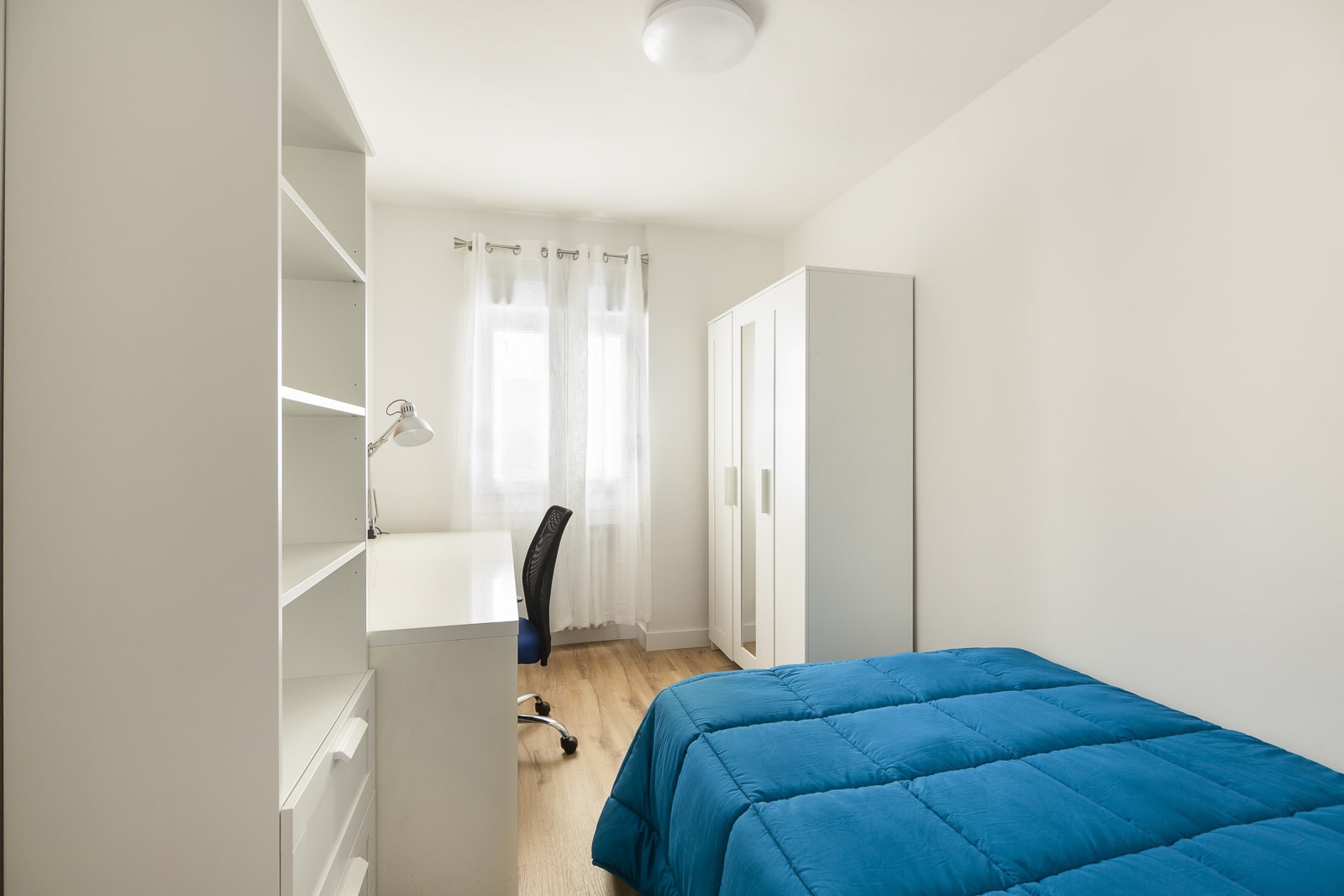 Todas las habitaciones disponen de mobiliario perfectamente adaptado al estudio: mesa grande de estudio, silla ergonómica, flexo con bombilla led de gran luminosidad, corcho para apuntes, estantería para almacenaje de libros, y también un armario de tres puertas, una cómoda, mesita, y papelera. Dispone de dos camas dobles de 1,35cm y una cama doble de 1,20cm. También proporcionamos ropa de cama y un juego de toallas.