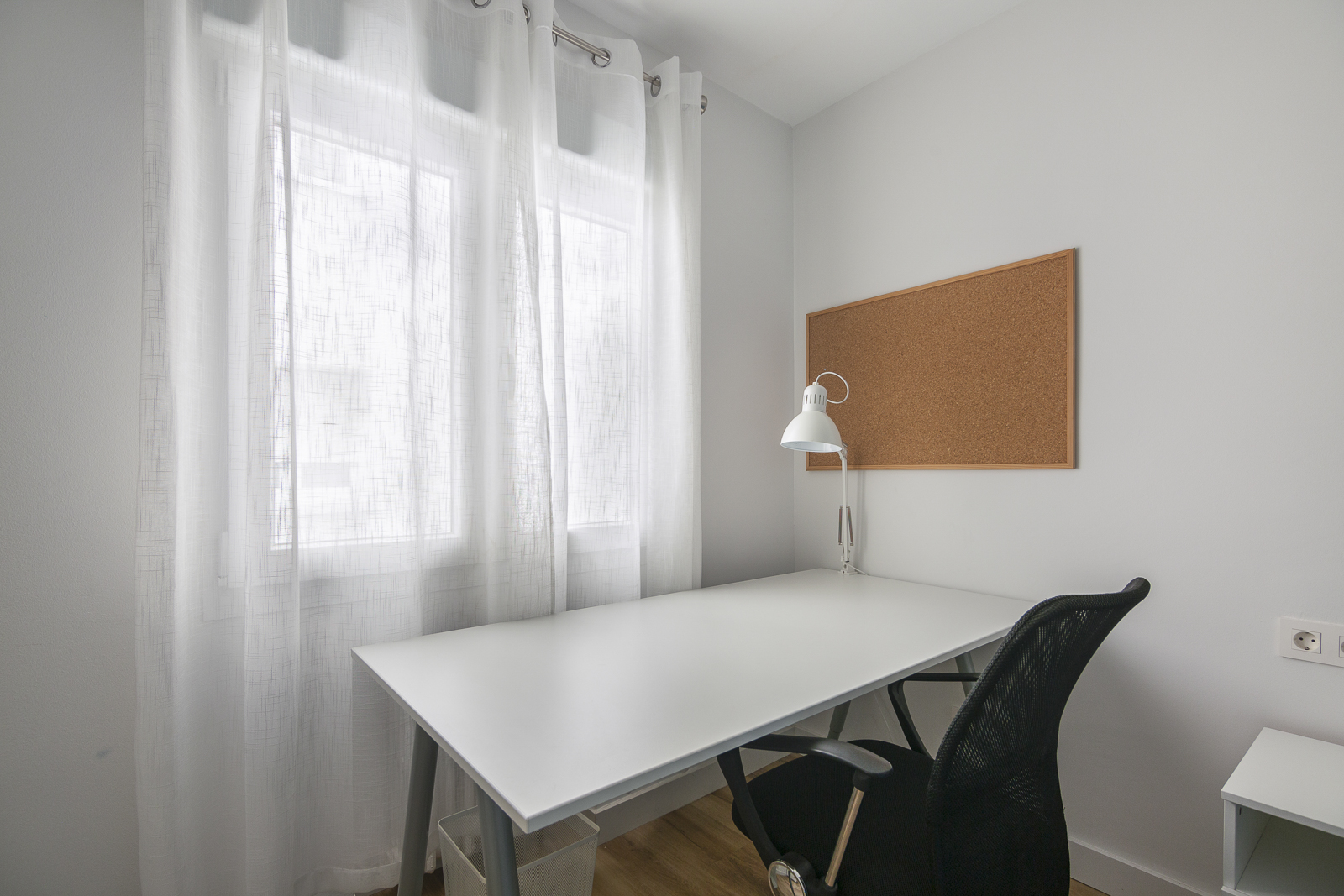 Todas las habitaciones disponen de mobiliario perfectamente adaptado al estudio: mesa grande de estudio, silla ergonómica, flexo con bombilla led de gran luminosidad, corcho para apuntes, estantería para almacenaje de libros, y también un armario de tres puertas, una cómoda, mesita, y papelera. Dispone de tres camas dobles de 1,35cm. También proporcionamos ropa de cama y un juego de toallas.