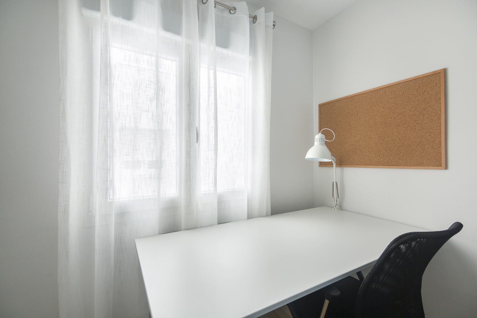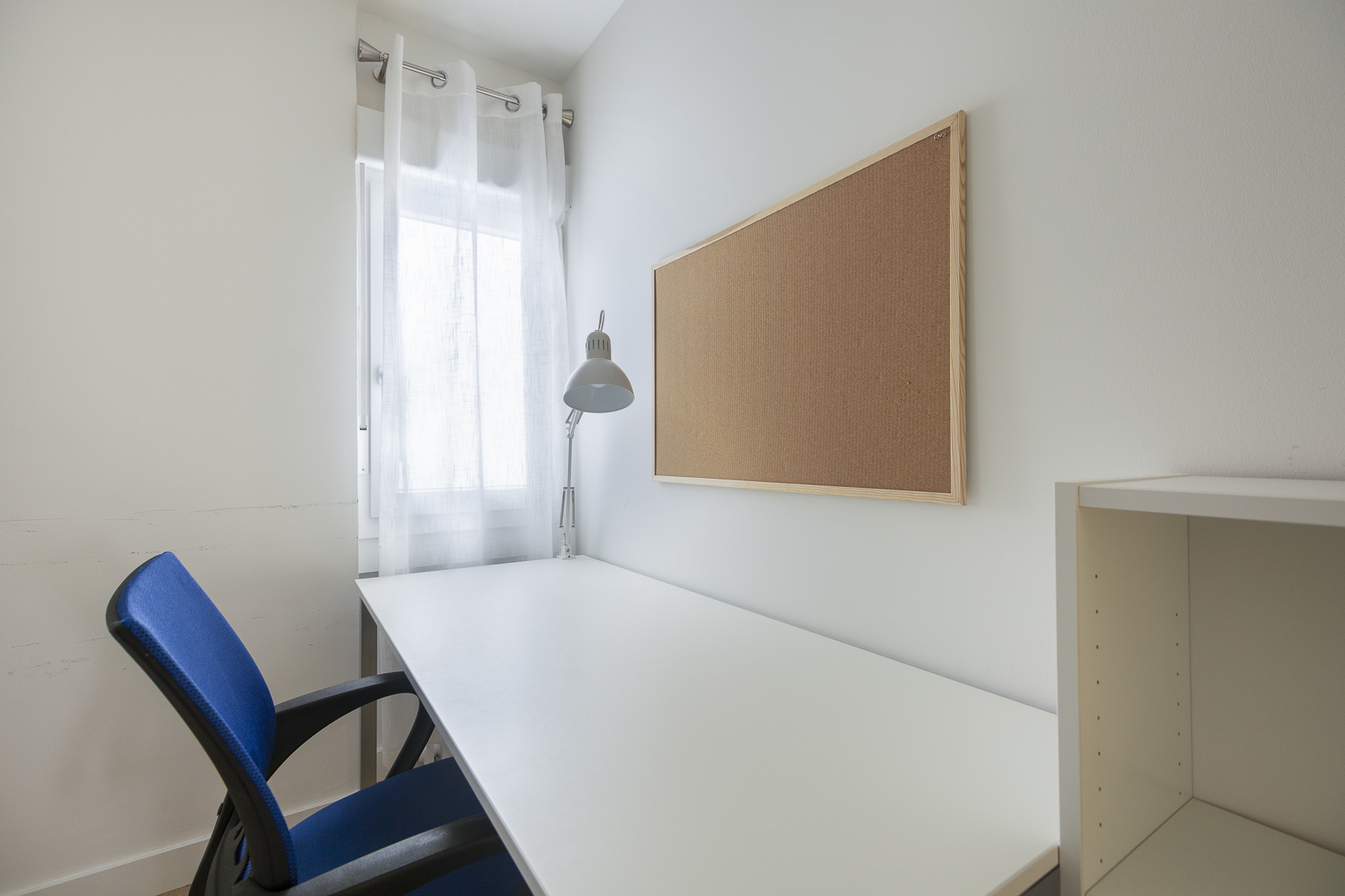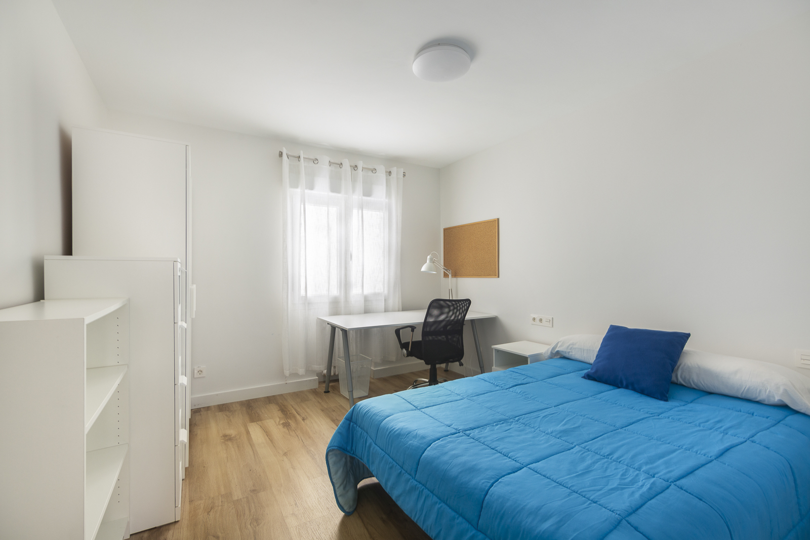 Todas las habitaciones disponen de mobiliario perfectamente adaptado al estudio: mesa grande de estudio, silla ergonómica, flexo con bombilla led de gran luminosidad, corcho para apuntes, estantería para almacenaje de libros, y también un armario de tres puertas, una cómoda, mesita, y papelera. Dispone de dos camas dobles de 1,35cm y otra cama individual de 1,05cm. También proporcionamos ropa de cama y un juego de toallas.