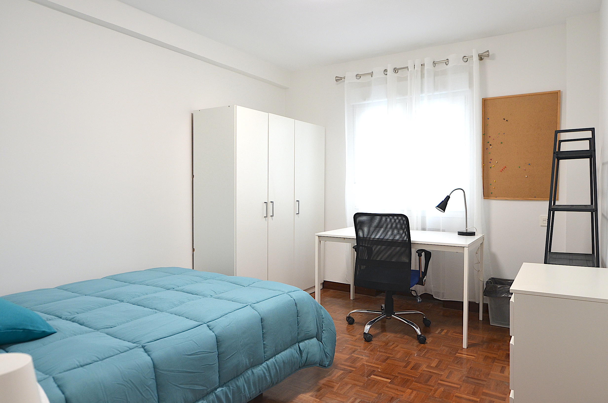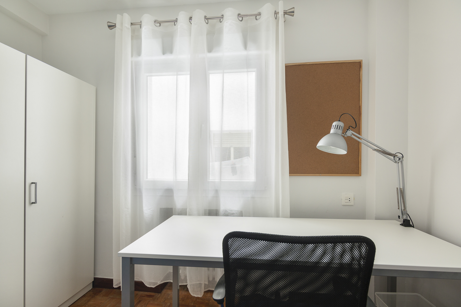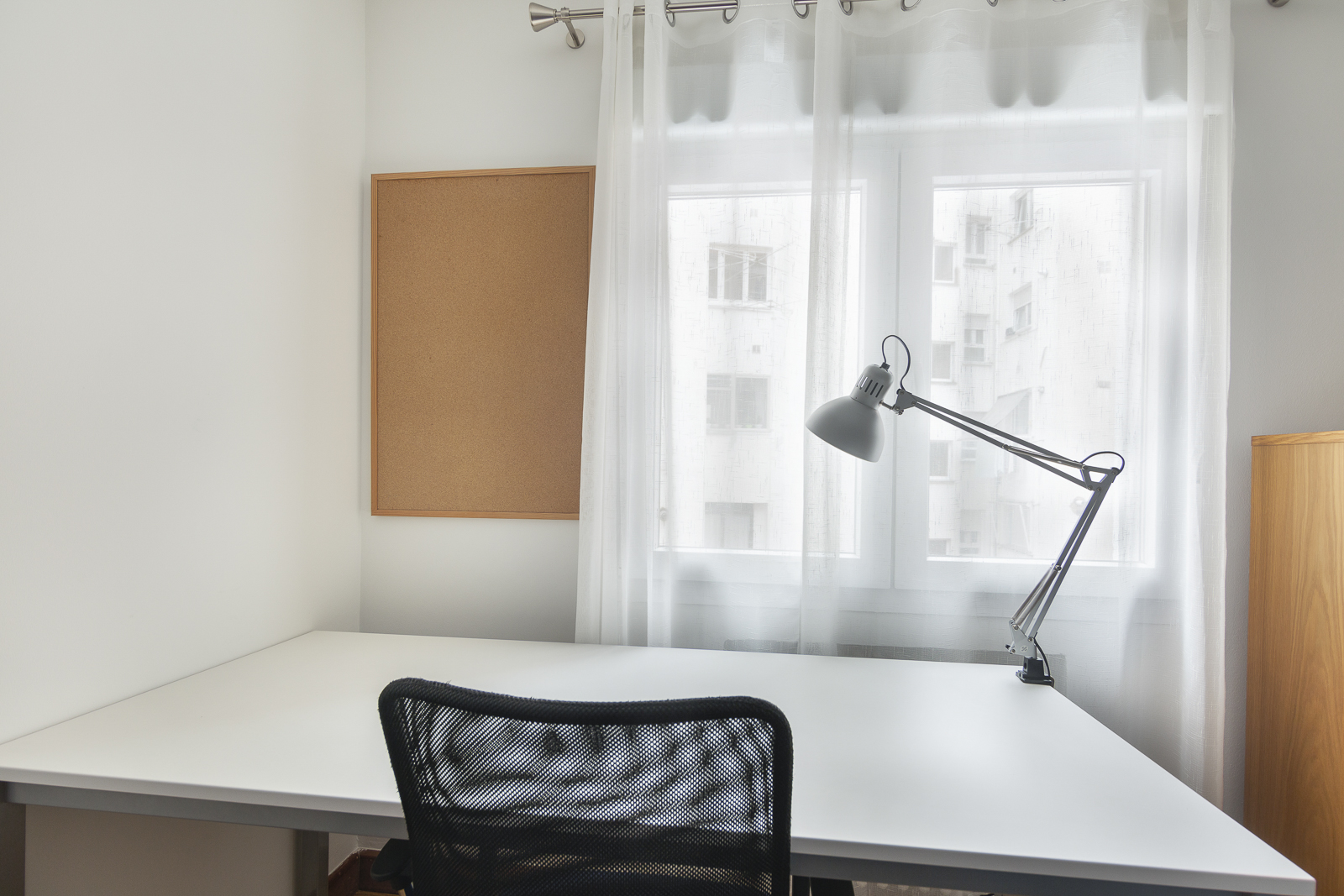Todas las habitaciones disponen de mobiliario perfectamente adaptado al estudio: mesa grande de estudio, silla ergonómica, flexo con bombilla led de gran luminosidad, corcho para apuntes, estantería para almacenaje de libros, y también un armario de tres puertas, una cómoda, mesita, y papelera. Dispone de dos camas dobles de 1,35cm y otra cama individual de 1,05cm. También proporcionamos ropa de cama y un juego de toallas.