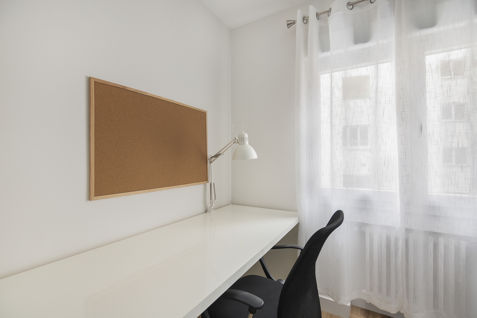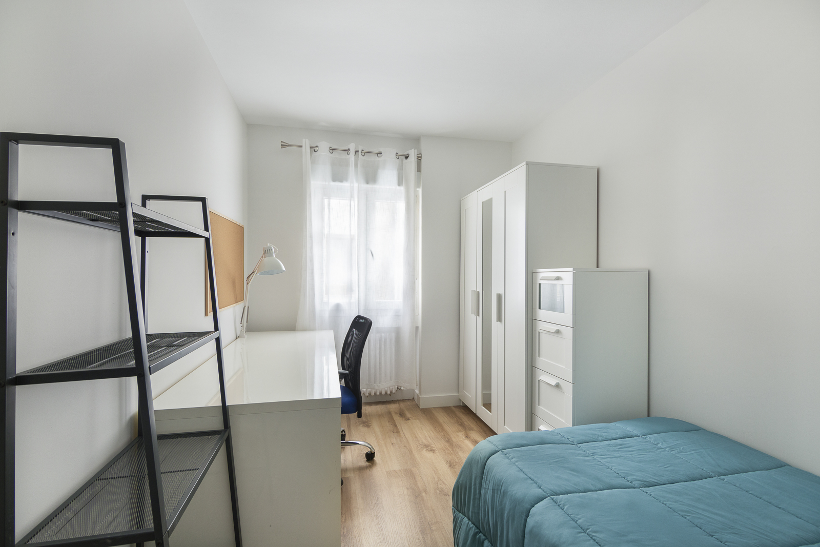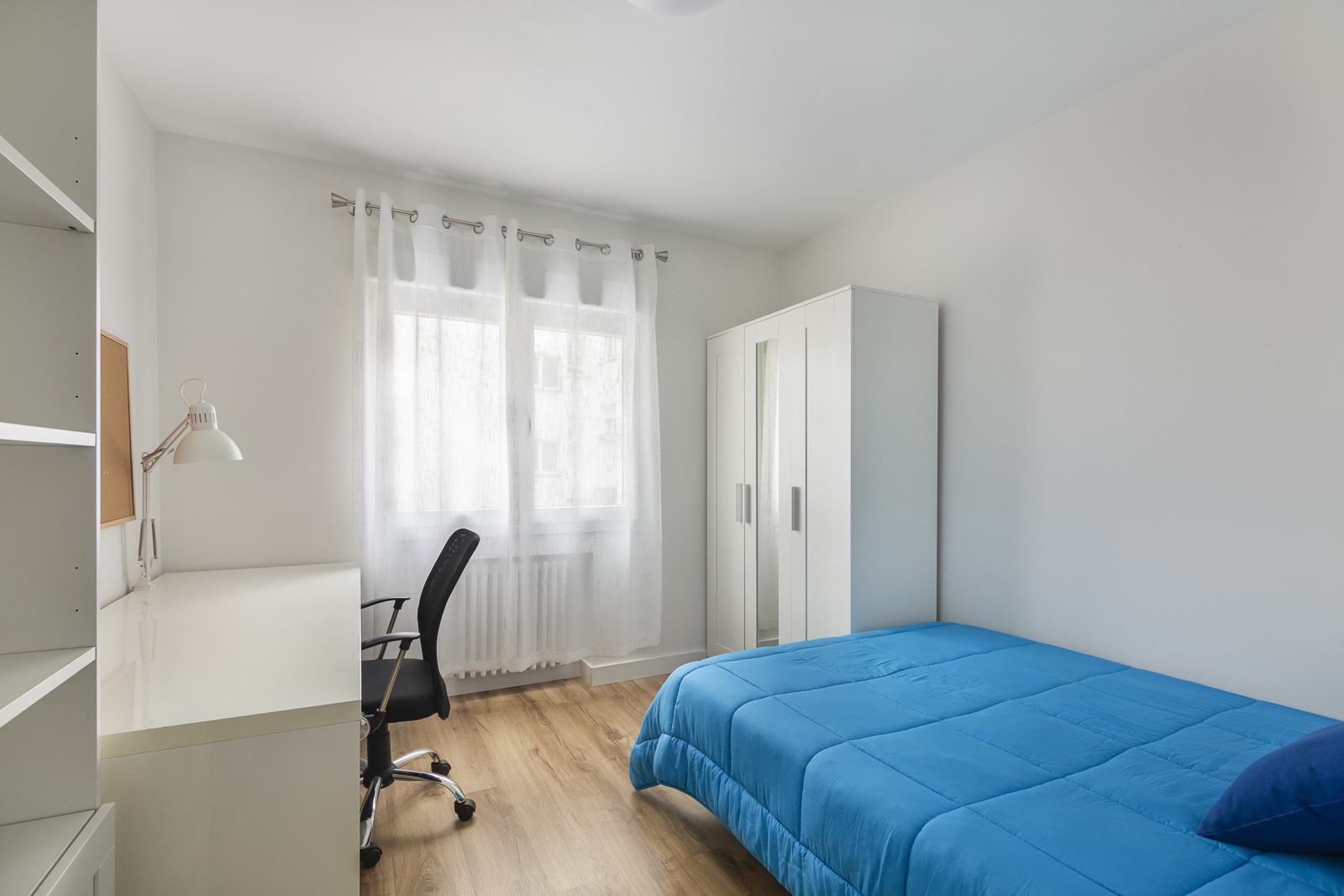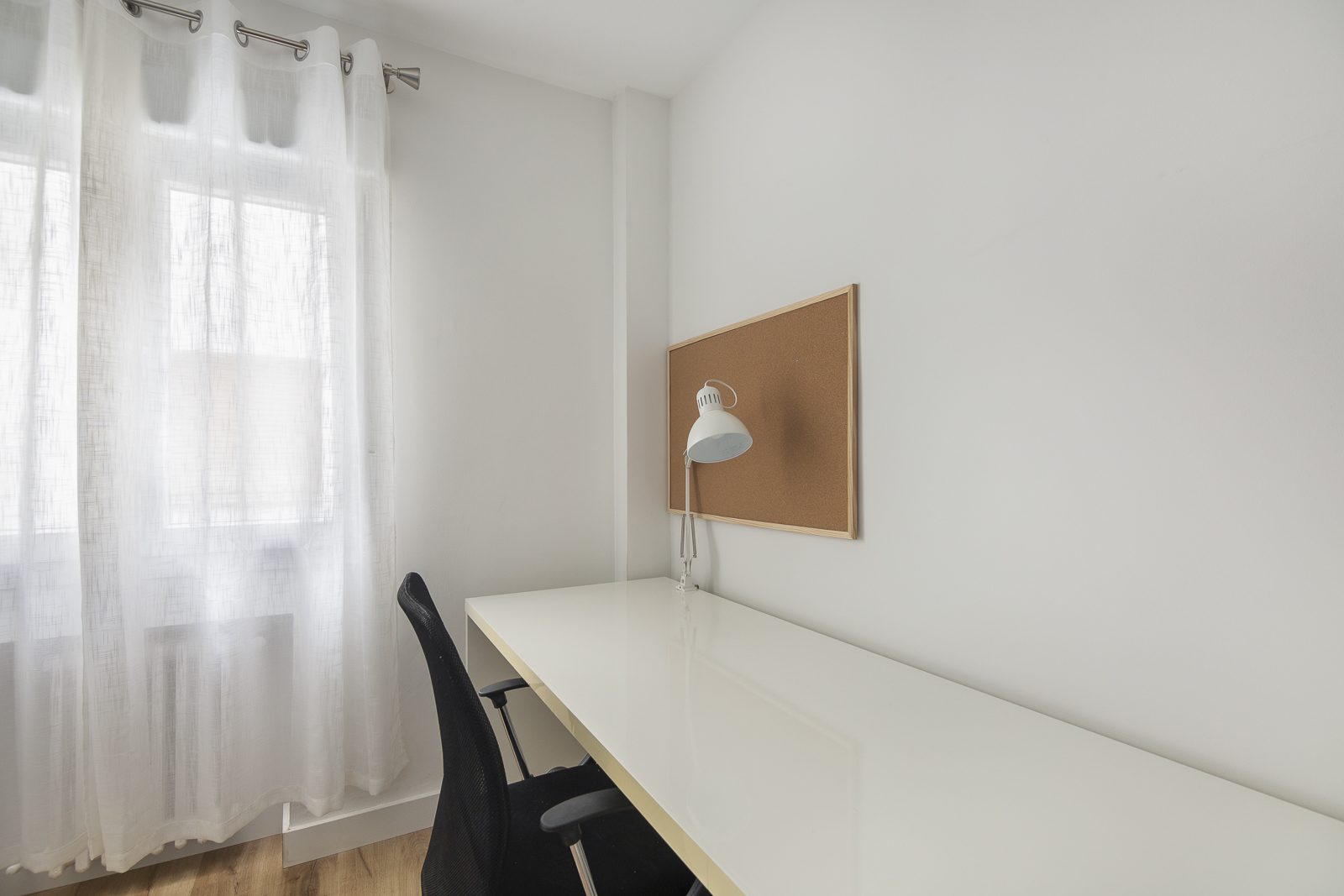 Todas las habitaciones disponen de mobiliario perfectamente adaptado al estudio: mesa grande de estudio, silla ergonómica, flexo con bombilla led de gran luminosidad, corcho para apuntes, estantería para almacenaje de libros, y también un armario de tres puertas, una cómoda, mesita, y papelera. Dispone de dos camas dobles de 1,35cm y una cama individual de 1,05cm. También proporcionamos ropa de cama y un juego de toallas.