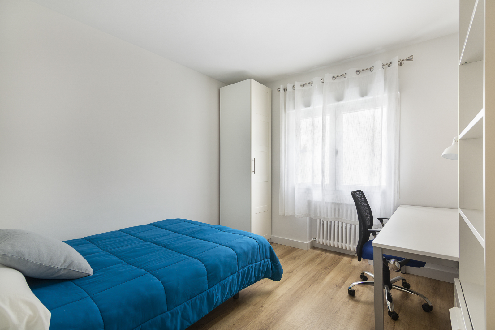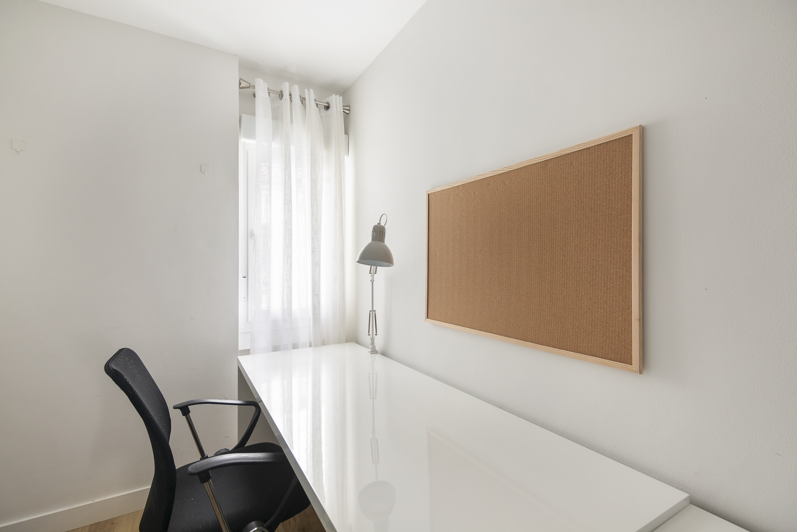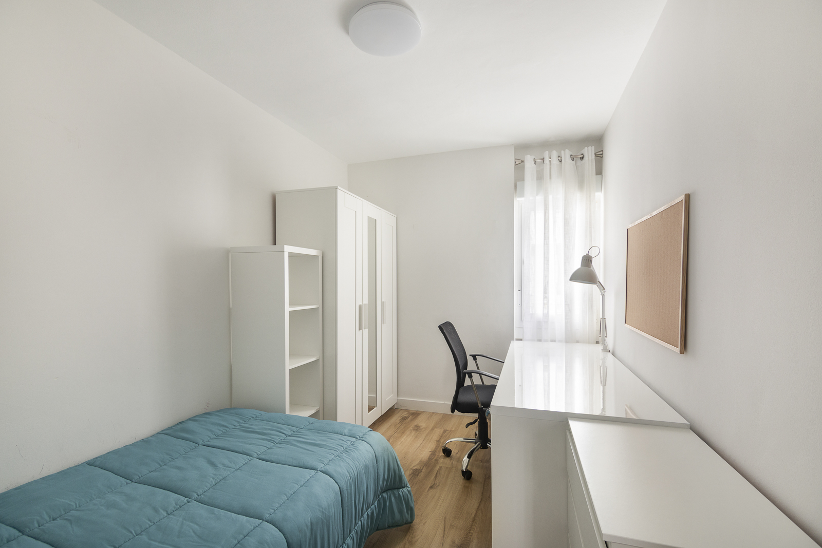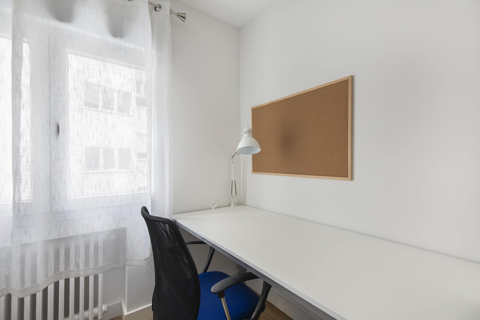 Todas las habitaciones disponen de mobiliario perfectamente adaptado al estudio: mesa grande de estudio, silla ergonómica, flexo con bombilla led de gran luminosidad, corcho para apuntes, estantería para almacenaje de libros, y también un armario de tres puertas, una cómoda, mesita, y papelera. Dispone de dos camas dobles de 1,35cm y una cama individual de 1,05cm. También proporcionamos ropa de cama y un juego de toallas.