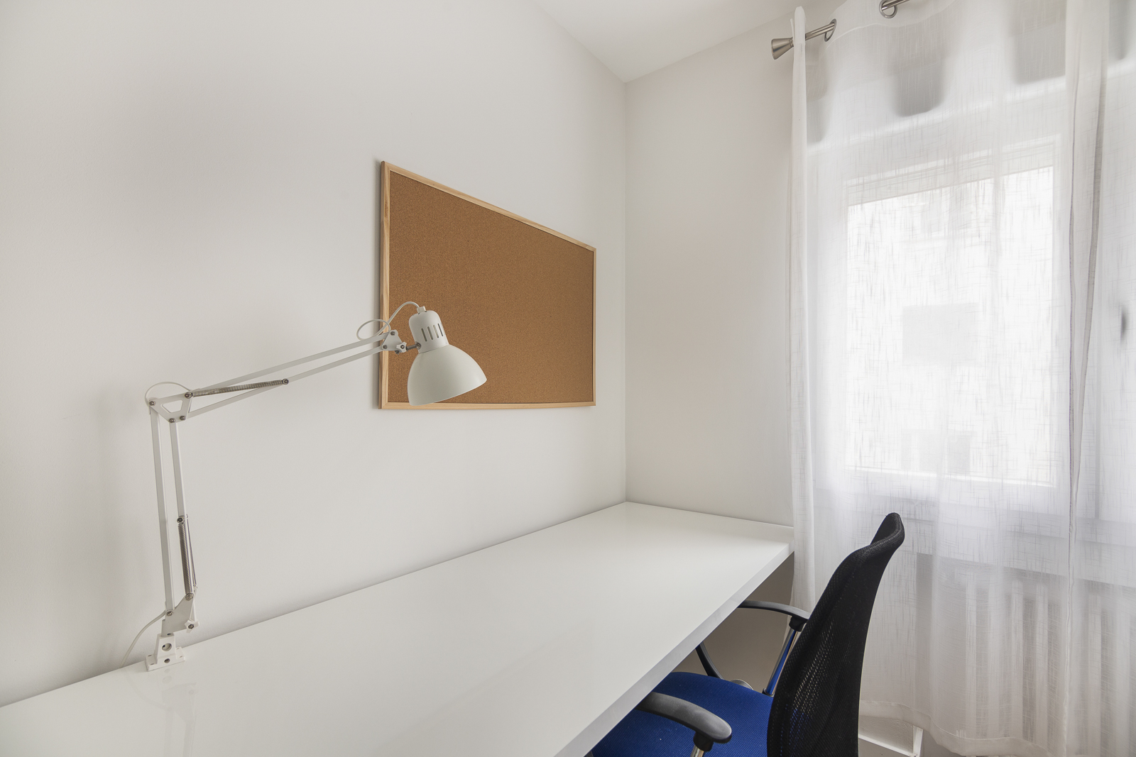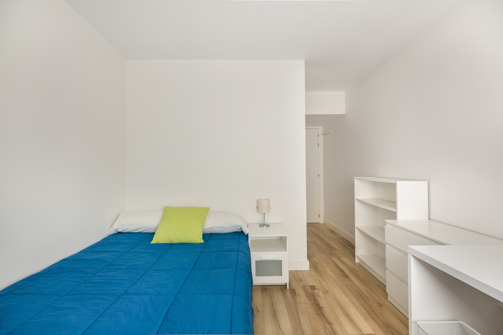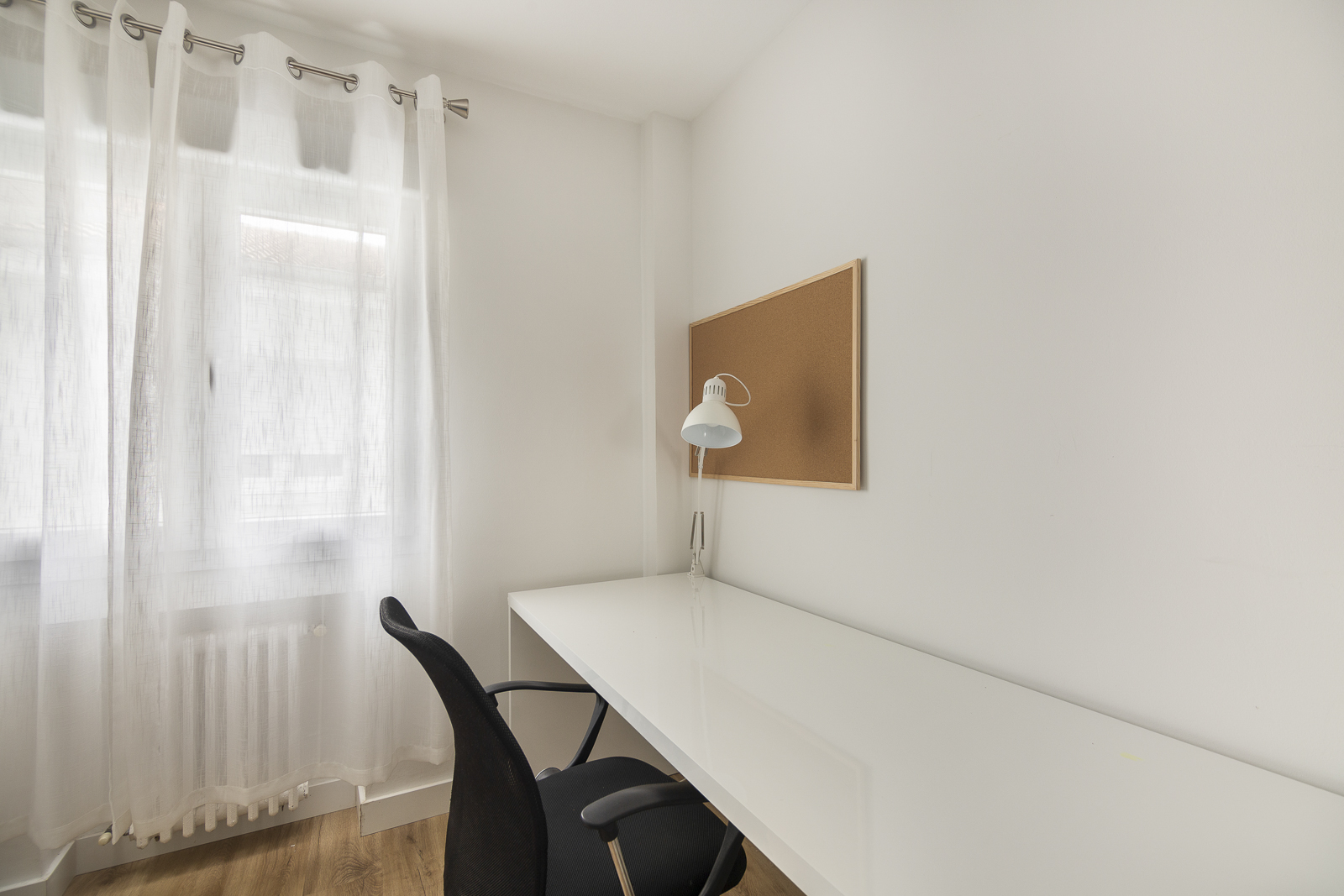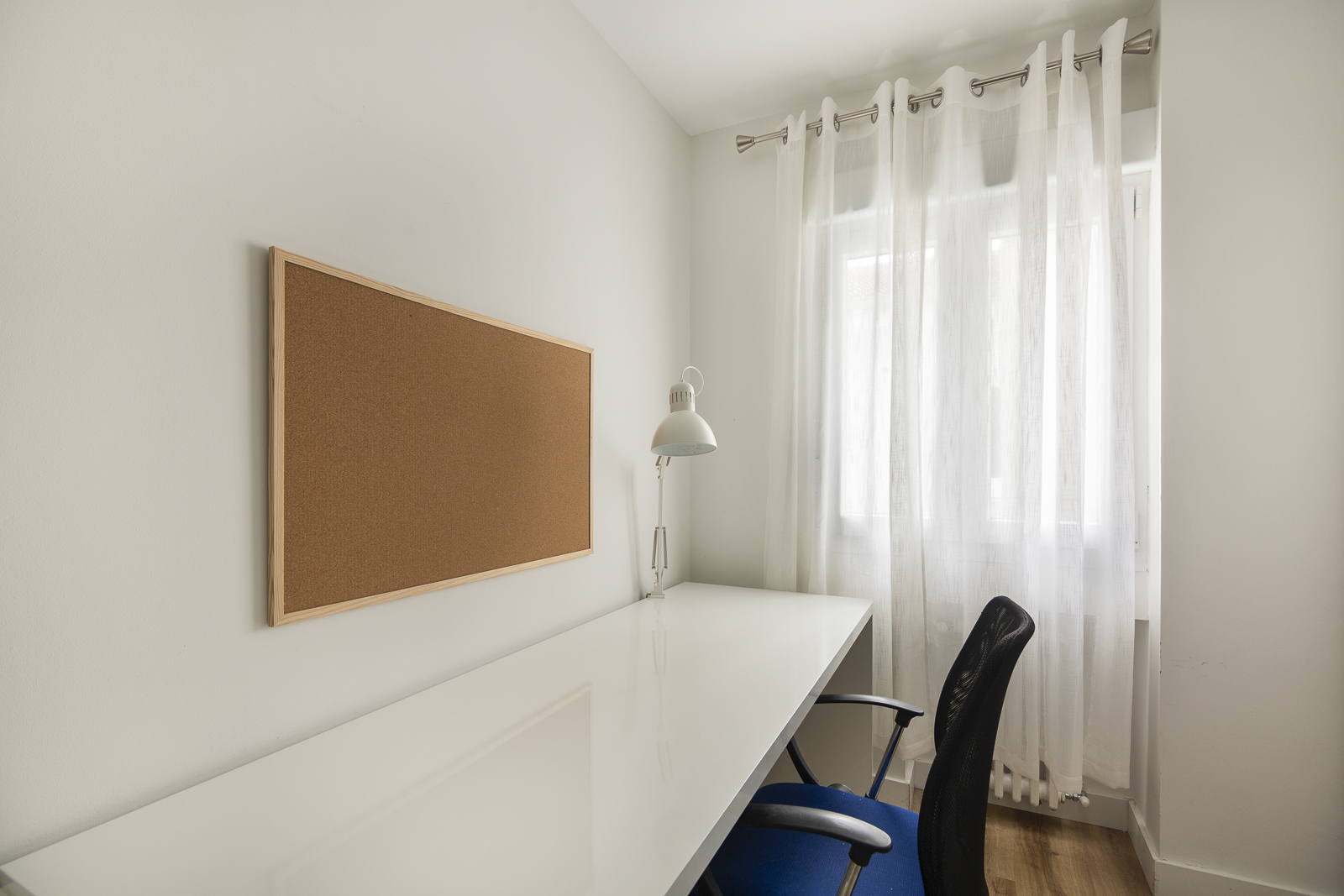 Todas las habitaciones disponen de mobiliario perfectamente adaptado al estudio: mesa grande de estudio, silla ergonómica, flexo con bombilla led de gran luminosidad, corcho para apuntes, estantería para almacenaje de libros, y también un armario de tres puertas, una cómoda, mesita, y papelera. Dispone de dos camas dobles de 1,35cm y una cama individual de 1,05cm. También proporcionamos ropa de cama y un juego de toallas.