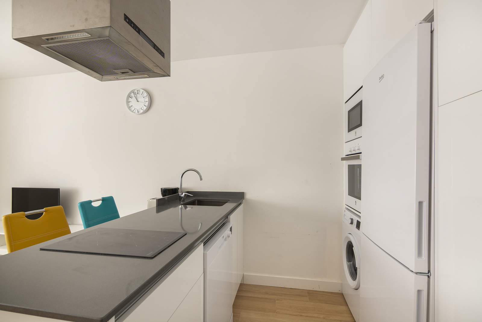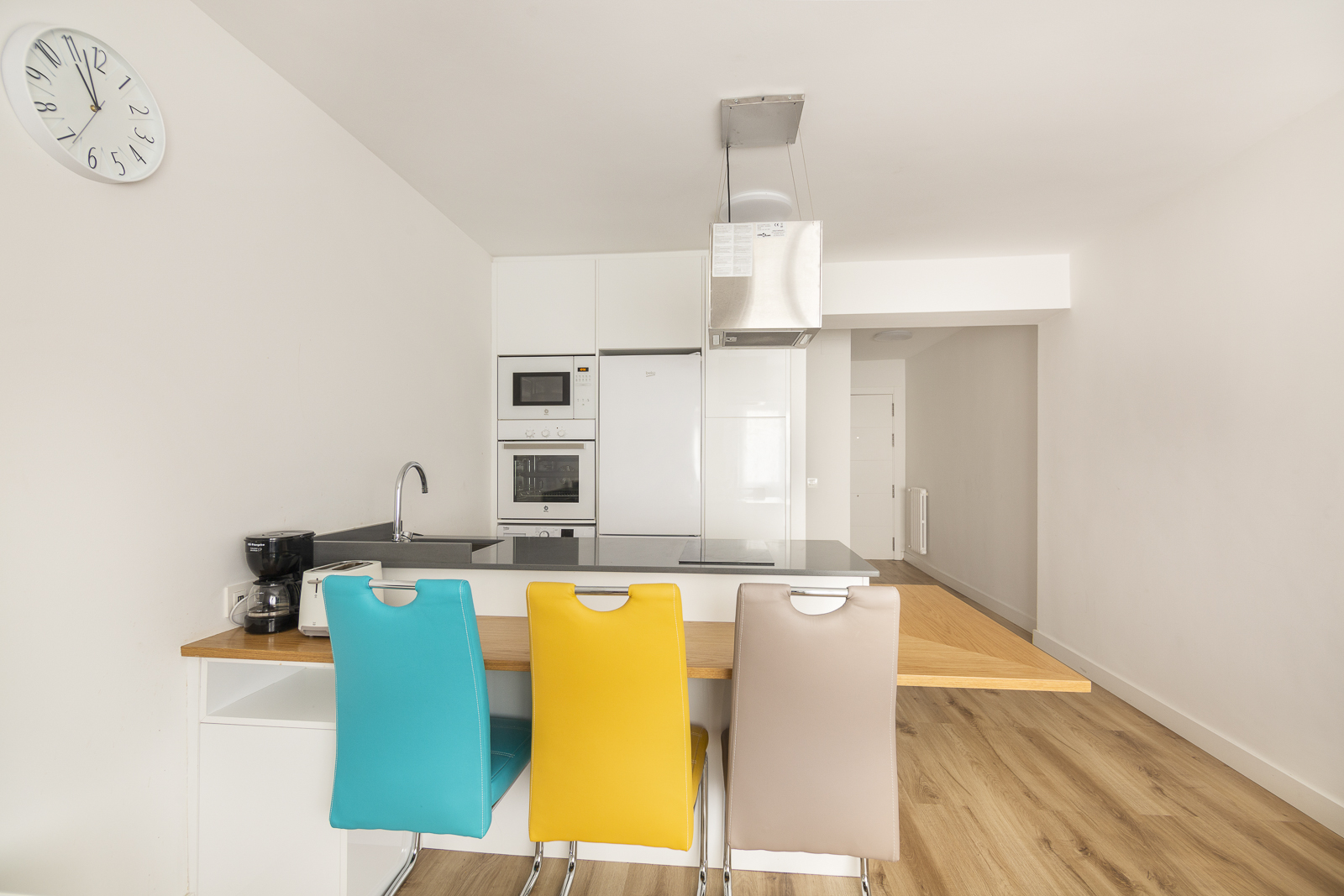 La cocina está equipada con un menaje básico del hogar, y cuenta con nevera, lavavajillas, lavadora, horno, microondas, campana extractora, vitrocerámica digital, cafetera y tostadora. En el salón, una smart tv de pantalla plana para los momentos de relax.