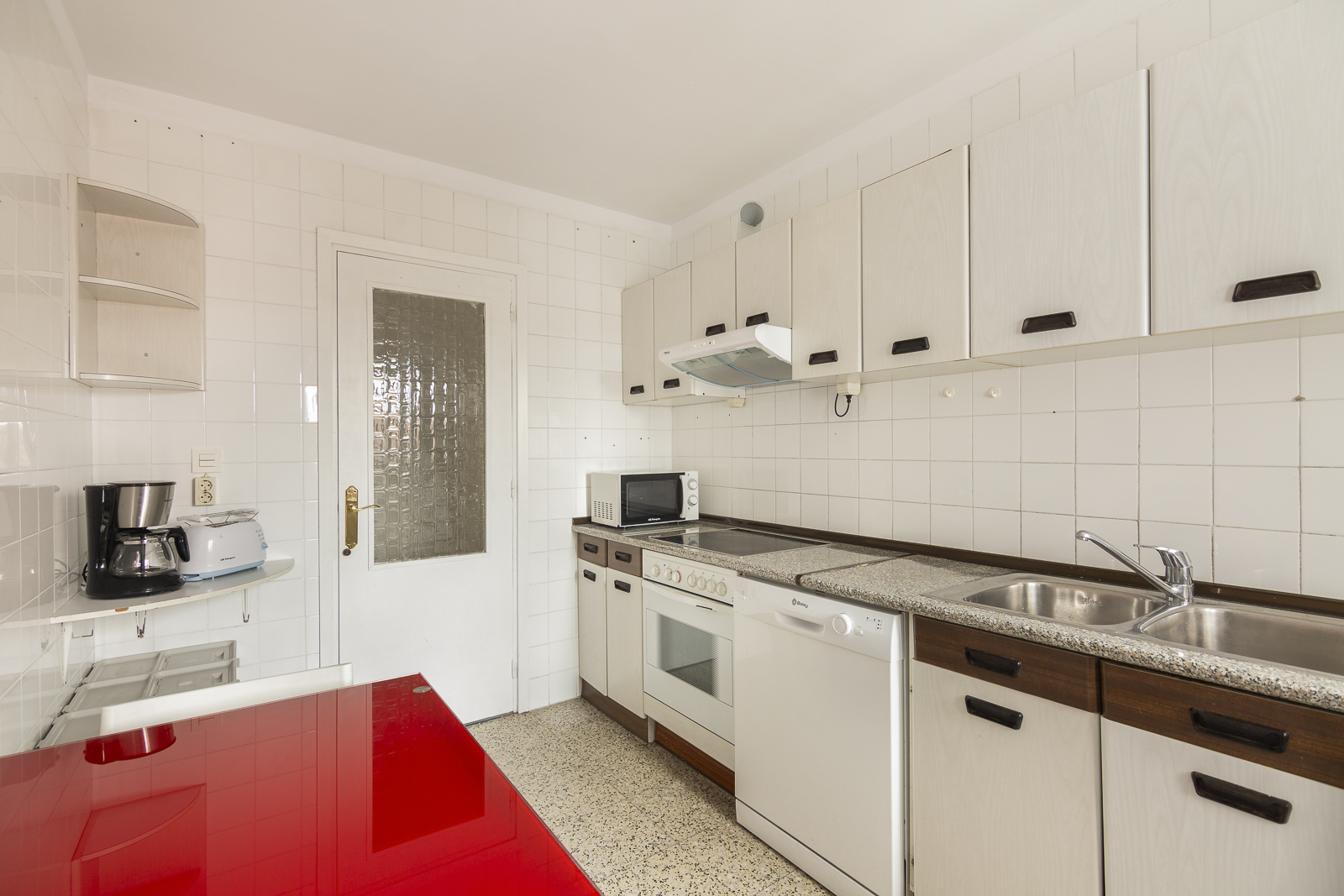 La cocina está equipada con un menaje básico del hogar, y cuenta con nevera, lavavajillas, lavadora, horno, microondas, campana extractora, vitrocerámica digital, cafetera y tostadora. En el salón, una smart tv de pantalla plana para los momentos de relax.