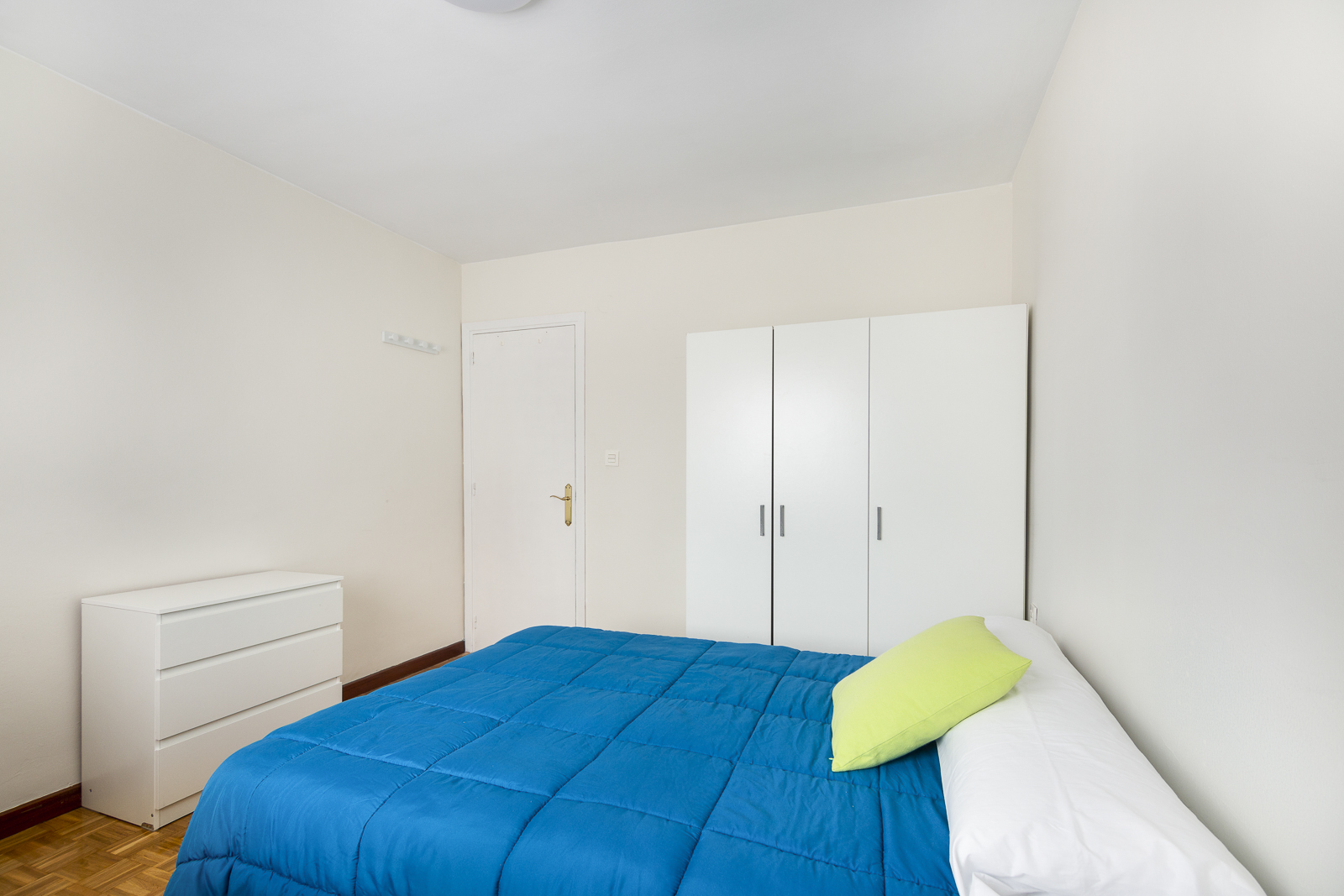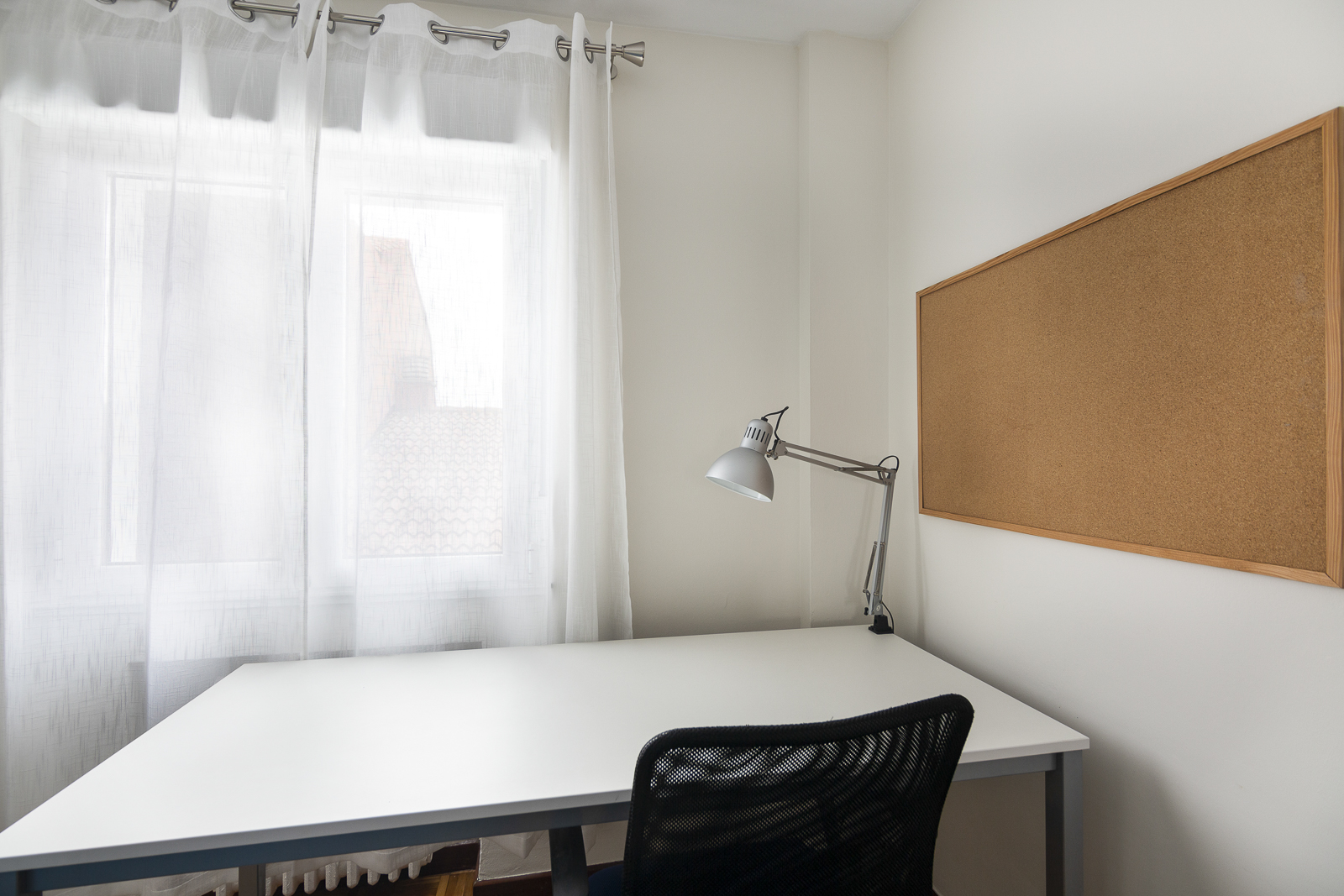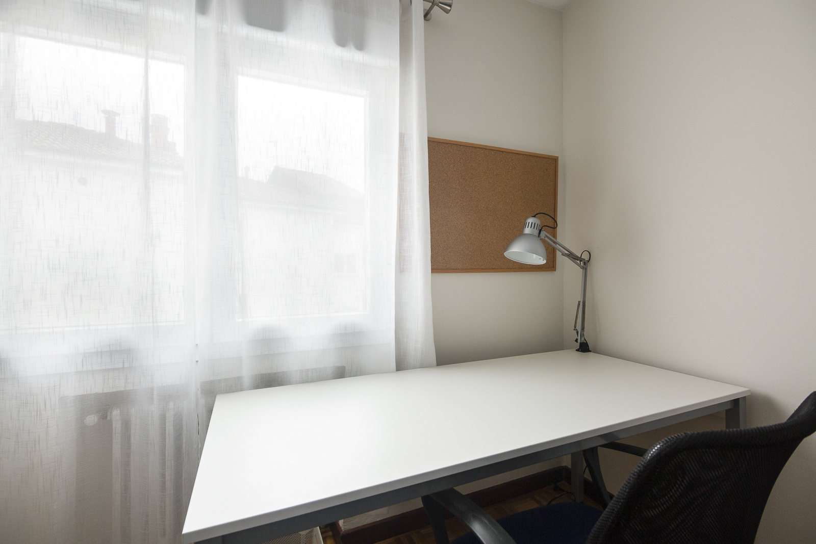 Las habitaciones disponen de mobiliario perfectamente adaptado al estudio: mesa grande de estudio, silla ergonómica, flexo con bombilla led de gran luminosidad, corcho para apuntes, estantería para almacenaje de libros, y también un armario de tres puertas, una cómoda, mesita, y papelera. Cada habitación cuenta con una cama doble de 1,35cm. También proporcionamos ropa de cama y un juego de toallas.